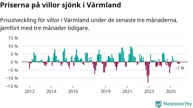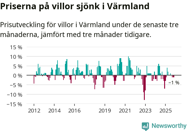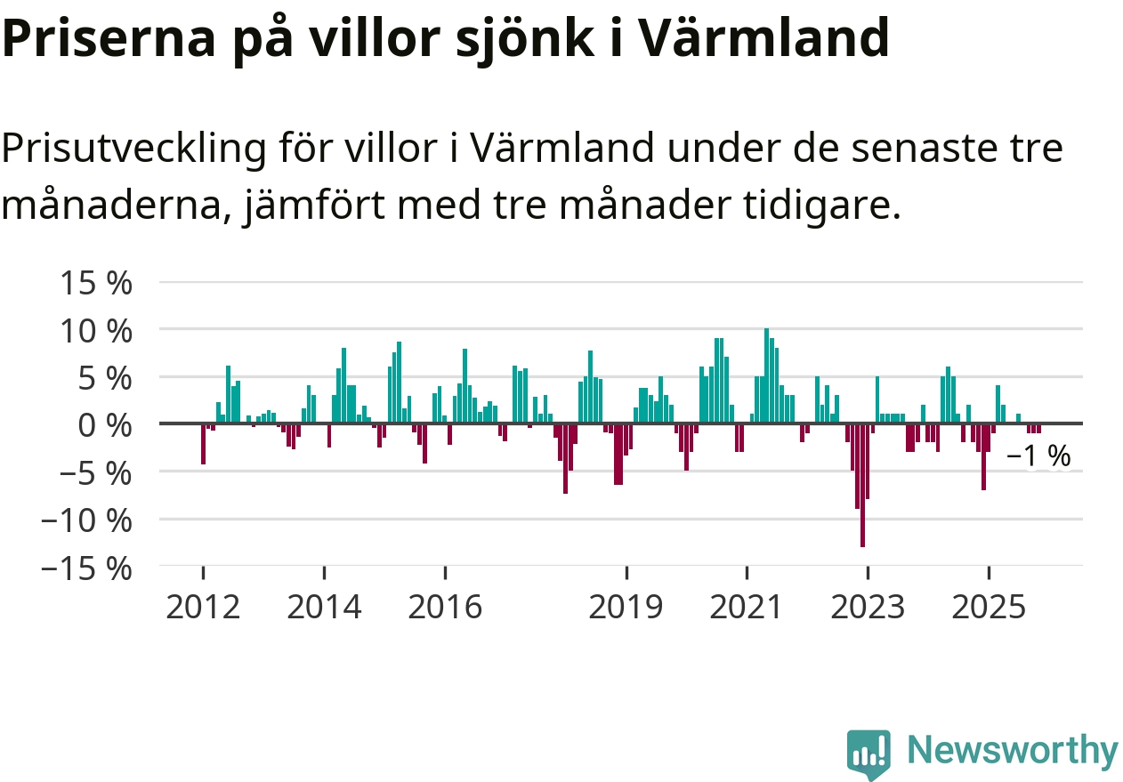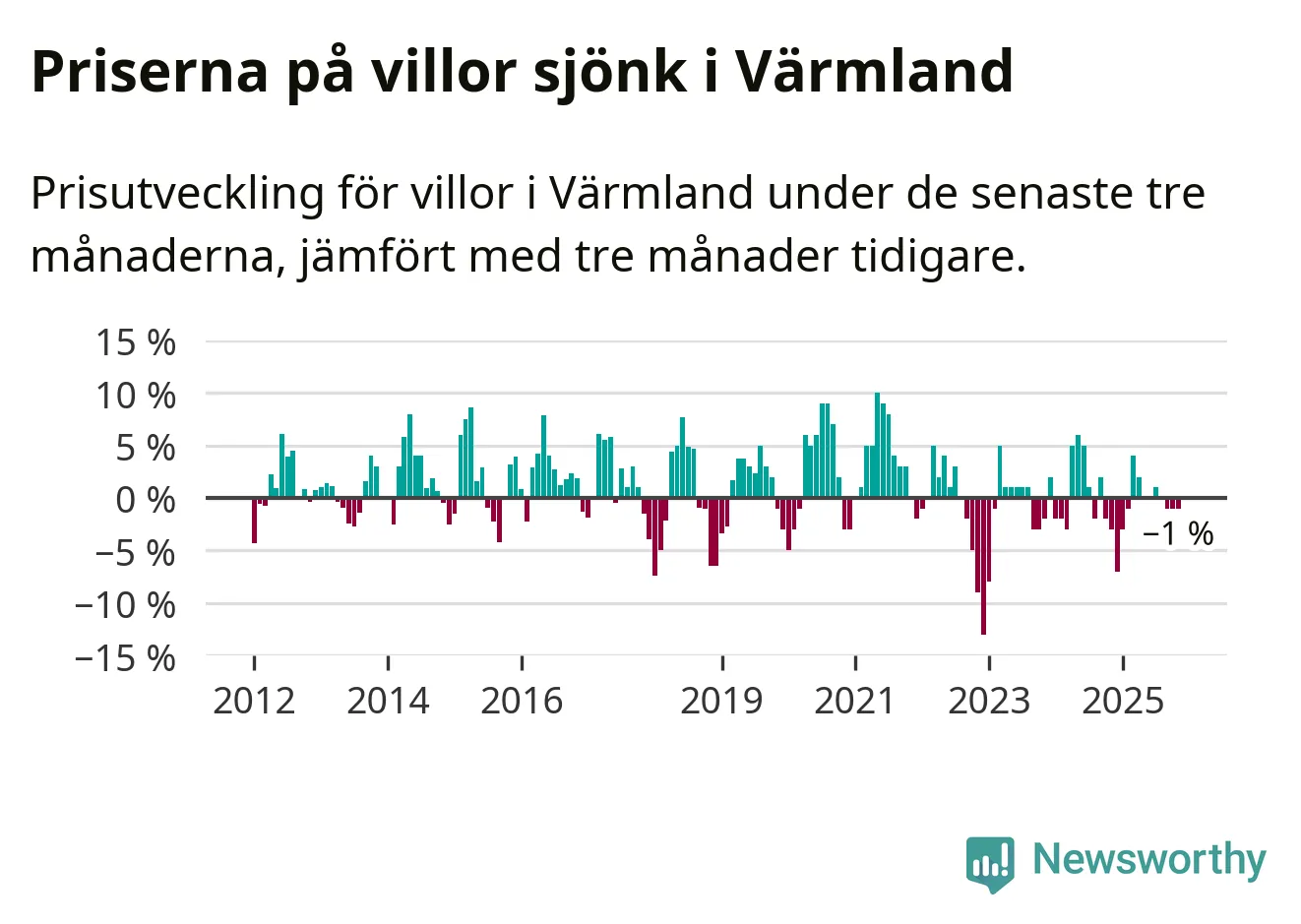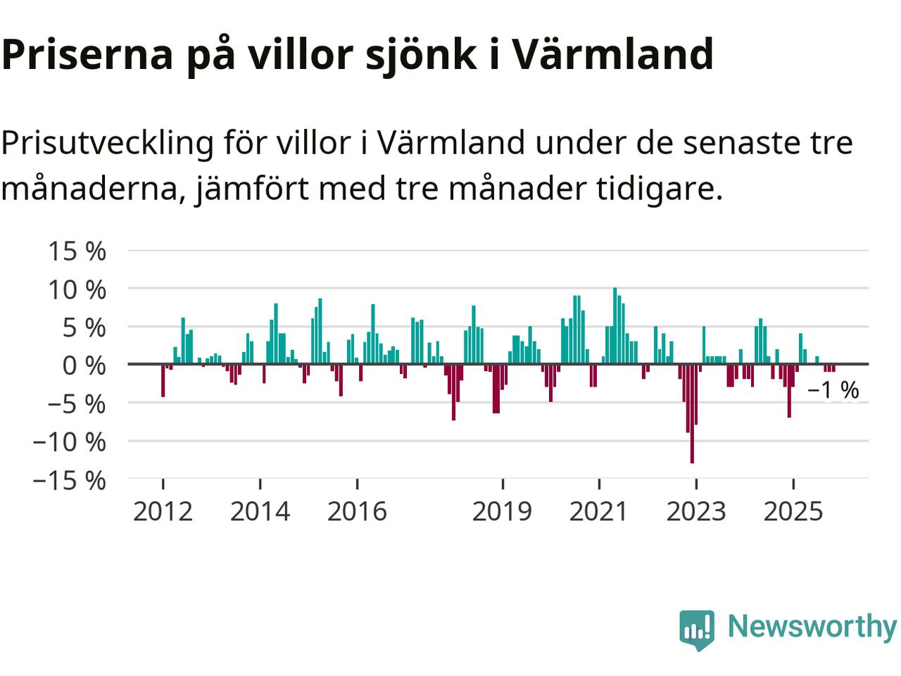 Villapriserna har gått ner i Värmlands län. Medelpriset på försäljningarna under de senaste tre månaderna visar på en nedgång med 1 procent.