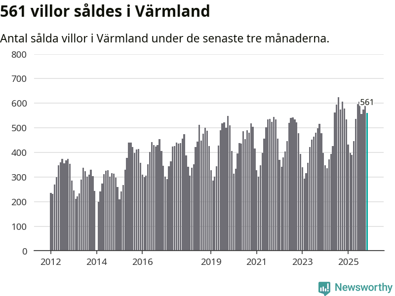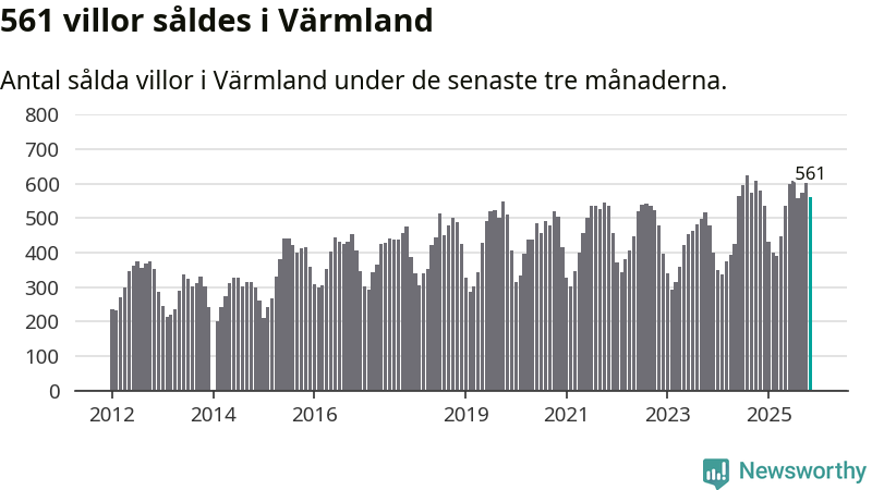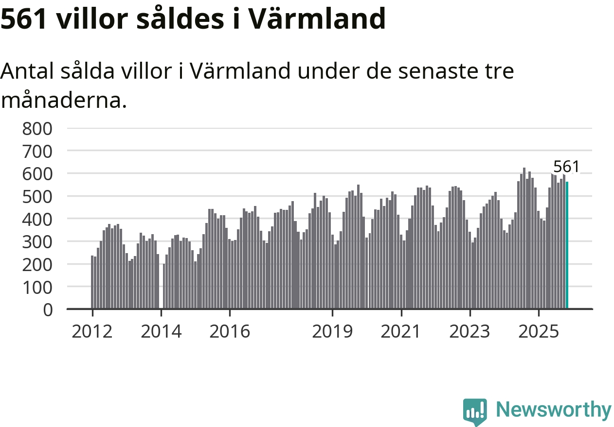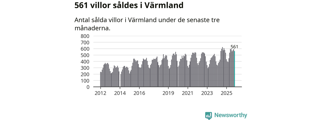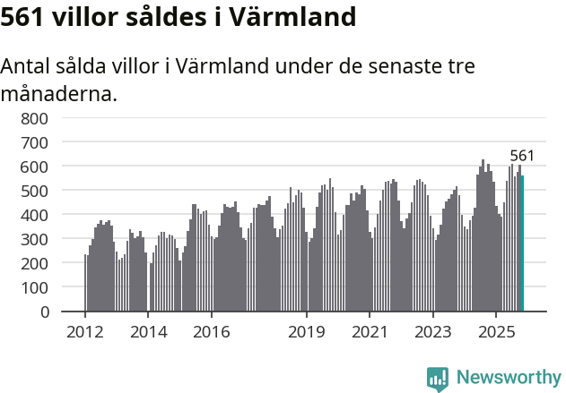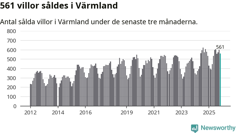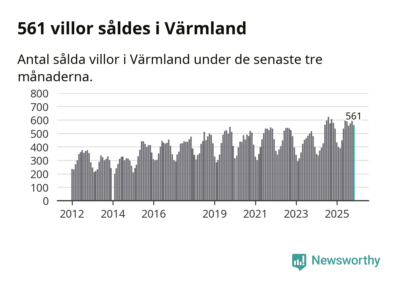 Sammanlagt såldes 561 villor i Värmlands län mellan september och november till ett genomsnittligt pris på 2,3 miljoner kronor. I fjol gjordes 578 affärer vid den här tiden på året.