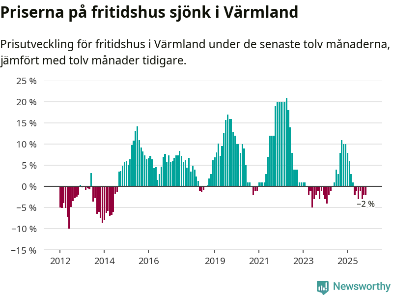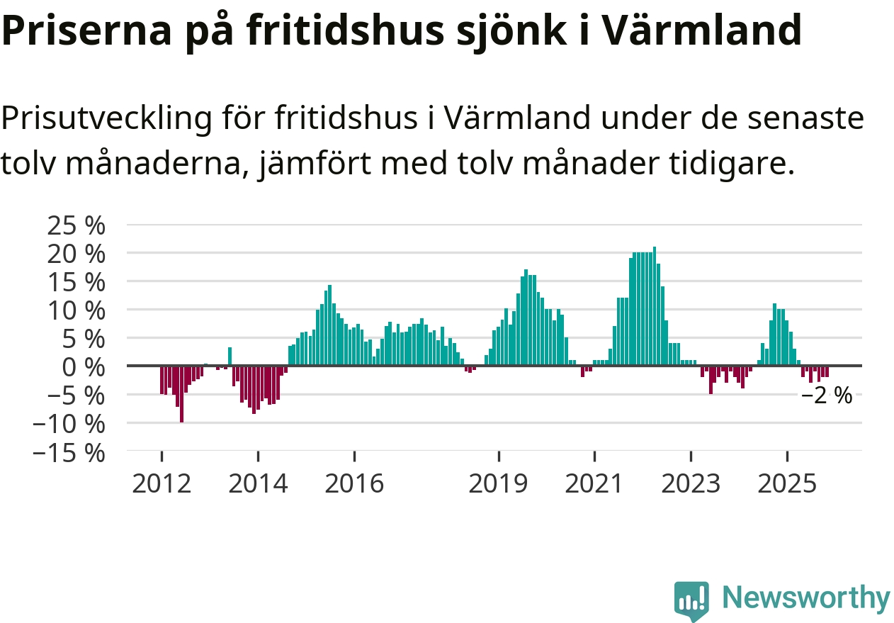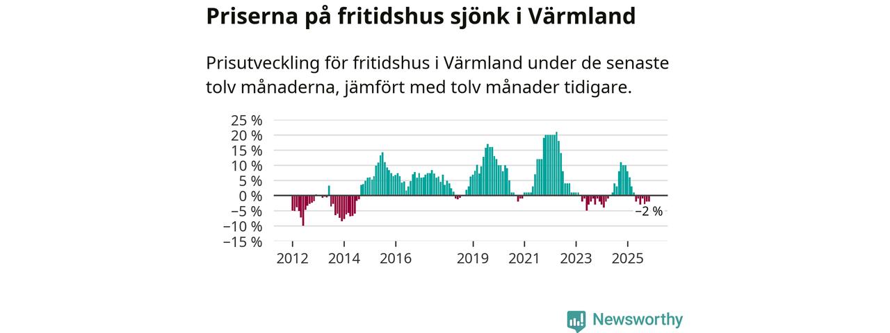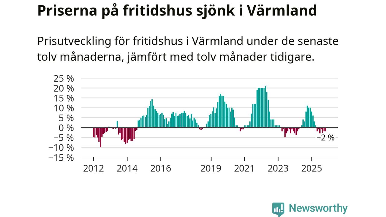 Priserna på fritidshus har gått ner i Värmlands län. Medelpriset på försäljningarna under de senaste tolv månaderna visar på en nedgång med 2 procent.