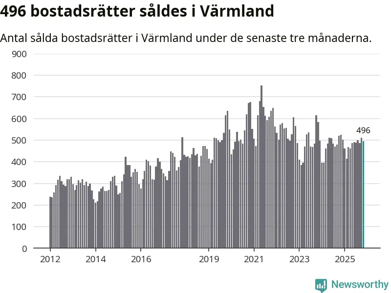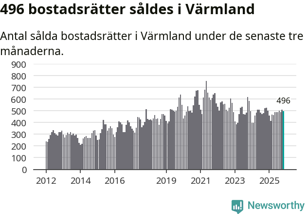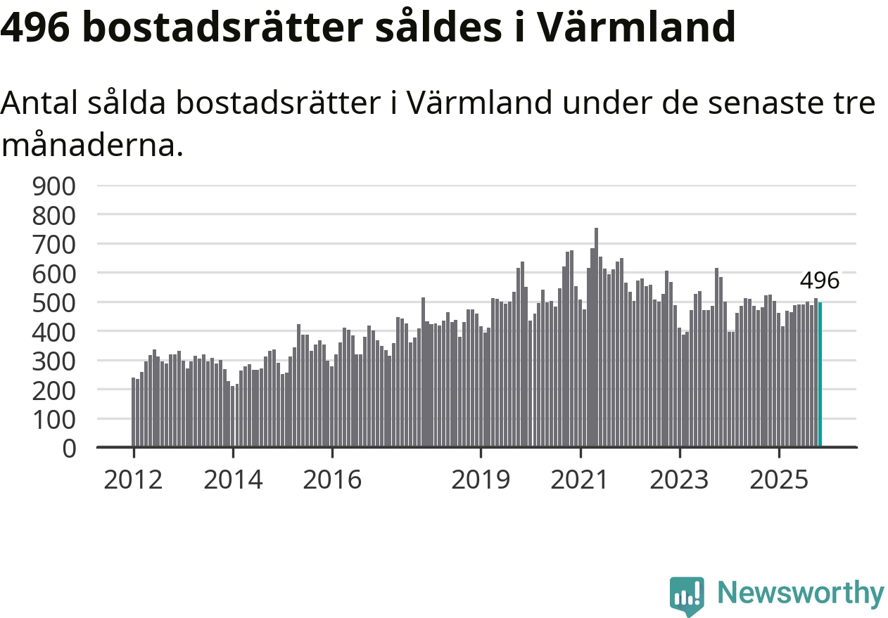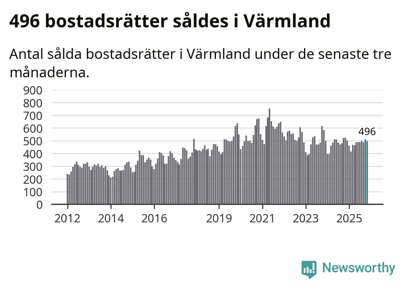 Sammanlagt såldes 496 bostadsrätter i Värmlands län mellan september och november till ett genomsnittligt pris på 1,5 miljoner kronor. I fjol gjordes 524 affärer vid den här tiden på året.