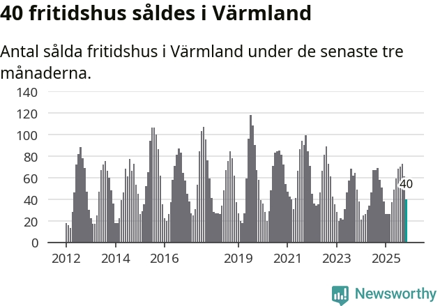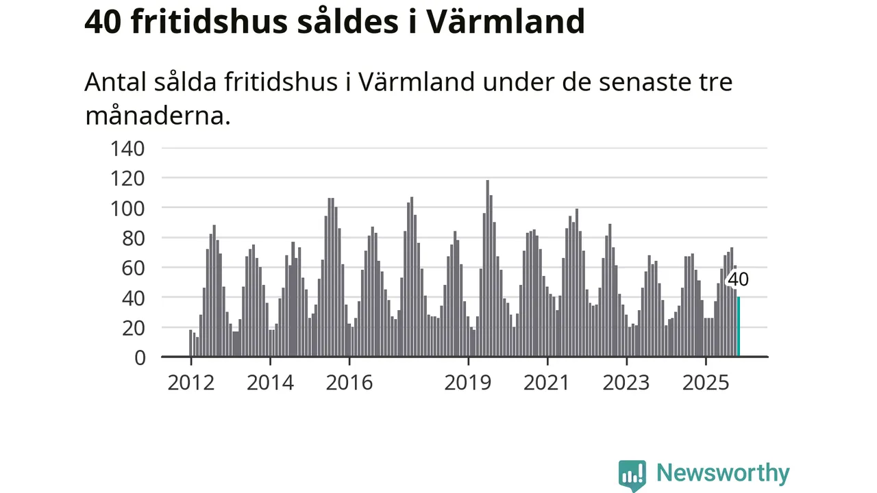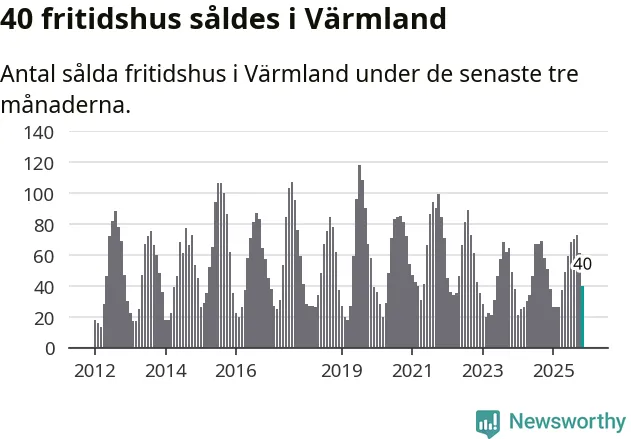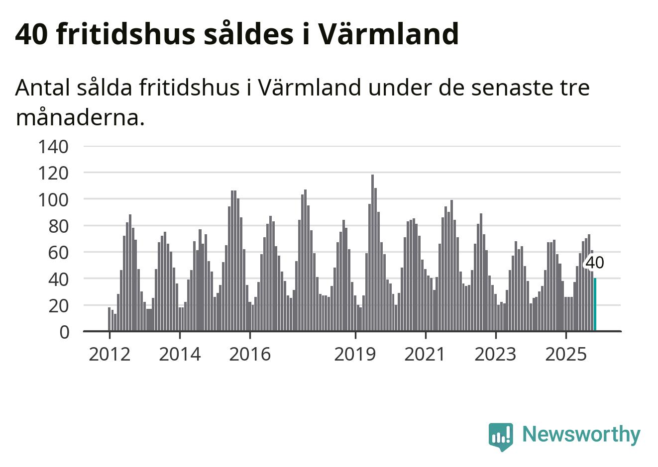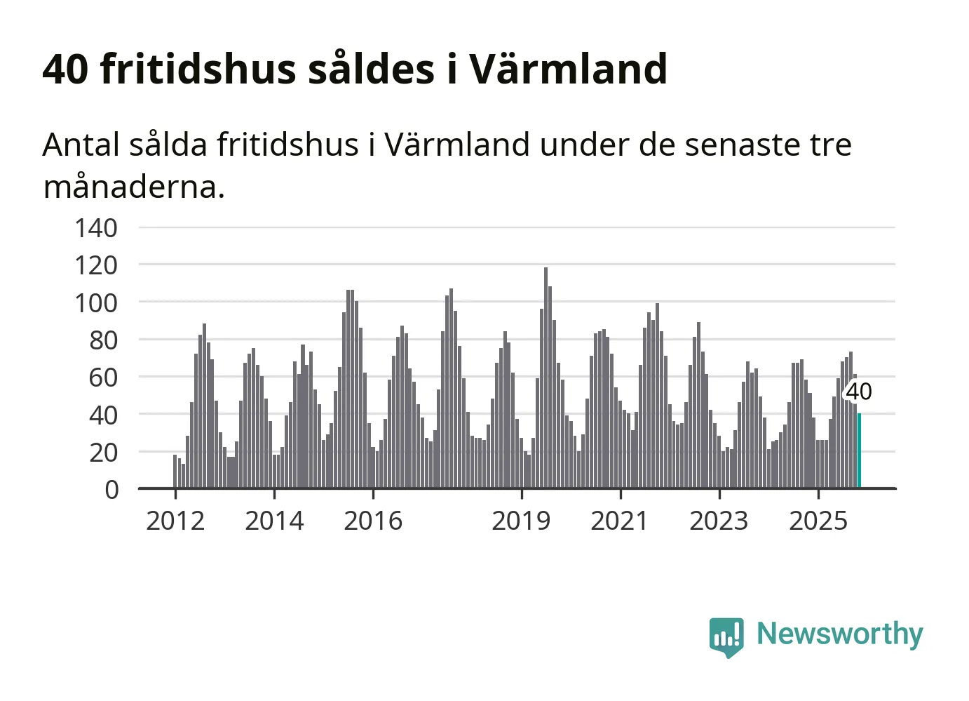 Sammanlagt såldes 40 fritidshus i Värmlands län mellan september och november till ett genomsnittligt pris på 2,2 miljoner kronor. I fjol gjordes 51 affärer vid den här tiden på året.