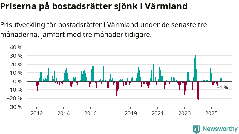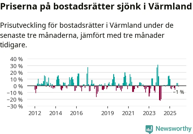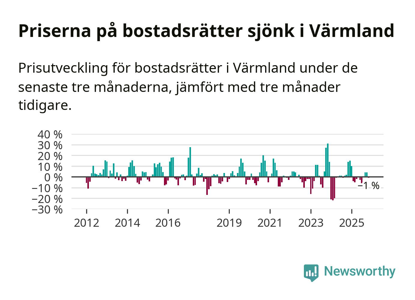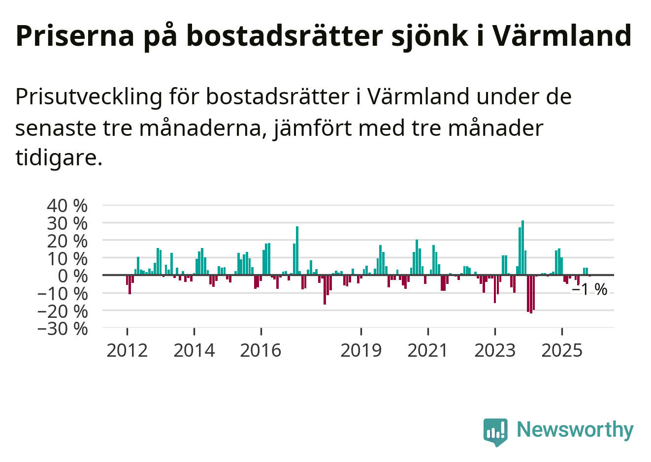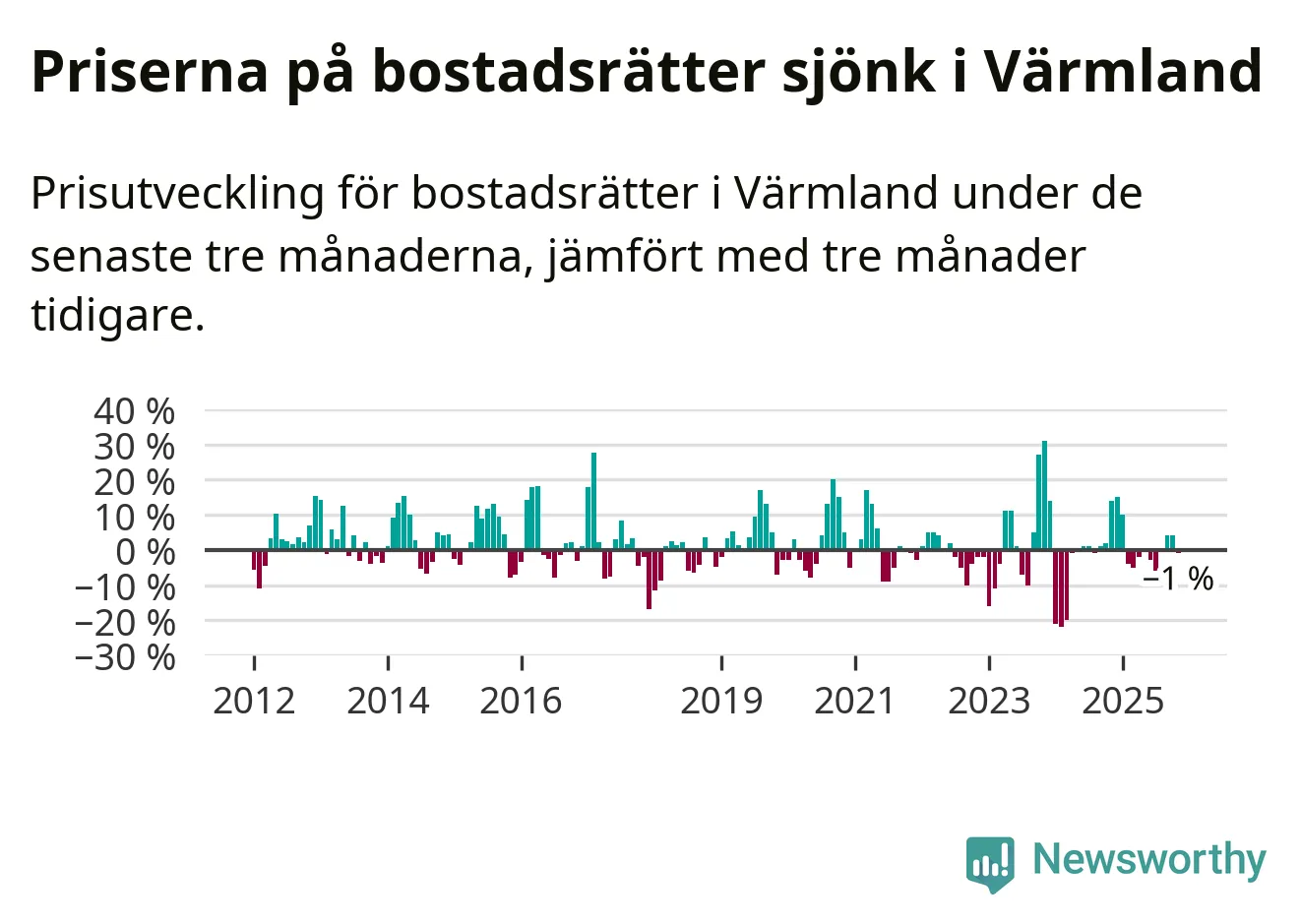 Priserna på bostadsrätter har gått ner i Värmlands län. Medelpriset på försäljningarna under de senaste tre månaderna visar på en nedgång med 1 procent.