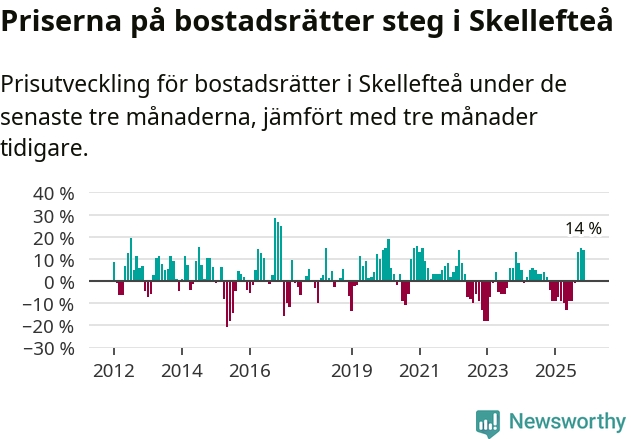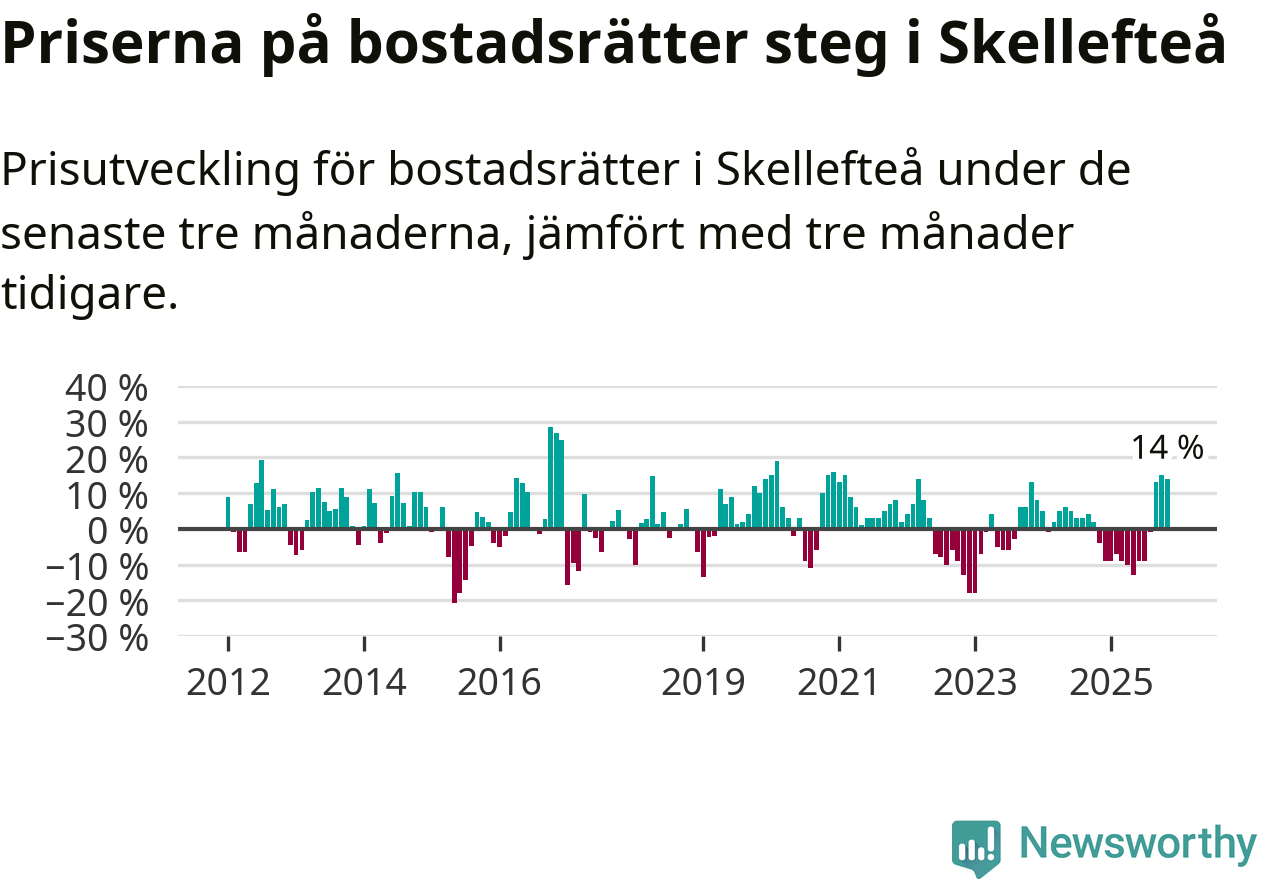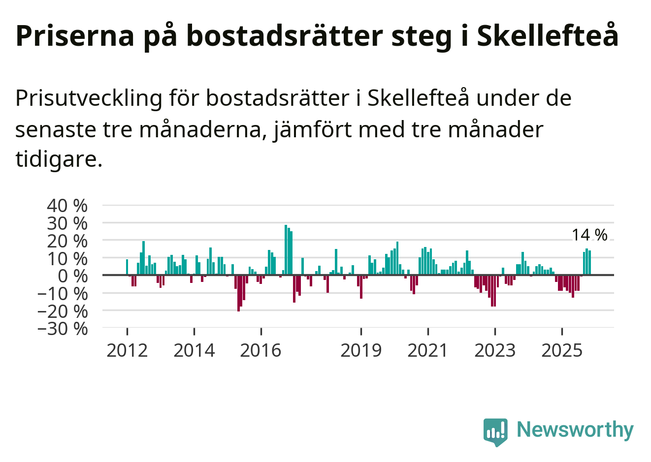 Priserna på bostadsrätter steg mellan september och november med 14 procent i Skellefteå kommun. Det är en betydande uppgång jämfört med det gångna året då priserna i snitt sjunkit med 3 procent.