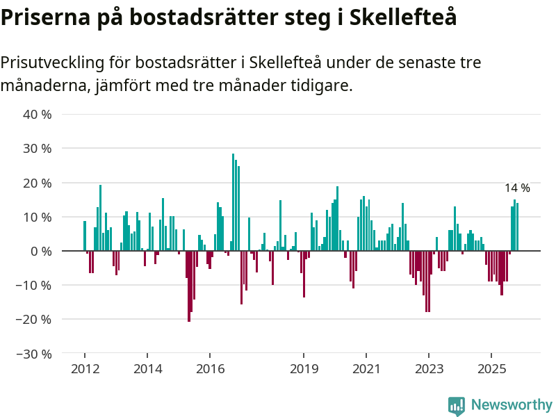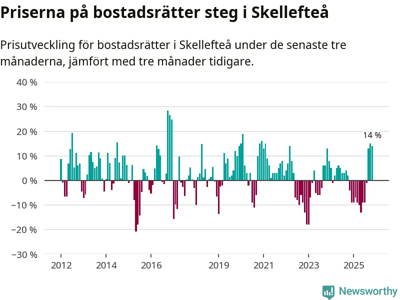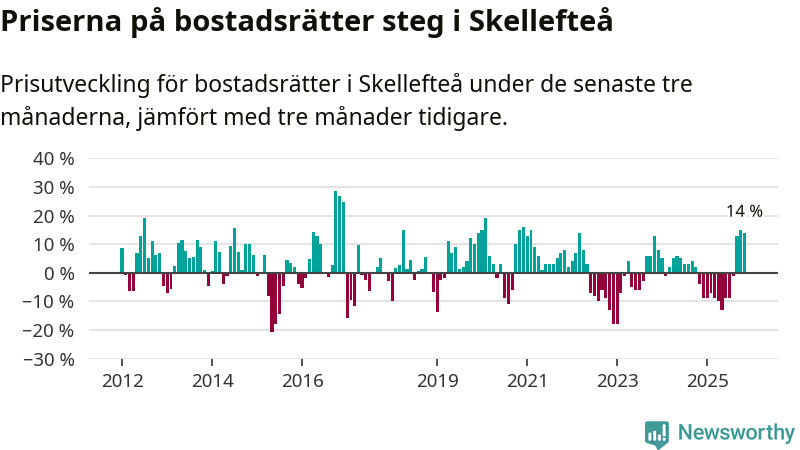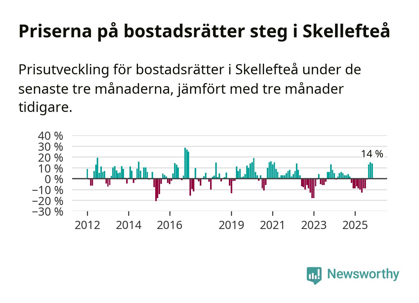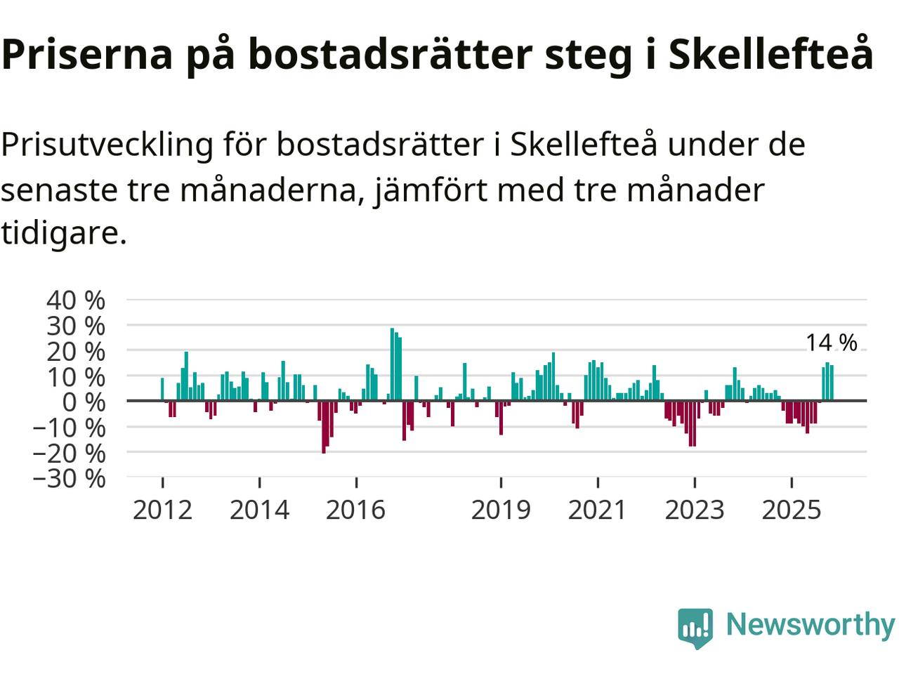 Priserna på bostadsrätter steg mellan september och november med 14 procent i Skellefteå kommun. Det är en betydande uppgång jämfört med det gångna året då priserna i snitt sjunkit med 3 procent.