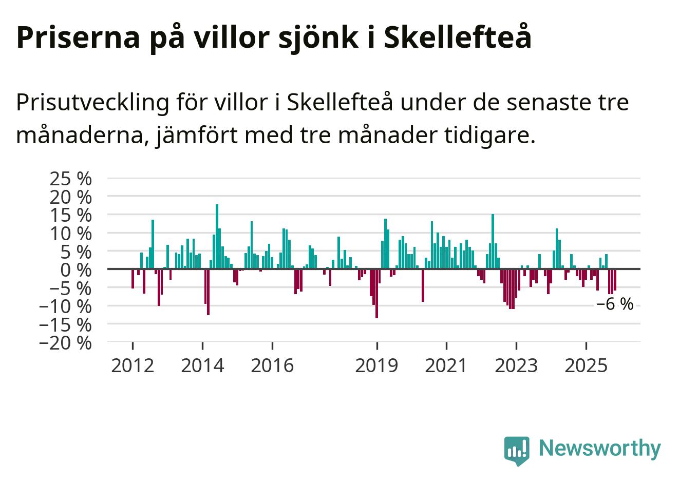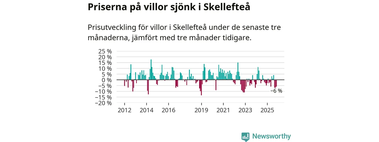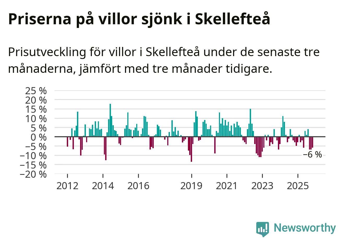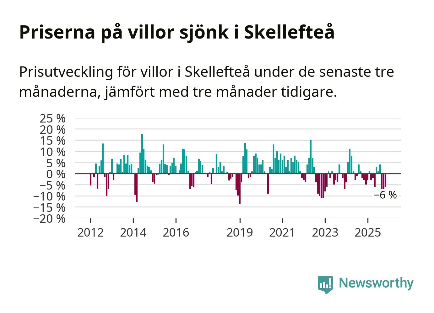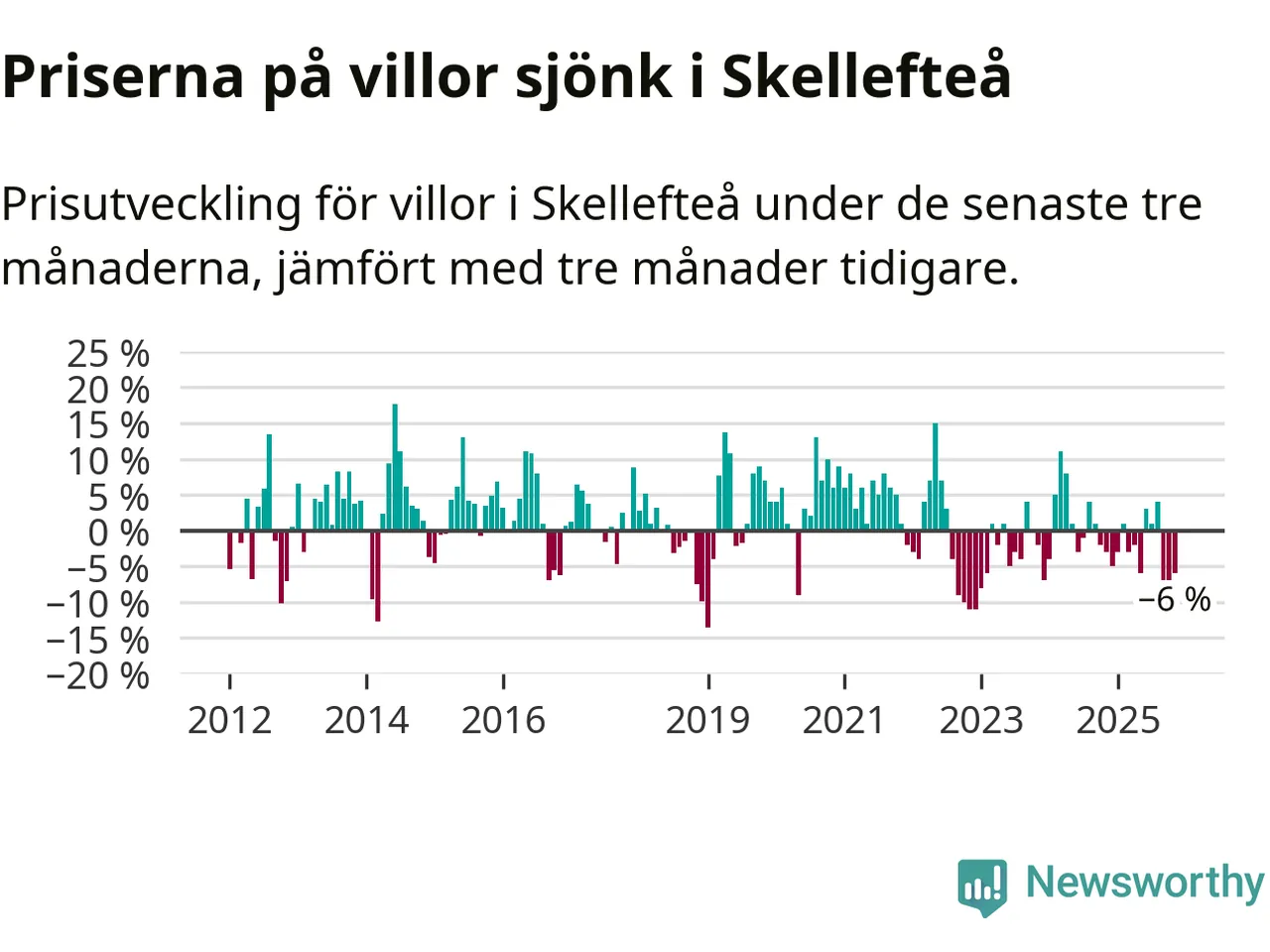 Villapriserna har gått ner i Skellefteå kommun. Medelpriset på försäljningarna under de senaste tre månaderna visar på en nedgång med 6 procent.