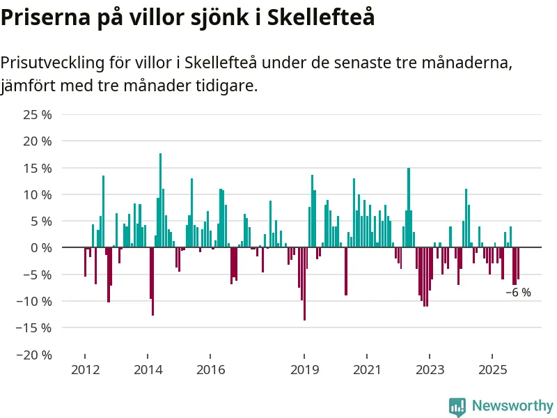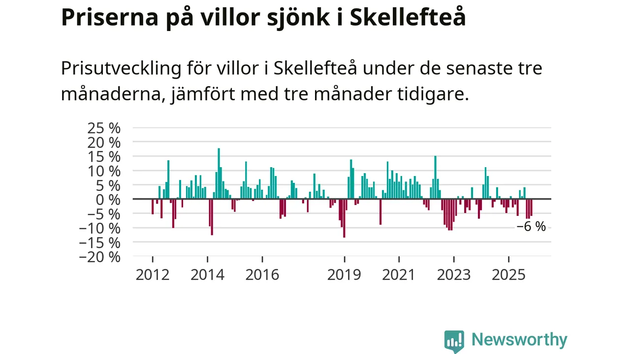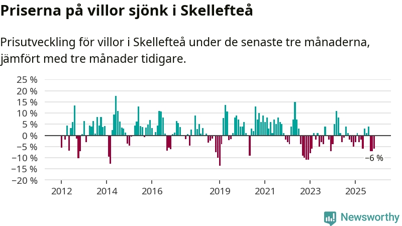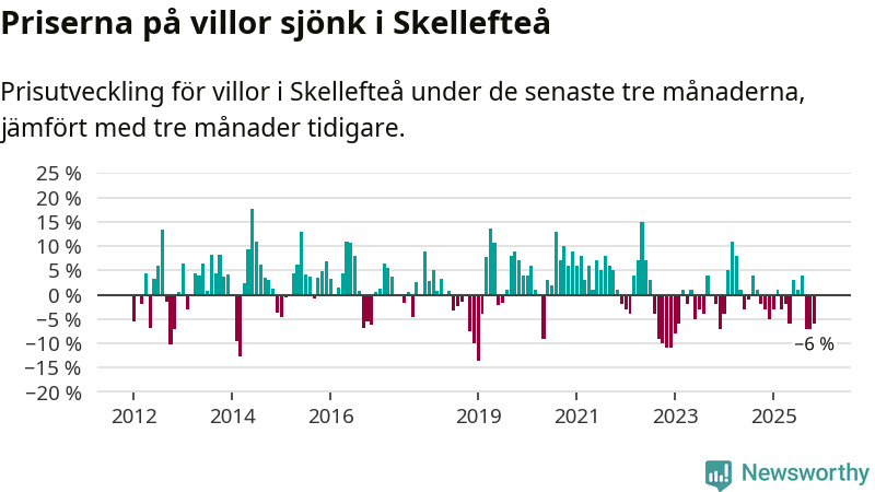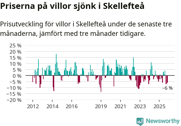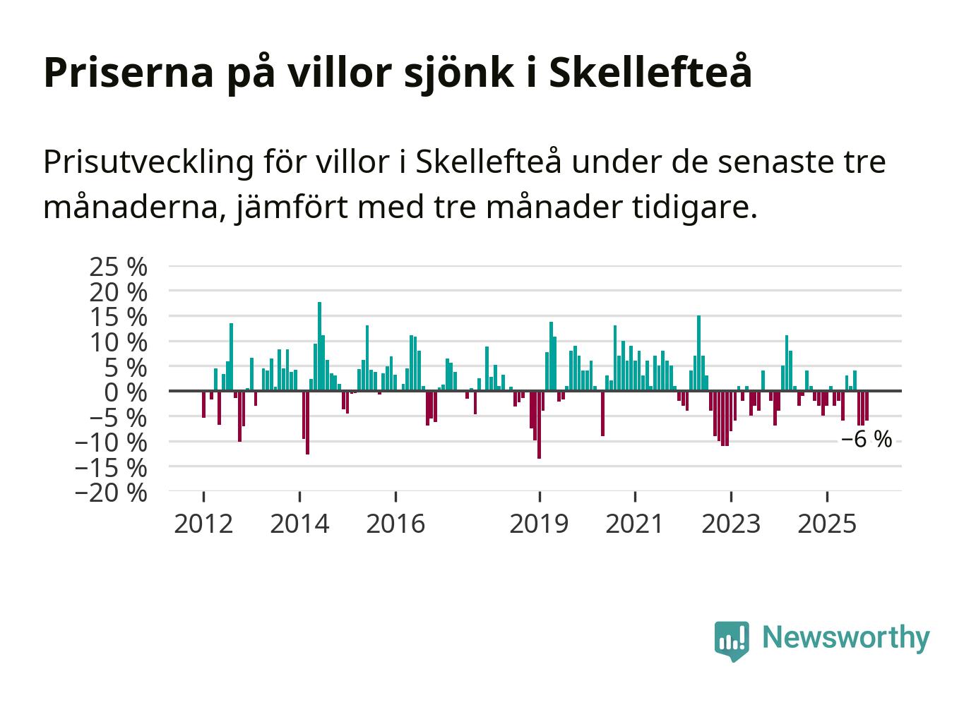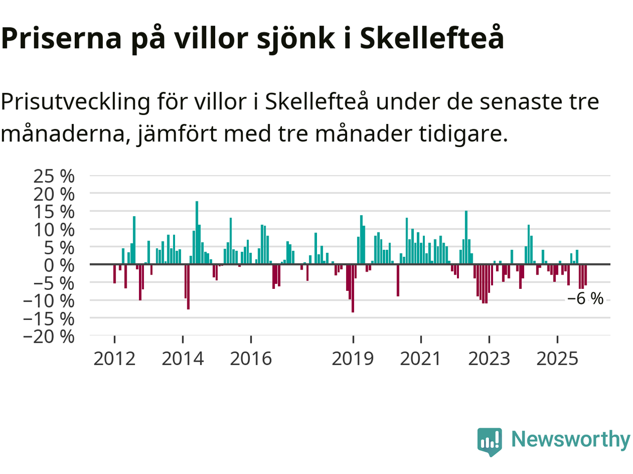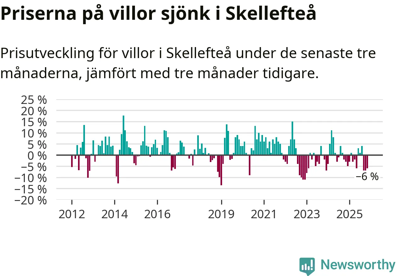 Villapriserna har gått ner i Skellefteå kommun. Medelpriset på försäljningarna under de senaste tre månaderna visar på en nedgång med 6 procent.