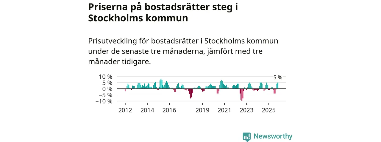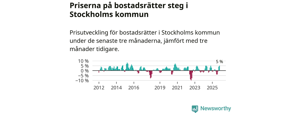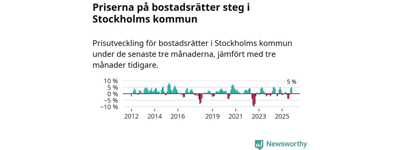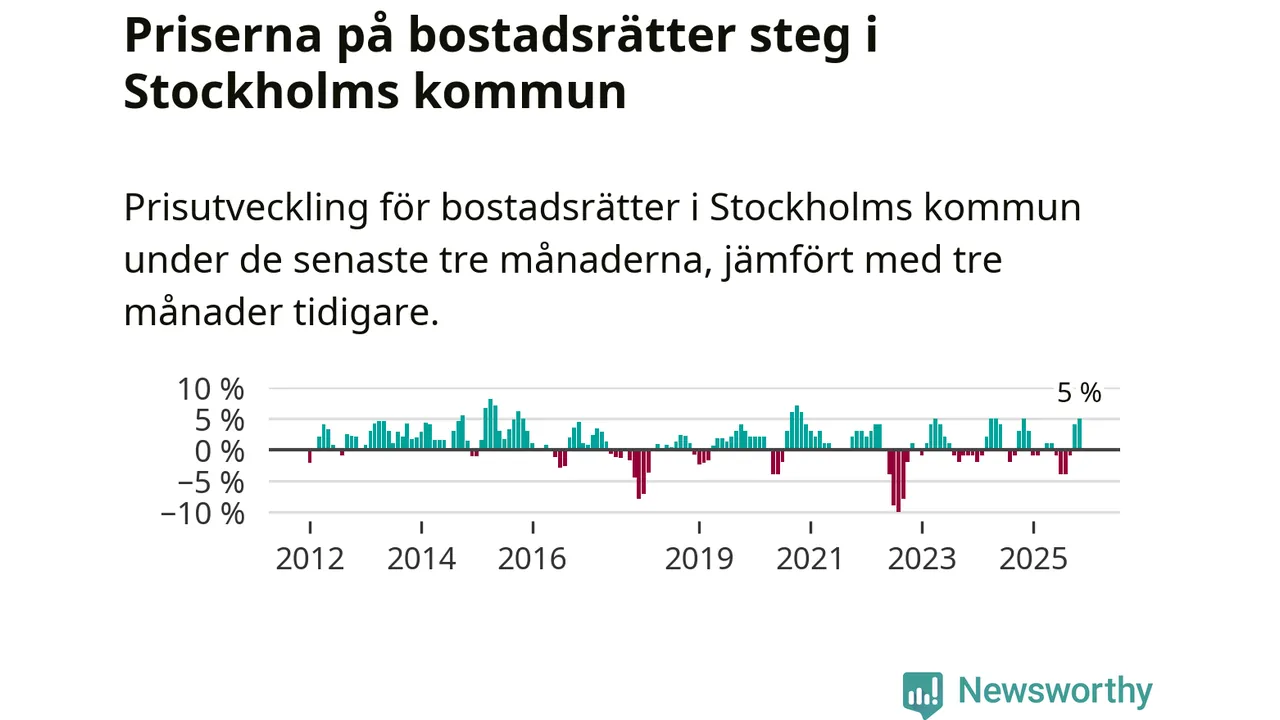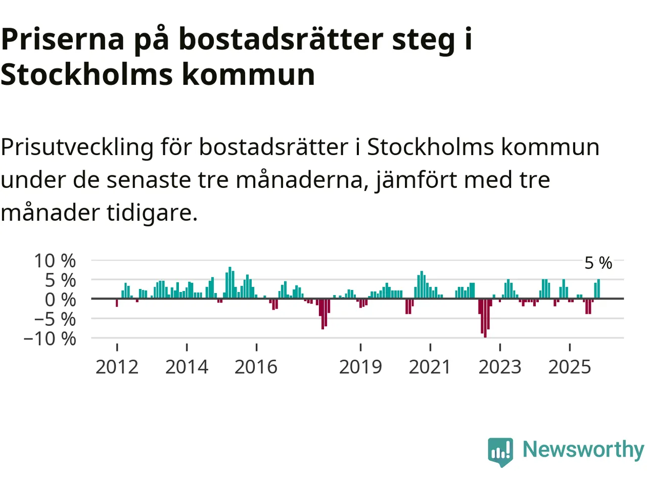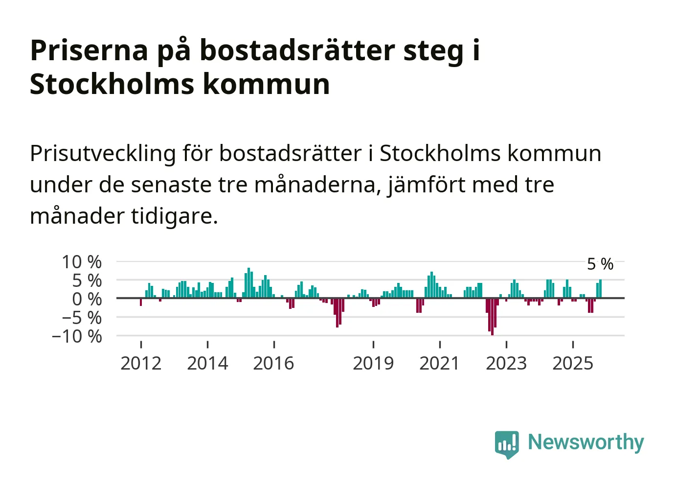 Priserna på bostadsrätter steg mellan september och november med 5 procent i Stockholms kommun. Det är en betydande uppgång jämfört med det gångna året då priserna i snitt stått stilla.