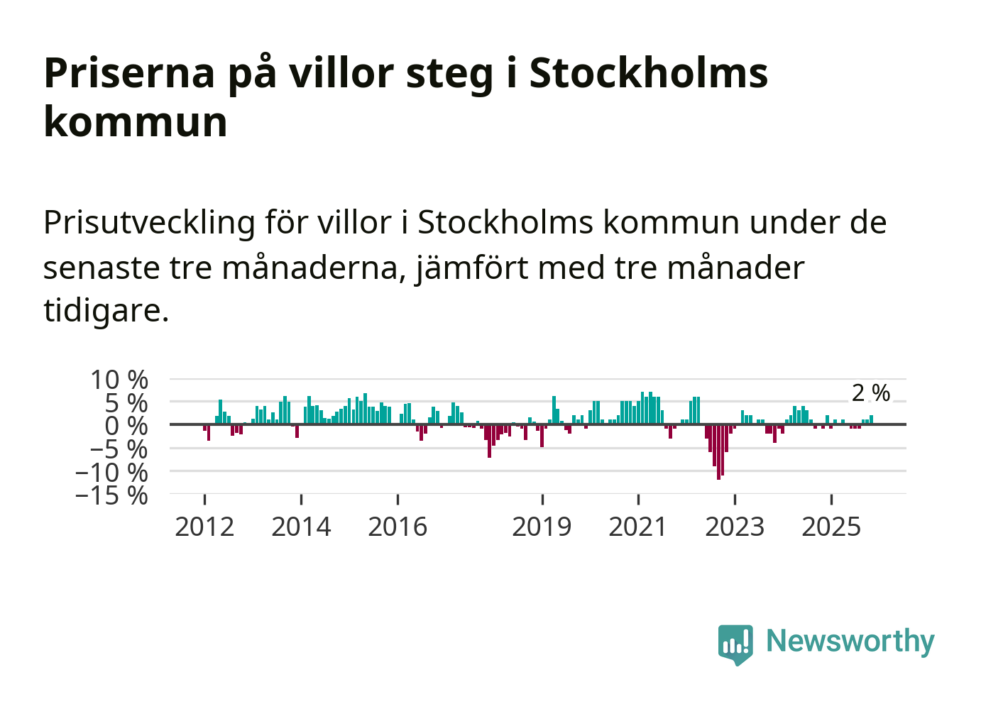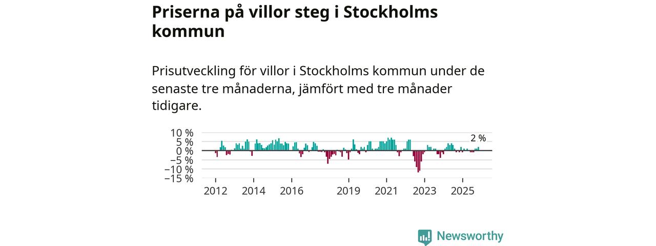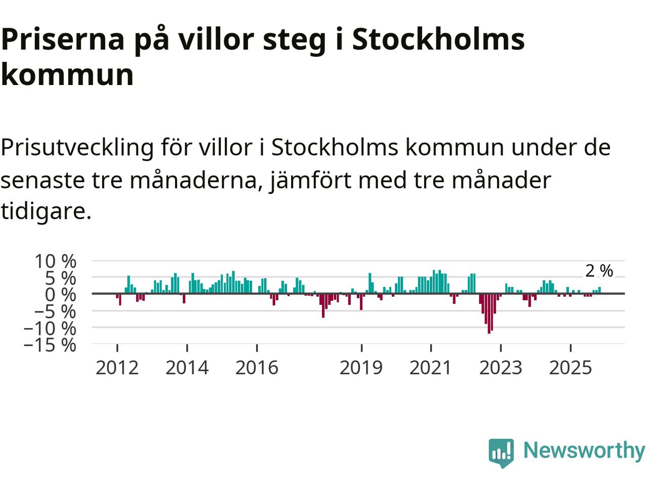 Statistiken visar även på en prisuppgång i Stockholms kommun. Medelpriset på försäljningarna av villor i kommunen var 2 procent högre än för tre månader sedan. Även i hela Stockholms län ökar villapriserna. I hela länet noterades en prisuppgång på 1 procent.