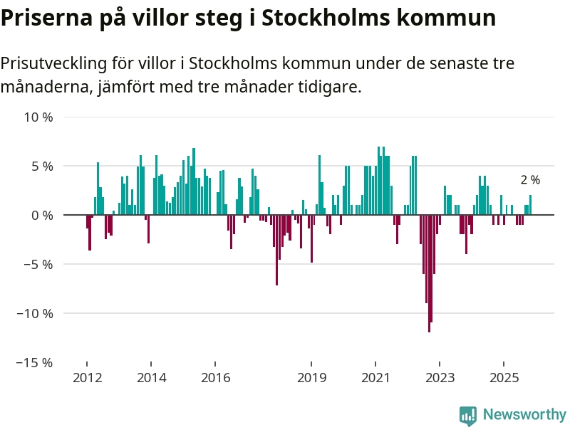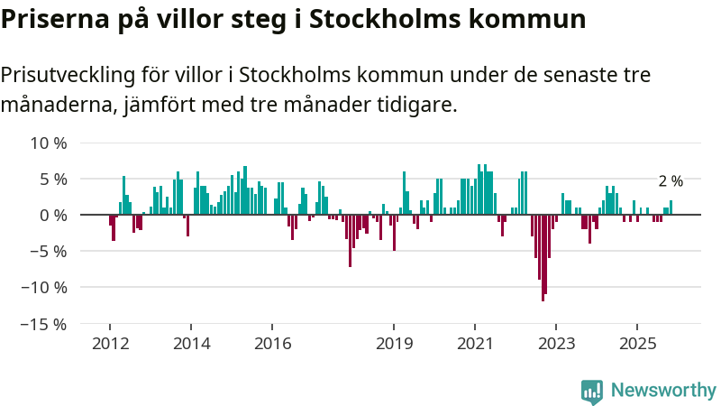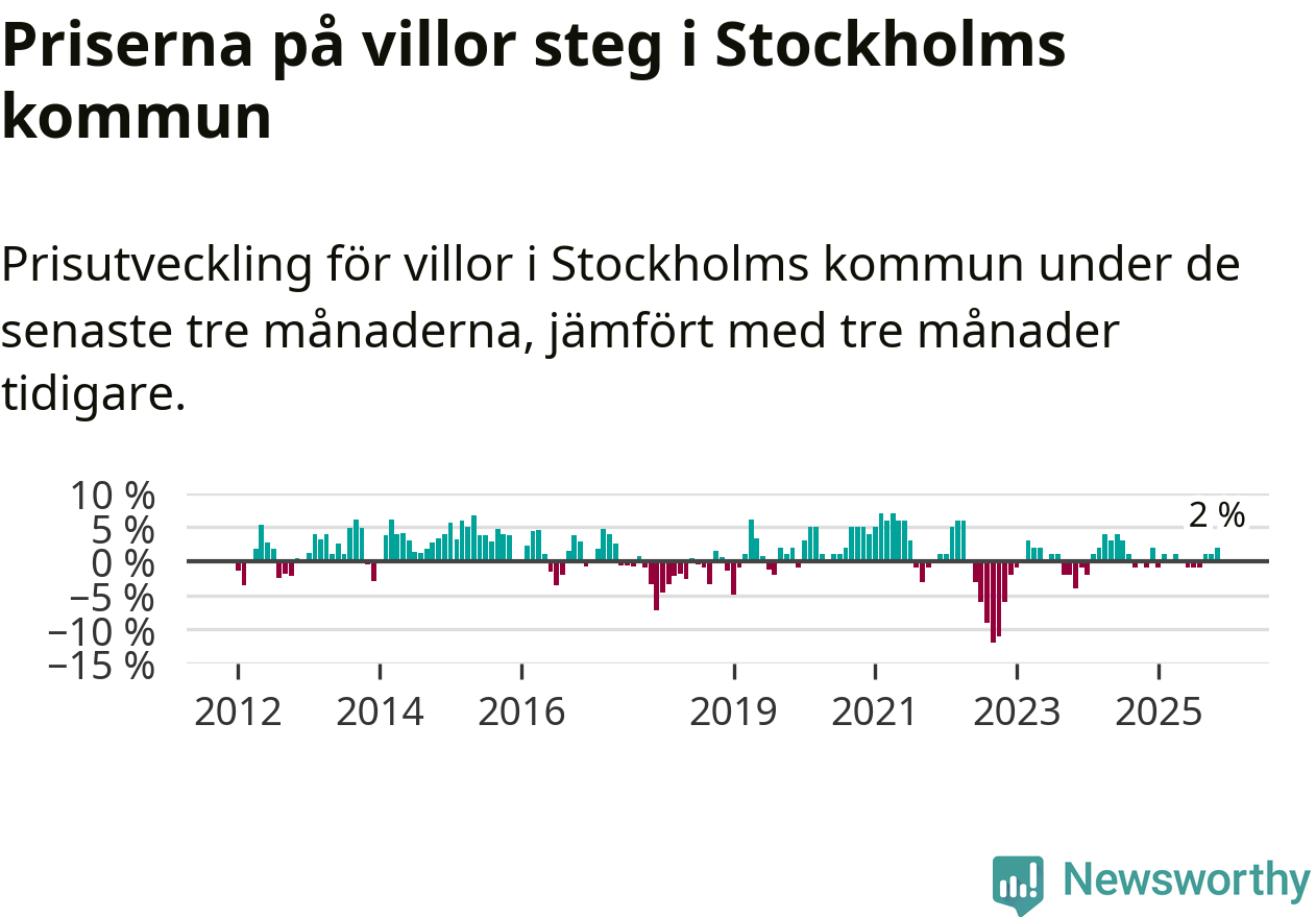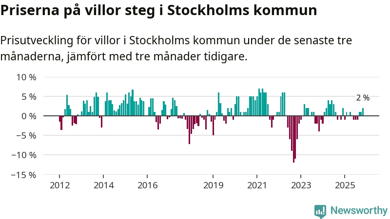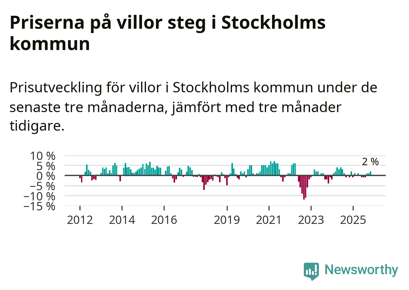Statistiken visar även på en prisuppgång i Stockholms kommun. Medelpriset på försäljningarna av villor i kommunen var 2 procent högre än för tre månader sedan. Även i hela Stockholms län ökar villapriserna. I hela länet noterades en prisuppgång på 1 procent.