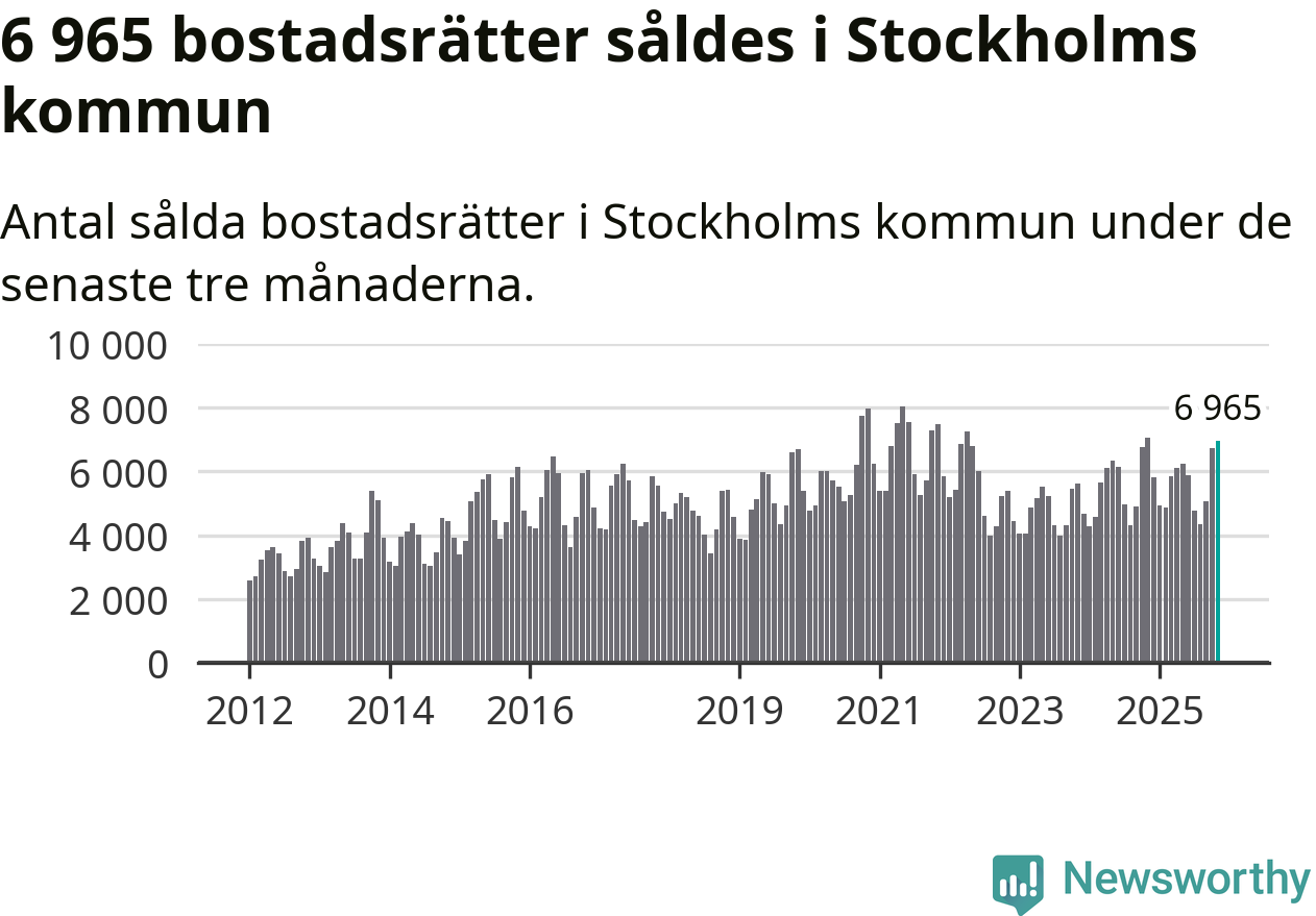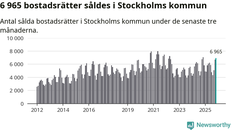 Sammanlagt såldes 6 965 bostadsrätter i Stockholms kommun mellan september och november till ett genomsnittligt pris på 5,3 miljoner kronor. I fjol gjordes 7 069 affärer vid den här tiden på året.