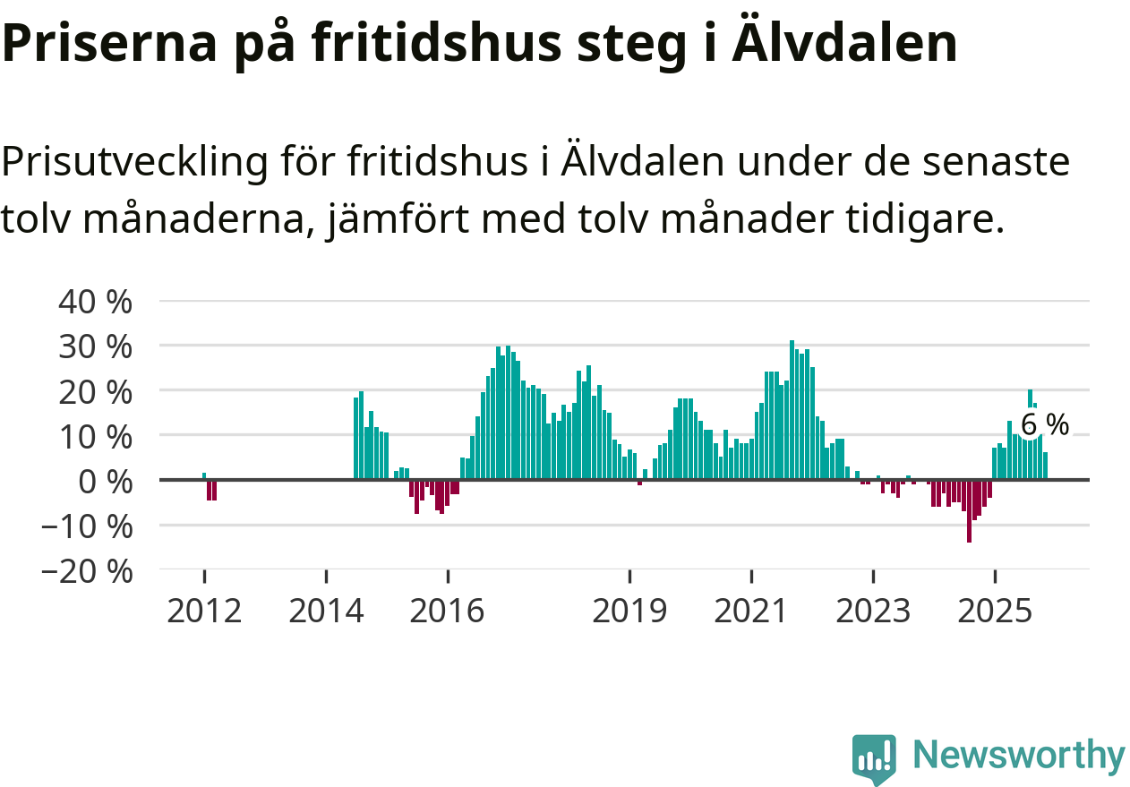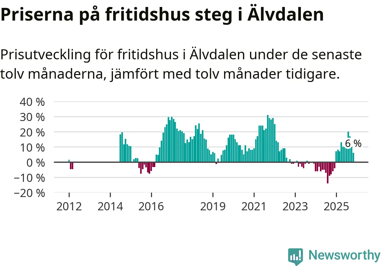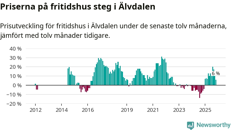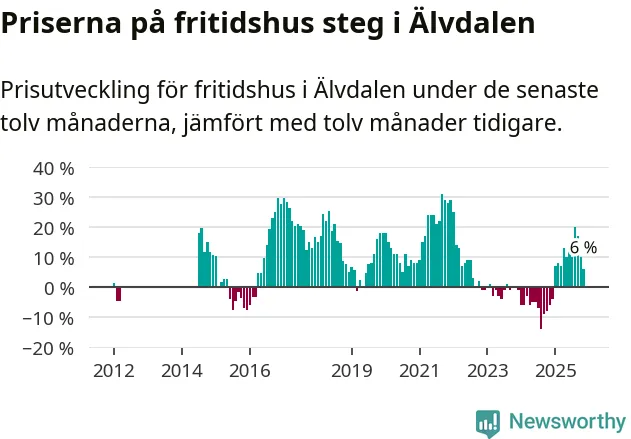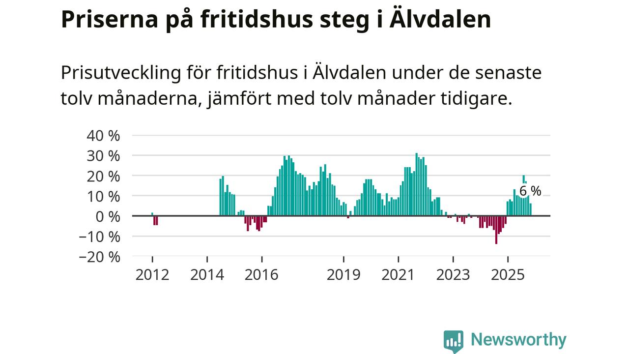 Statistiken visar även på en kännbar prisuppgång i Älvdalens kommun. Medelpriset på försäljningarna av fritidshus i kommunen var 6 procent högre än för ett år sedan. I hela Dalarna däremot sjunker priserna på fritidshus. I hela länet noterades en prisnedgång på 5 procent.