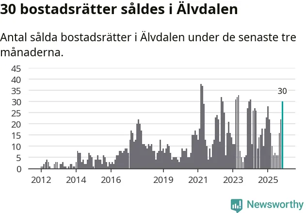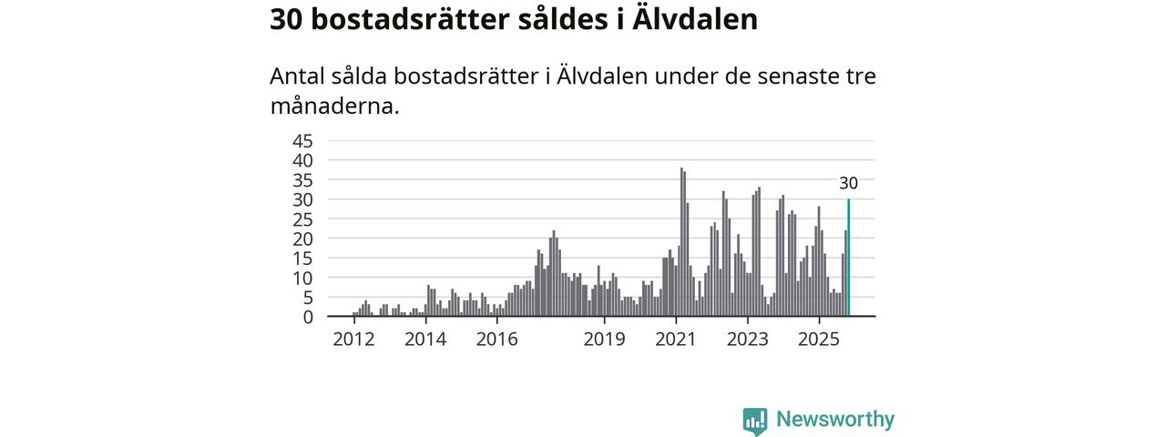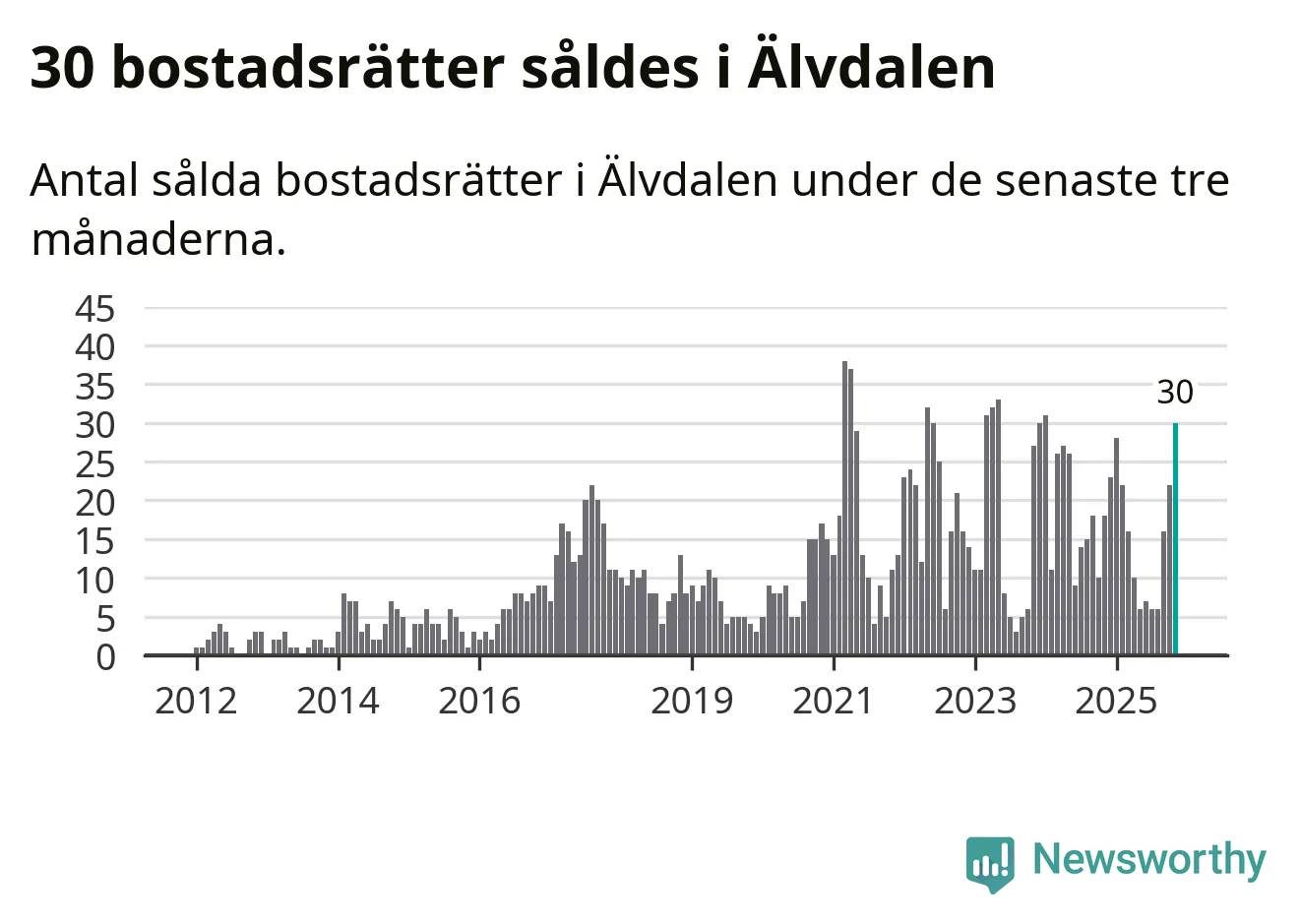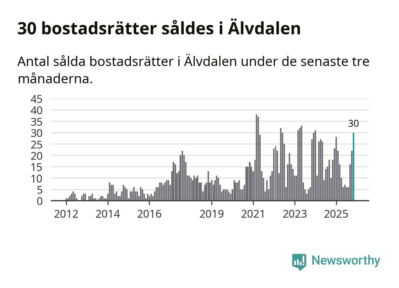 Mellan september och november såldes 30 bostadsrätter i Älvdalens kommun. Det är relativt många sett till aktiviteten på bostadsmarknaden i kommunen under de senaste tolv månaderna, samt det historiska snittet för den här tiden på året.