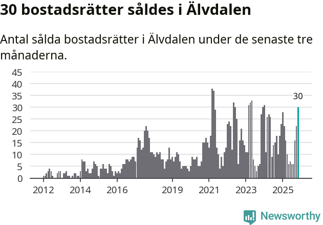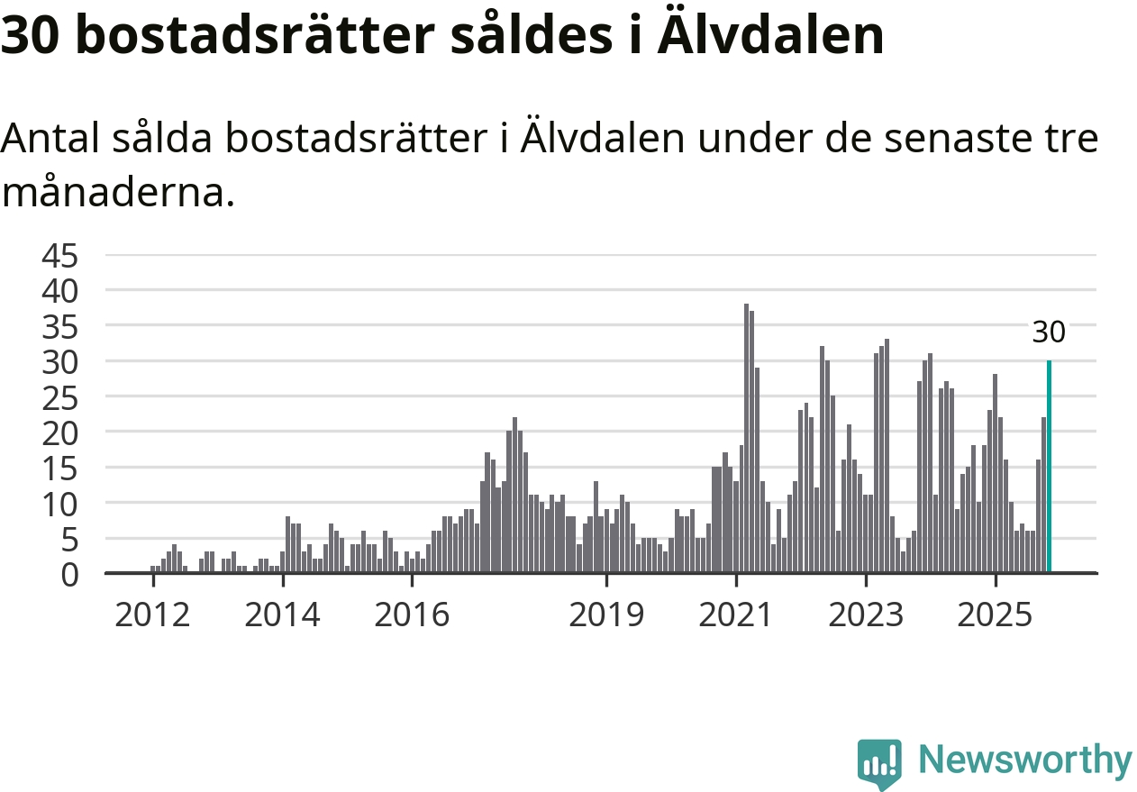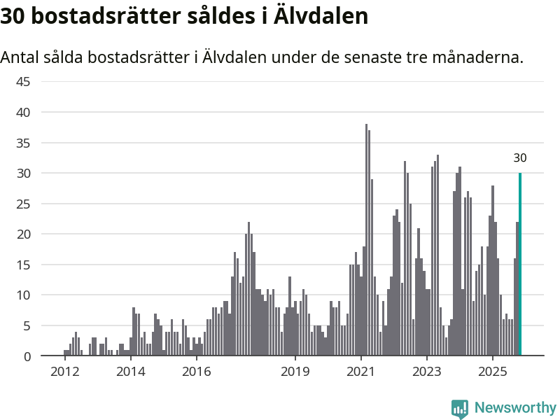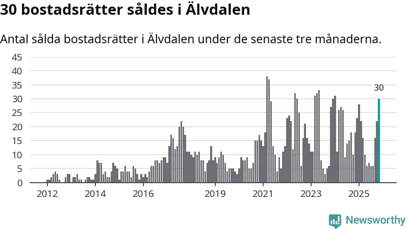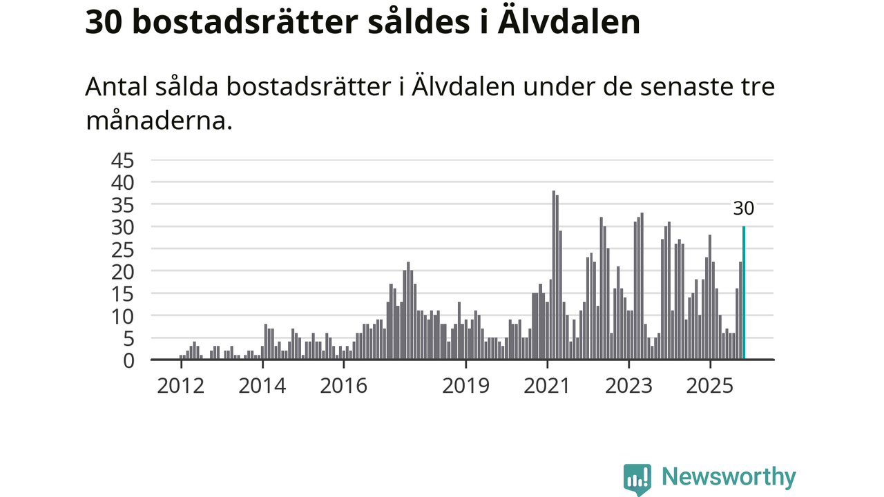 Mellan september och november såldes 30 bostadsrätter i Älvdalens kommun. Det är relativt många sett till aktiviteten på bostadsmarknaden i kommunen under de senaste tolv månaderna, samt det historiska snittet för den här tiden på året.