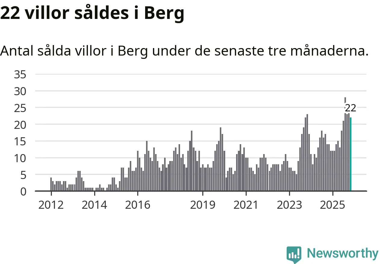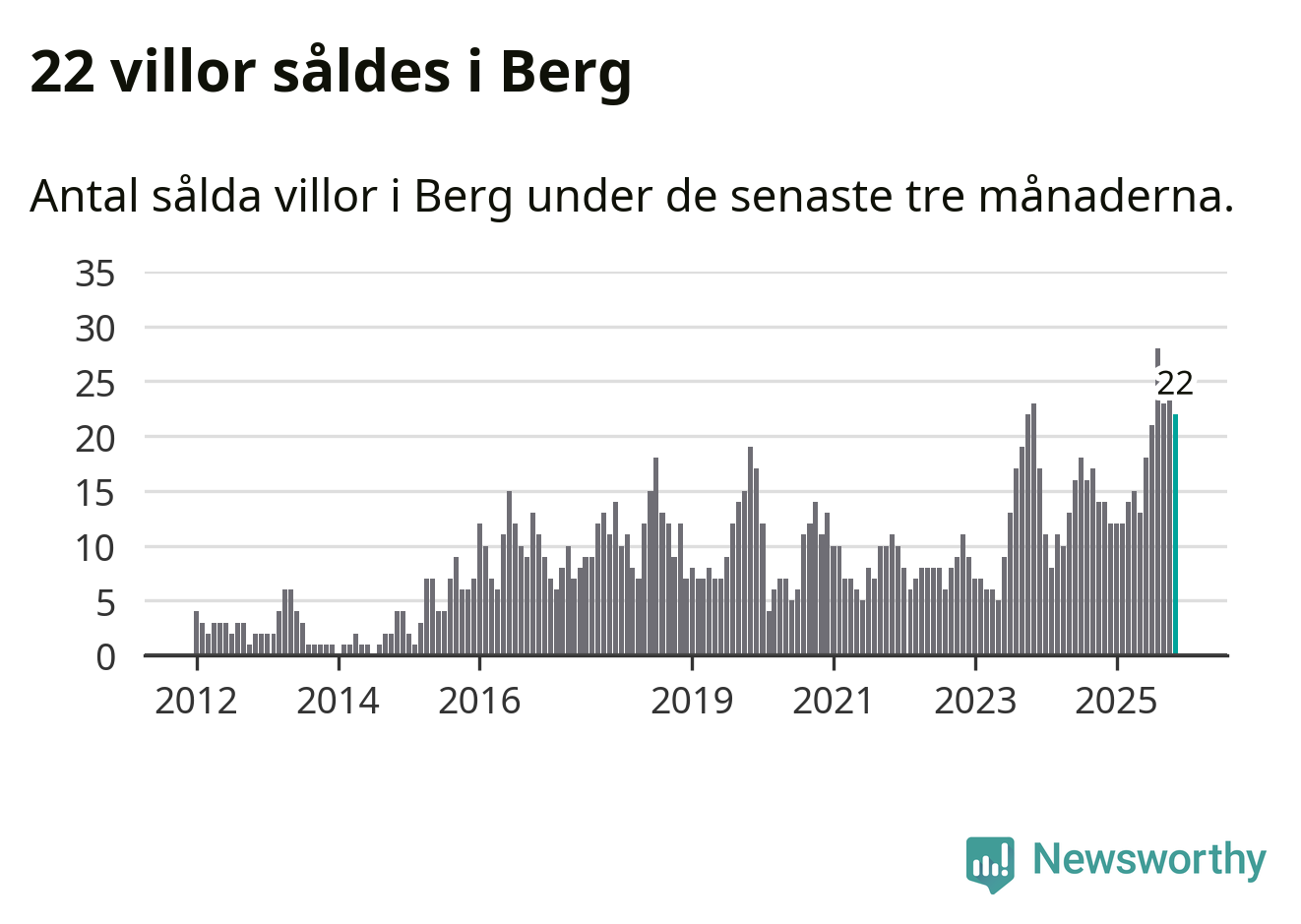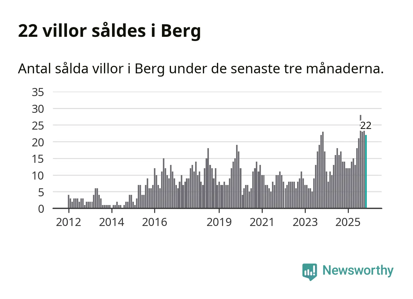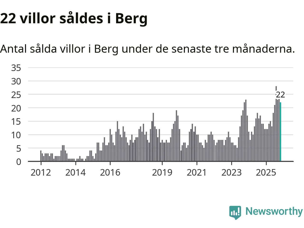 Mellan september och november gjordes sammanlagt 22 affärer med villor i Bergs kommun. Det kan jämföras med 14 vid motsvarande tid i fjol.