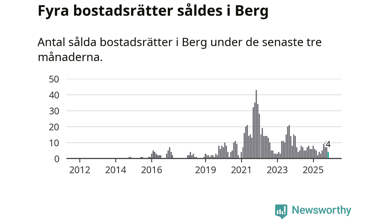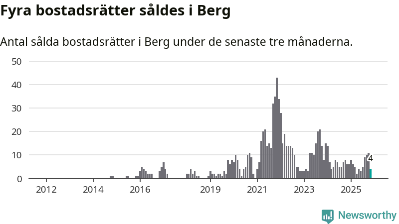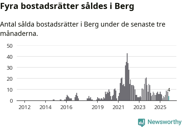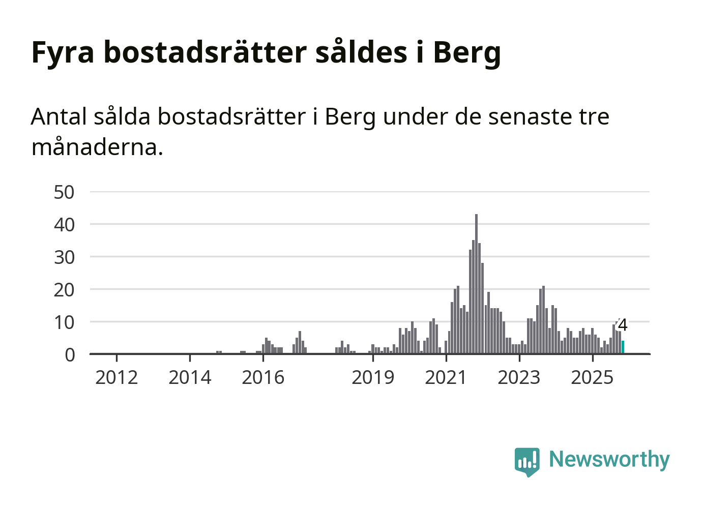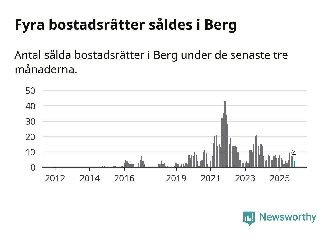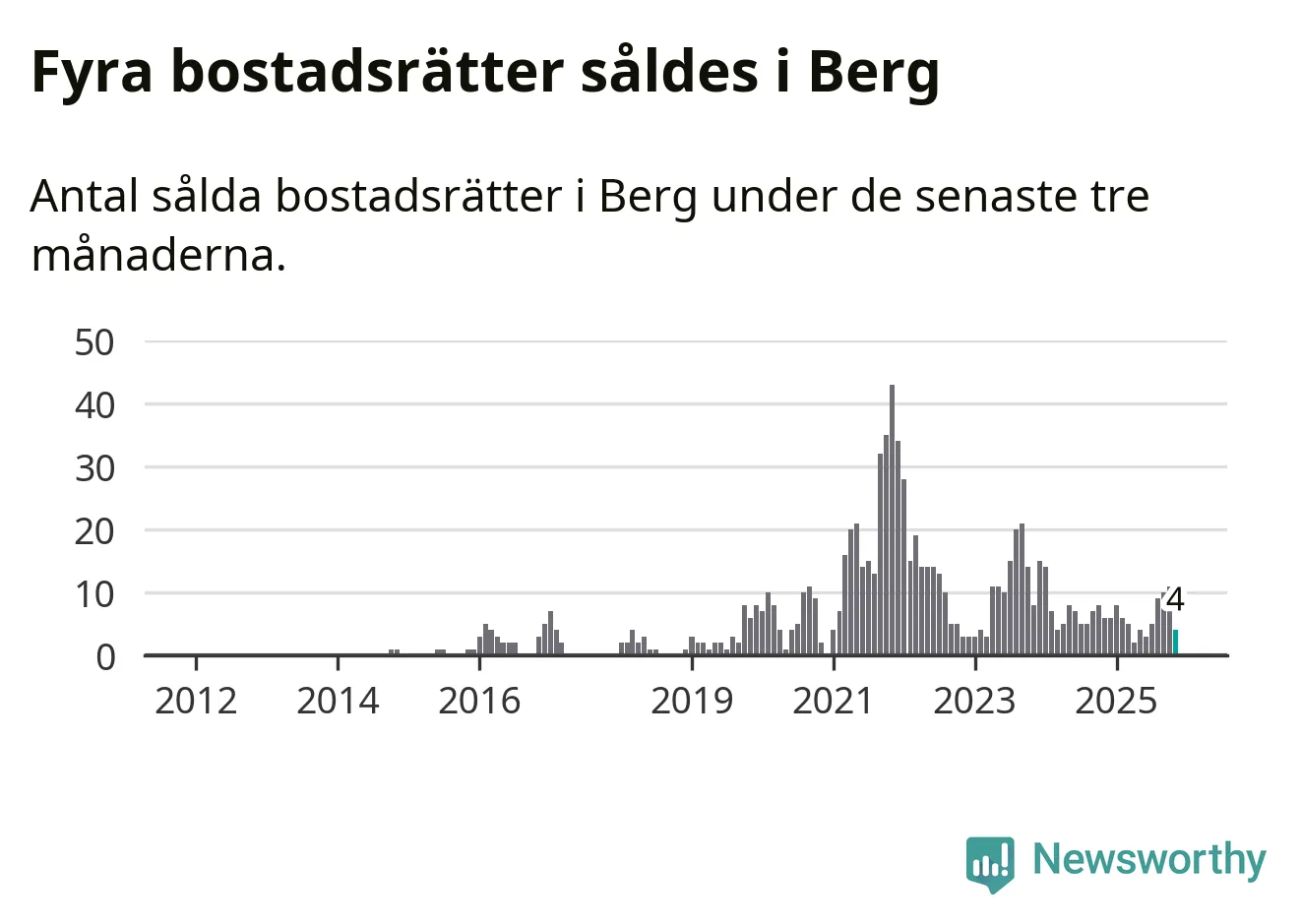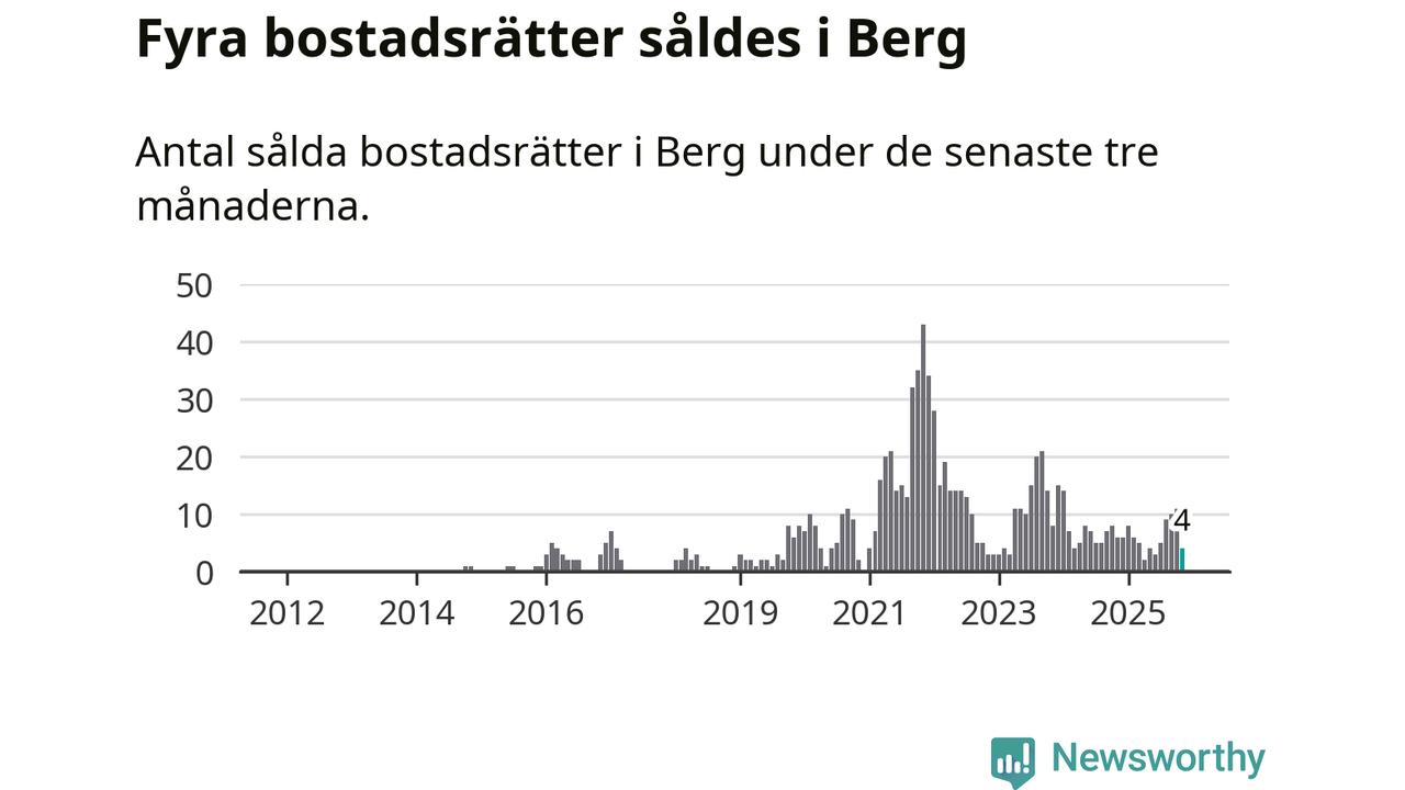 Mellan september och november gjordes sammanlagt fyra affärer med bostadsrätter i Bergs kommun. Det kan jämföras med sex vid motsvarande tid i fjol.