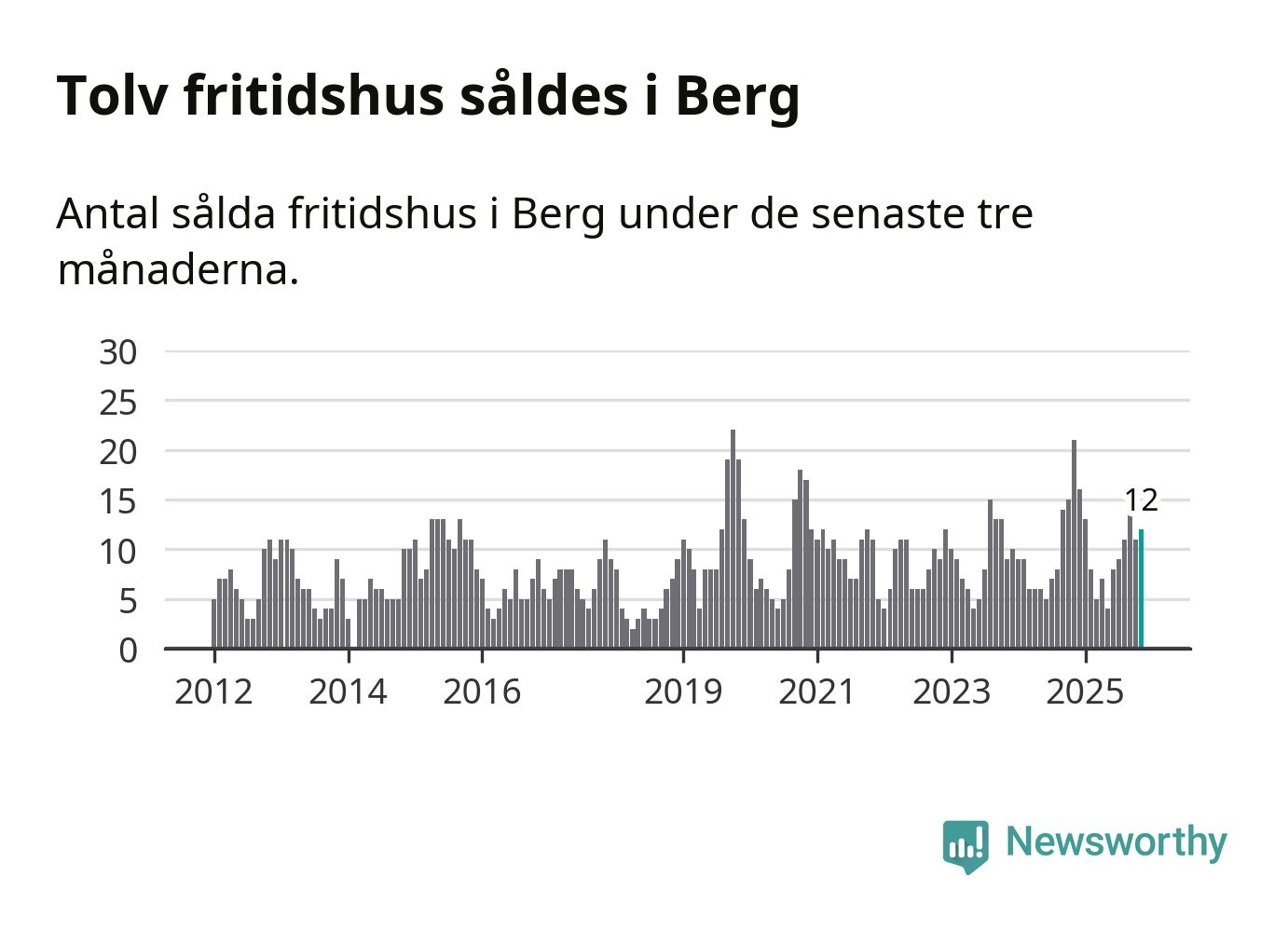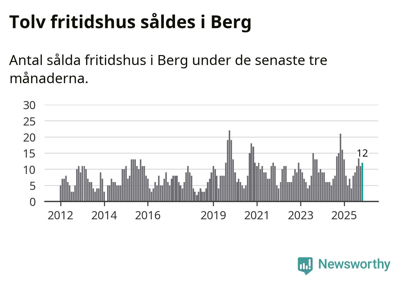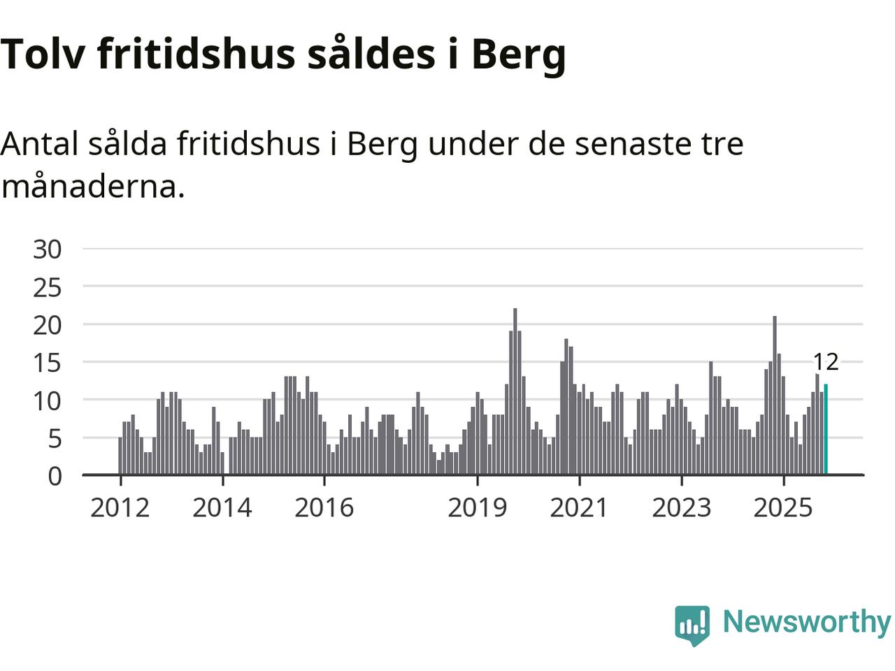 Sammanlagt såldes tolv fritidshus i Bergs kommun mellan september och november till ett genomsnittligt pris på 3,3 miljoner kronor. I fjol gjordes 21 affärer vid den här tiden på året.