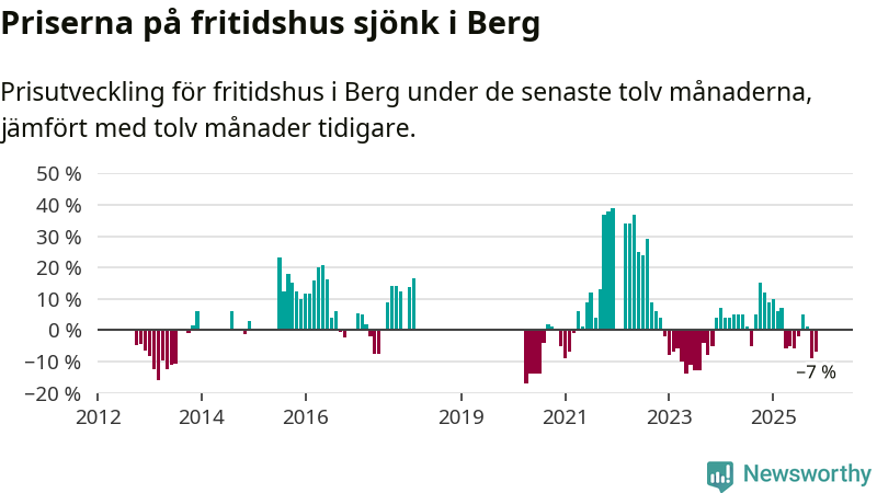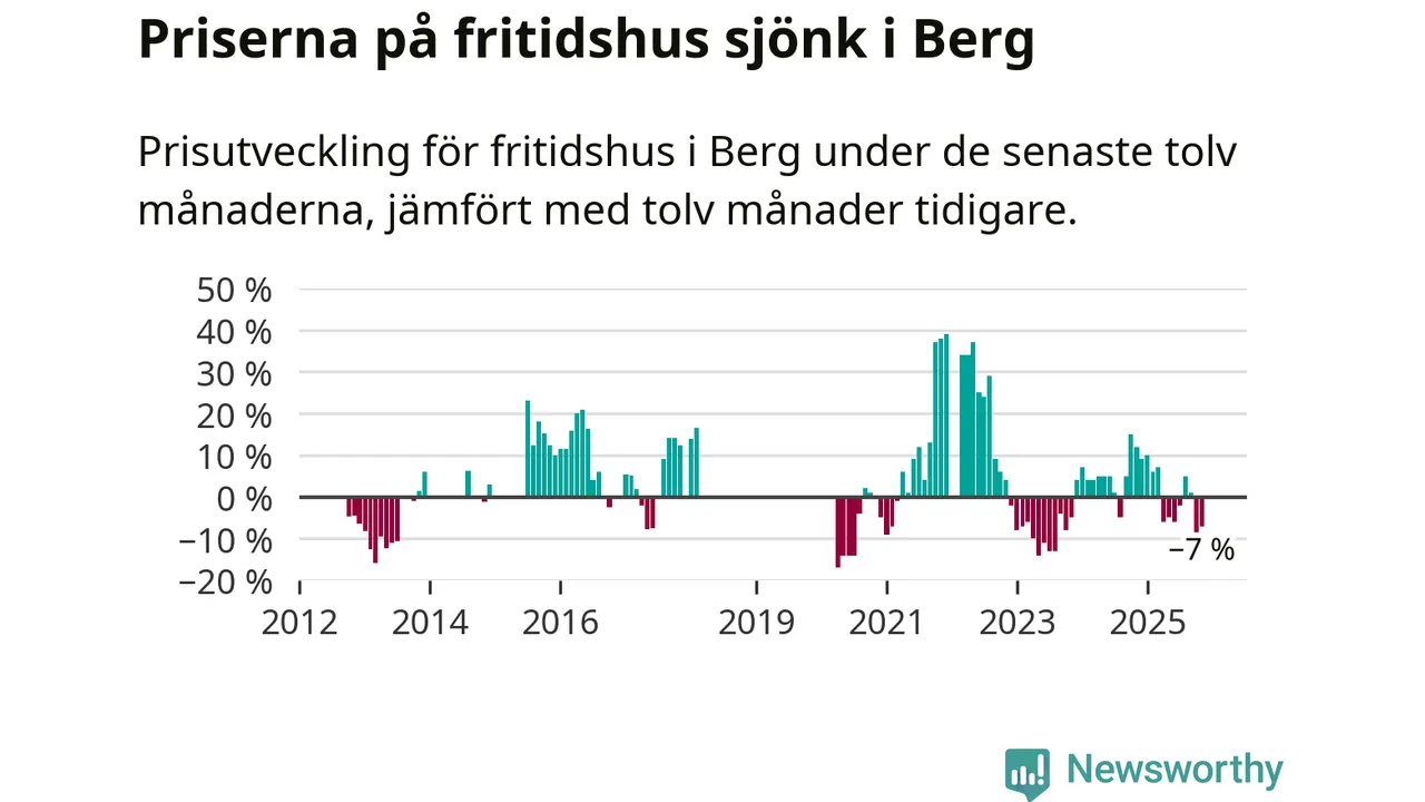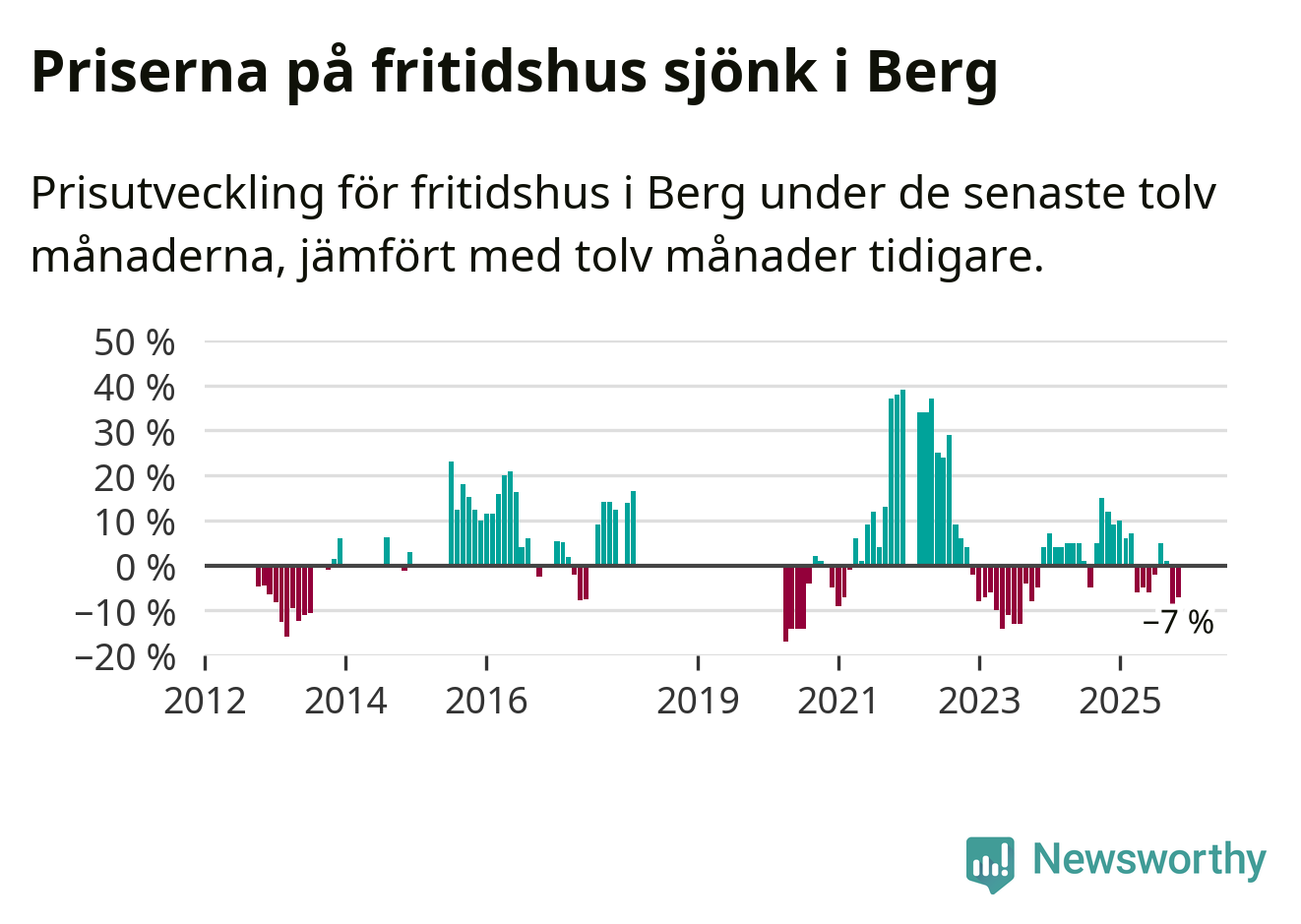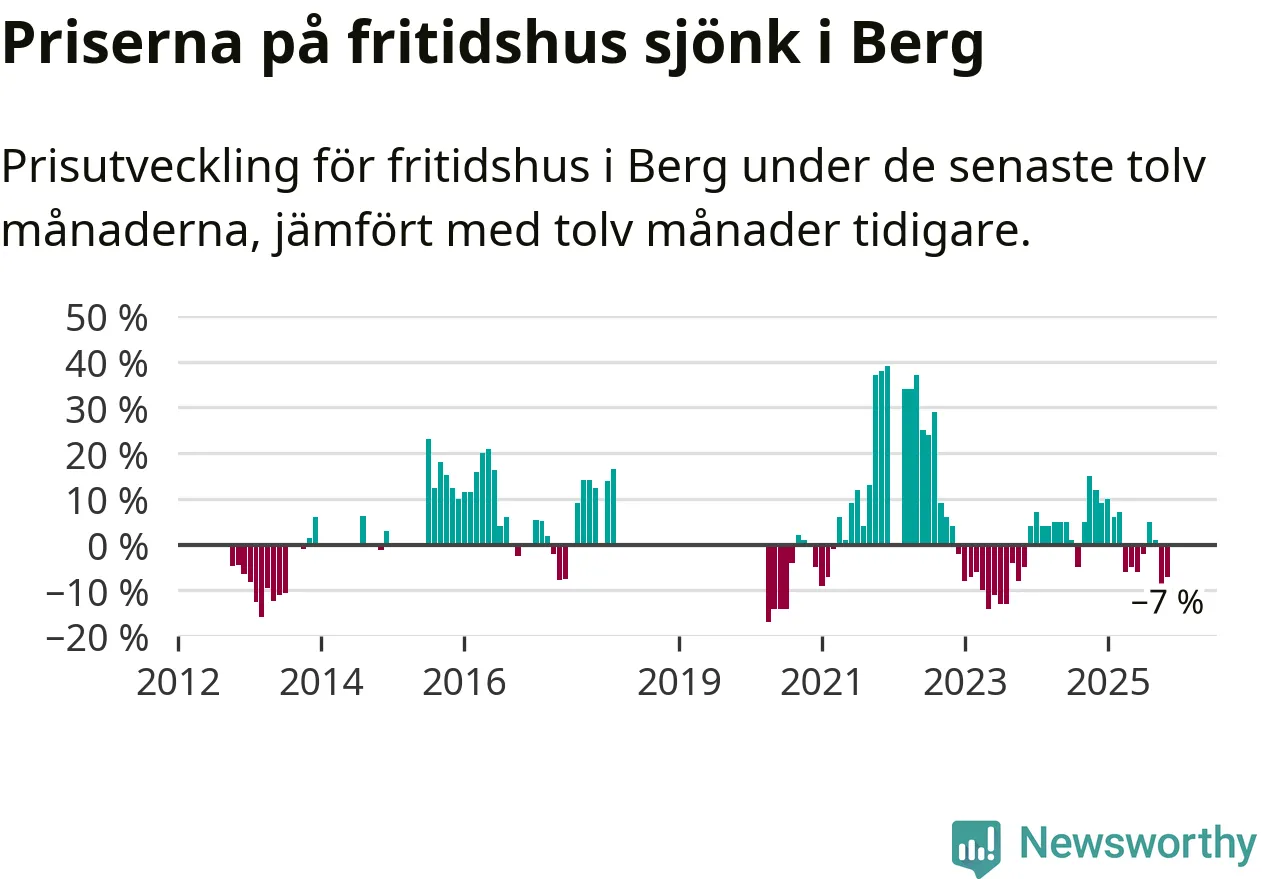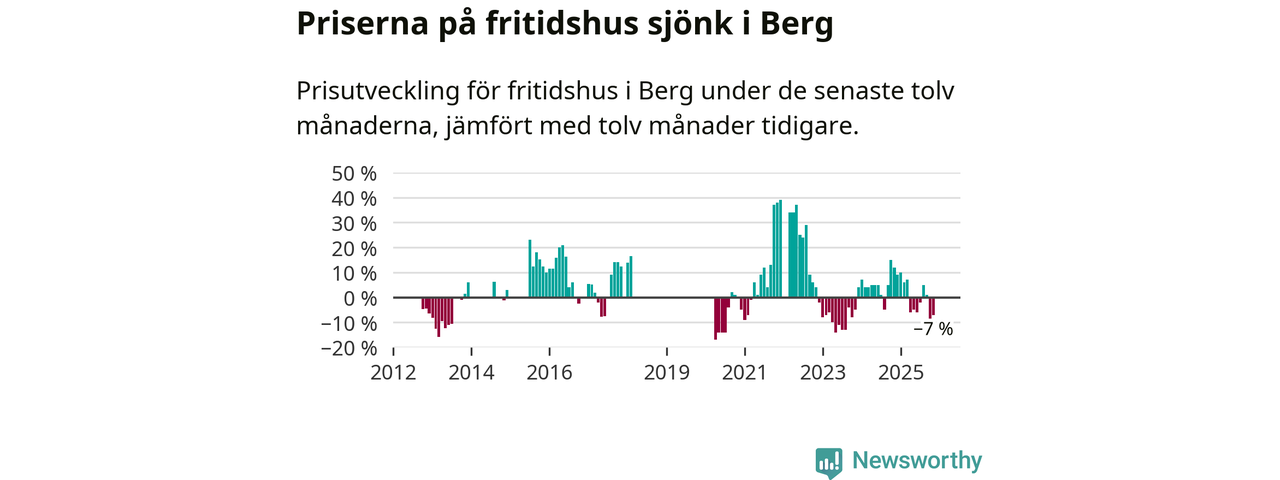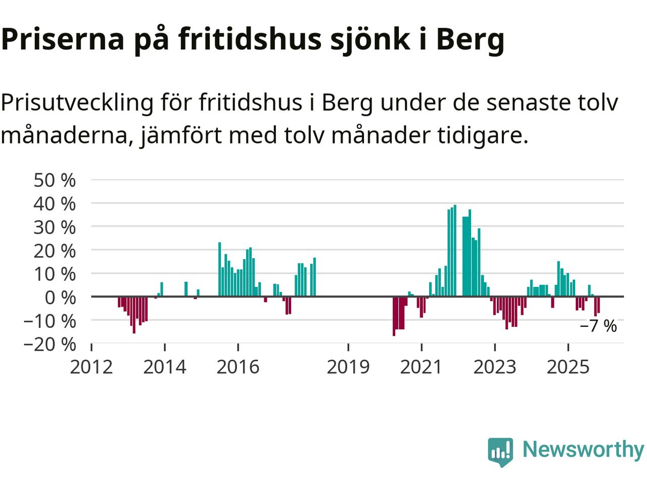 Priserna på fritidshus har gått ner i Bergs kommun. Medelpriset på försäljningarna under de senaste tolv månaderna visar på en nedgång med 7 procent.