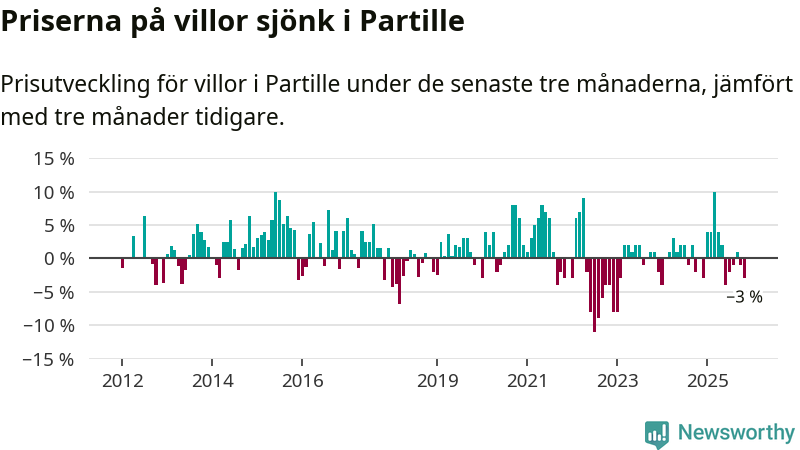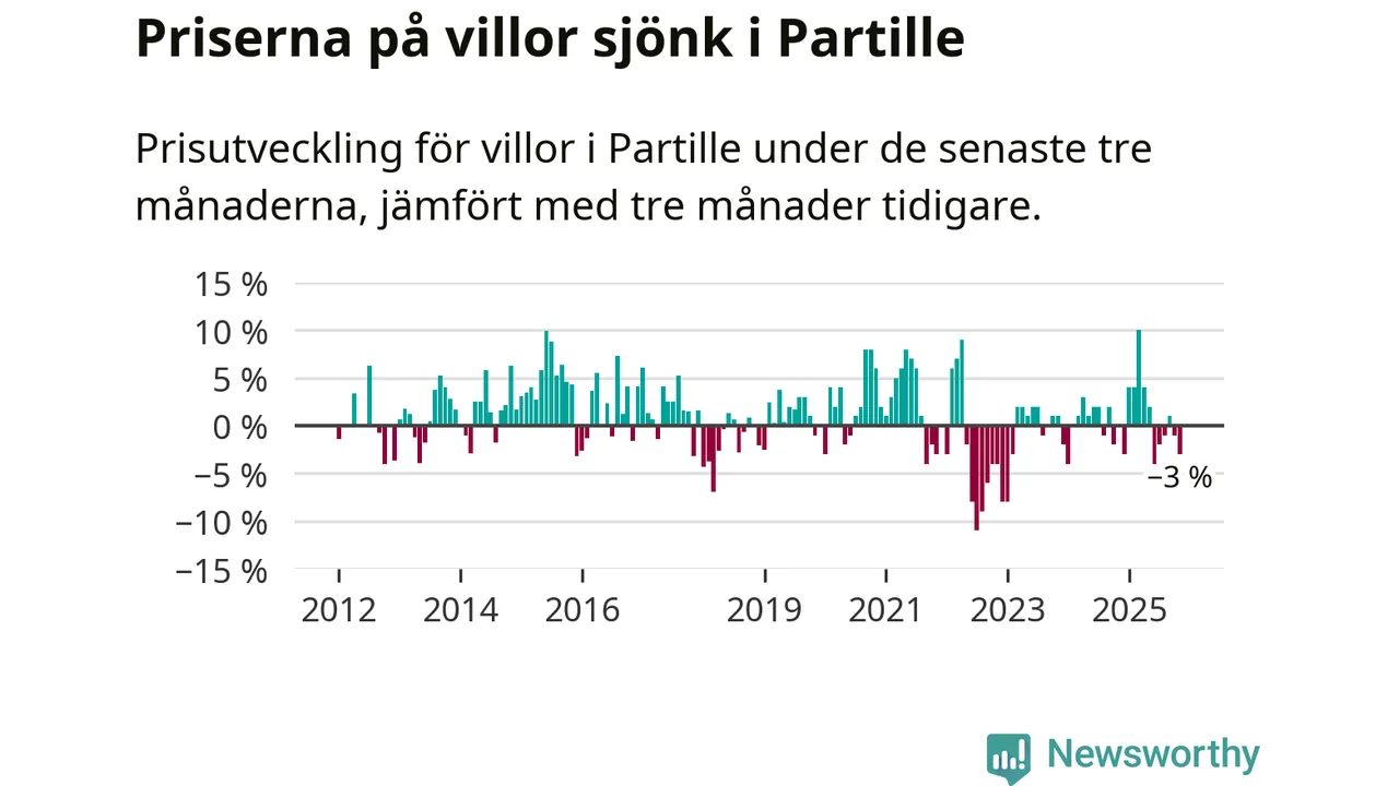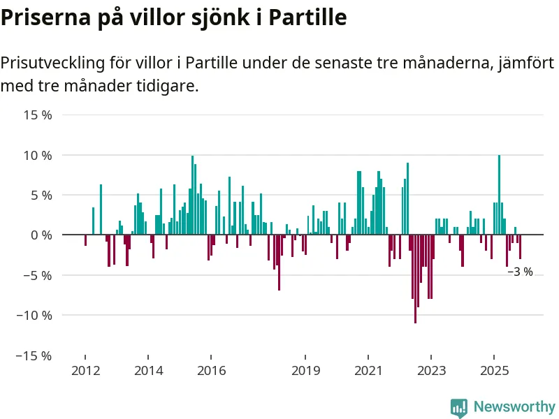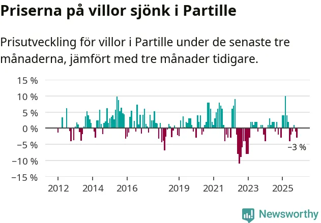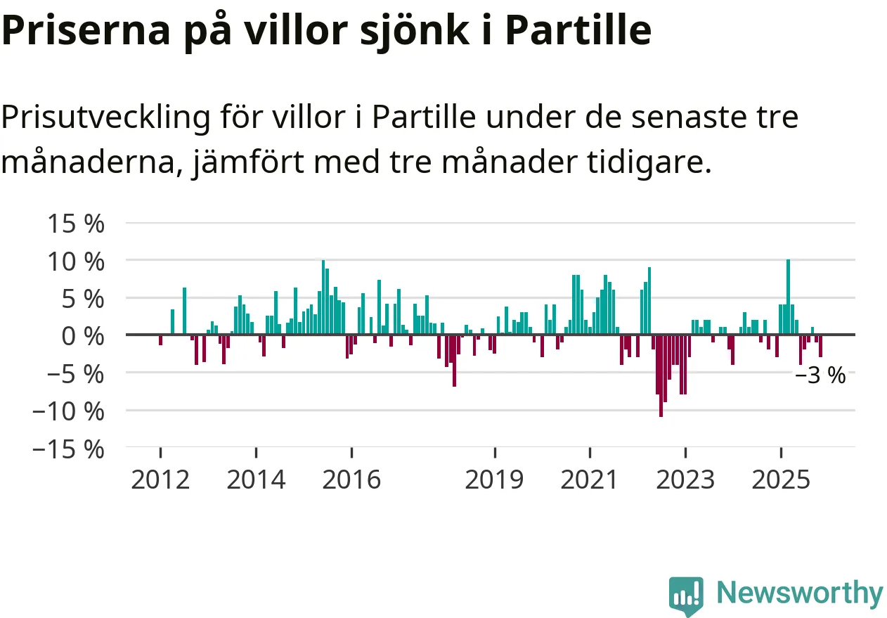 Villapriserna har gått ner i Partille kommun. Medelpriset på försäljningarna under de senaste tre månaderna visar på en nedgång med 3 procent.
