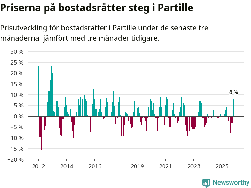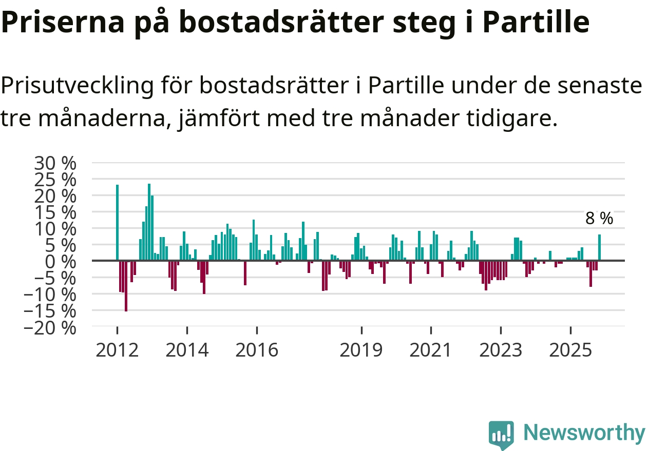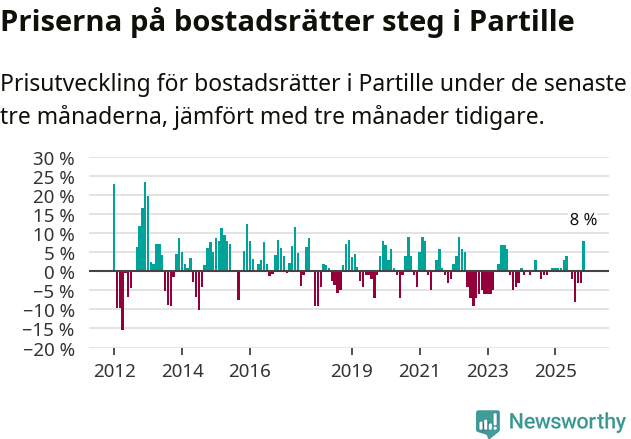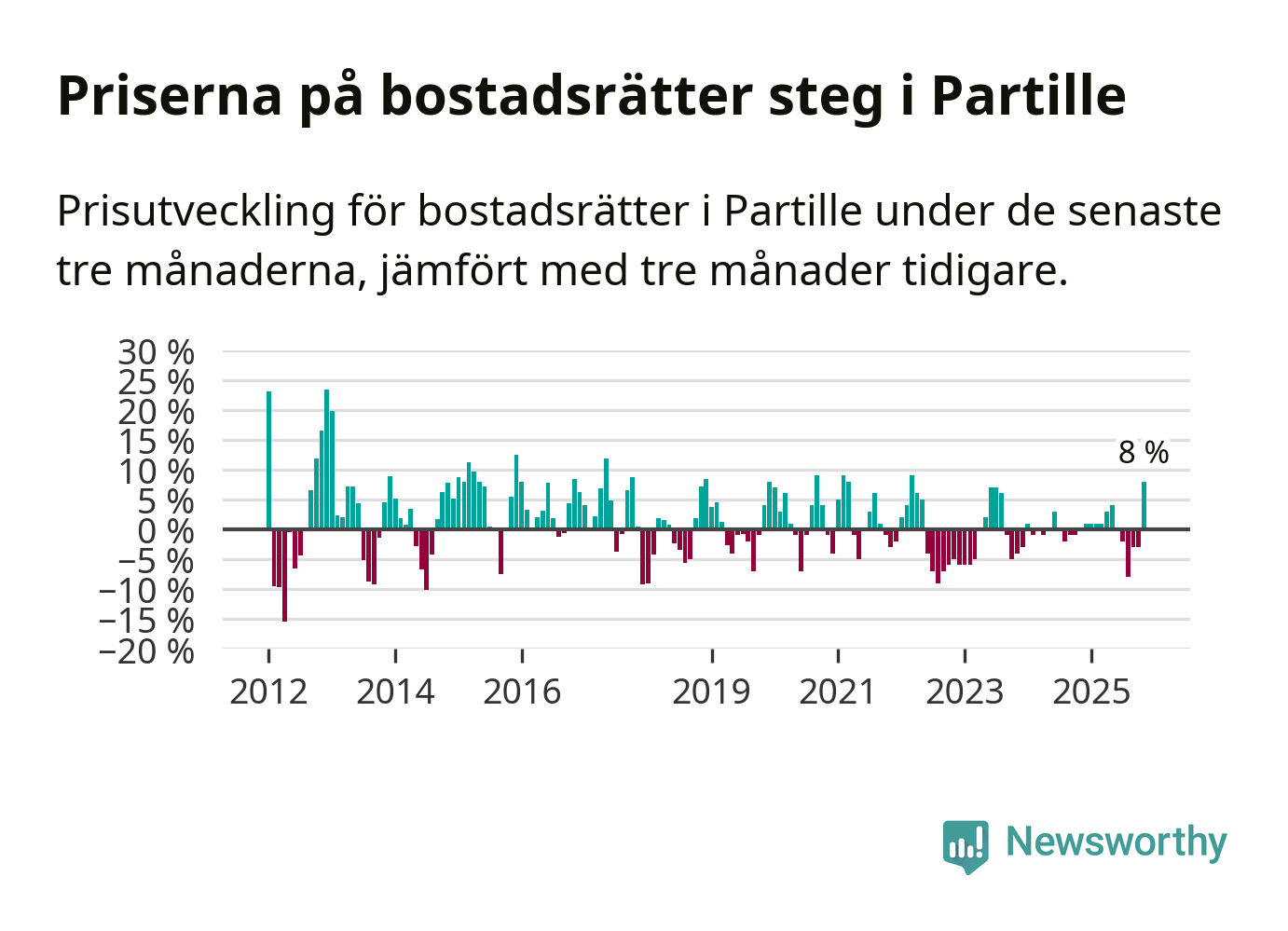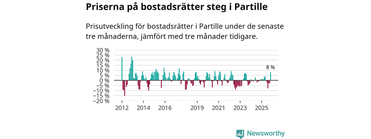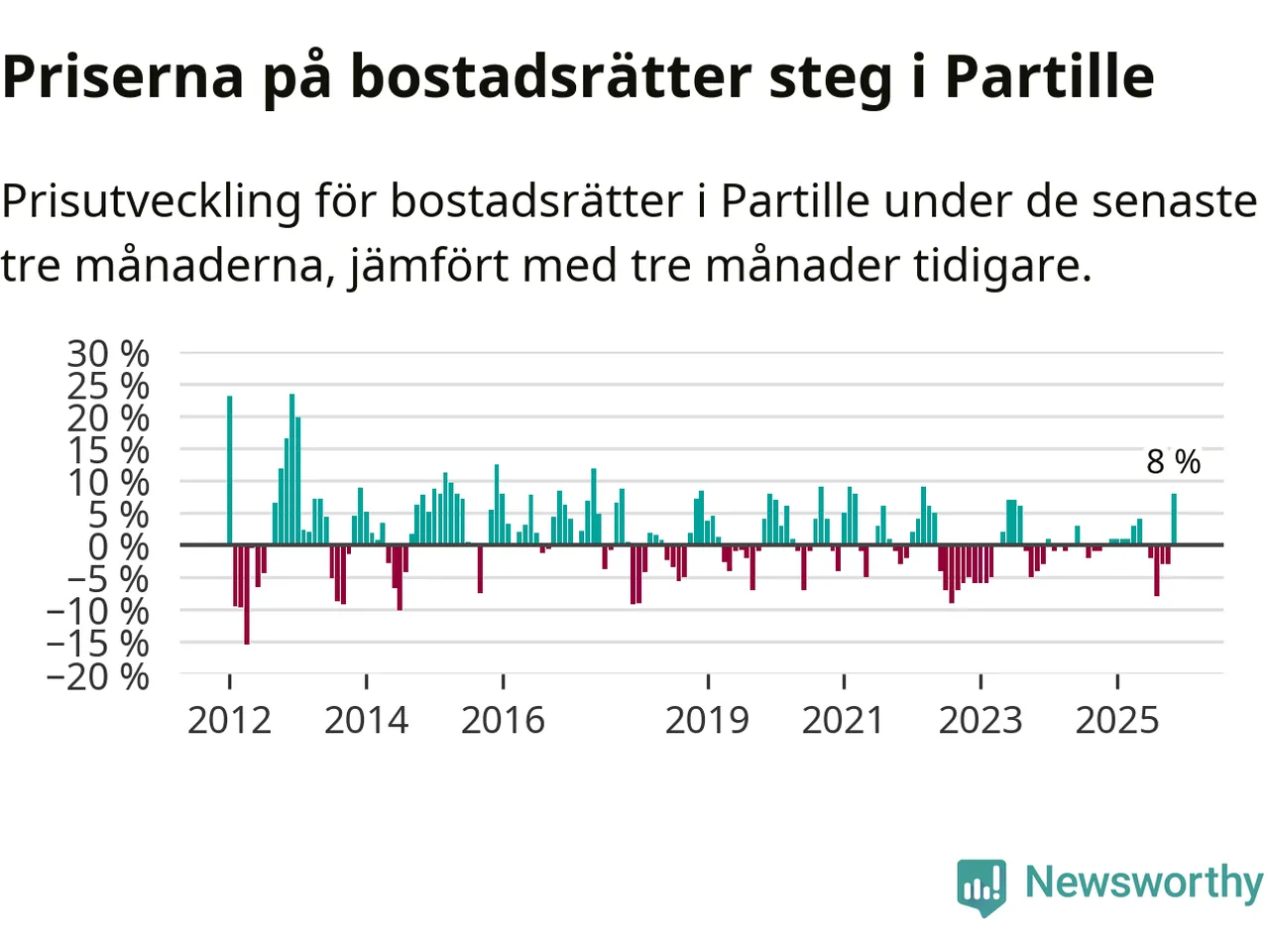 Priserna på bostadsrätter steg med åtta procent i Partille kommun under de senaste tre månaderna. Det är den starkaste prisutvecklingen sedan 2022.