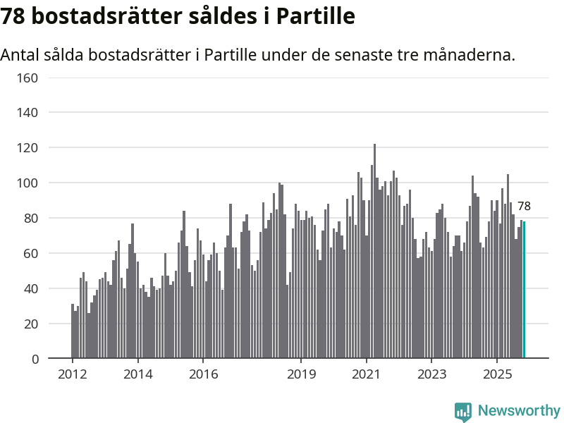Sammanlagt såldes 78 bostadsrätter i Partille kommun mellan september och november till ett genomsnittligt pris på 2,9 miljoner kronor. I fjol gjordes 90 affärer vid den här tiden på året.