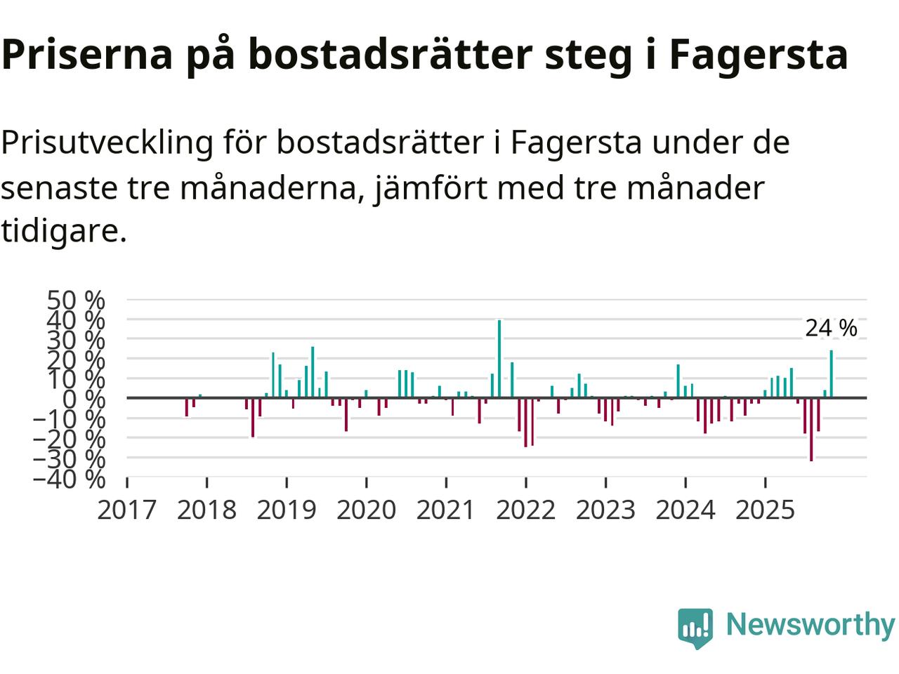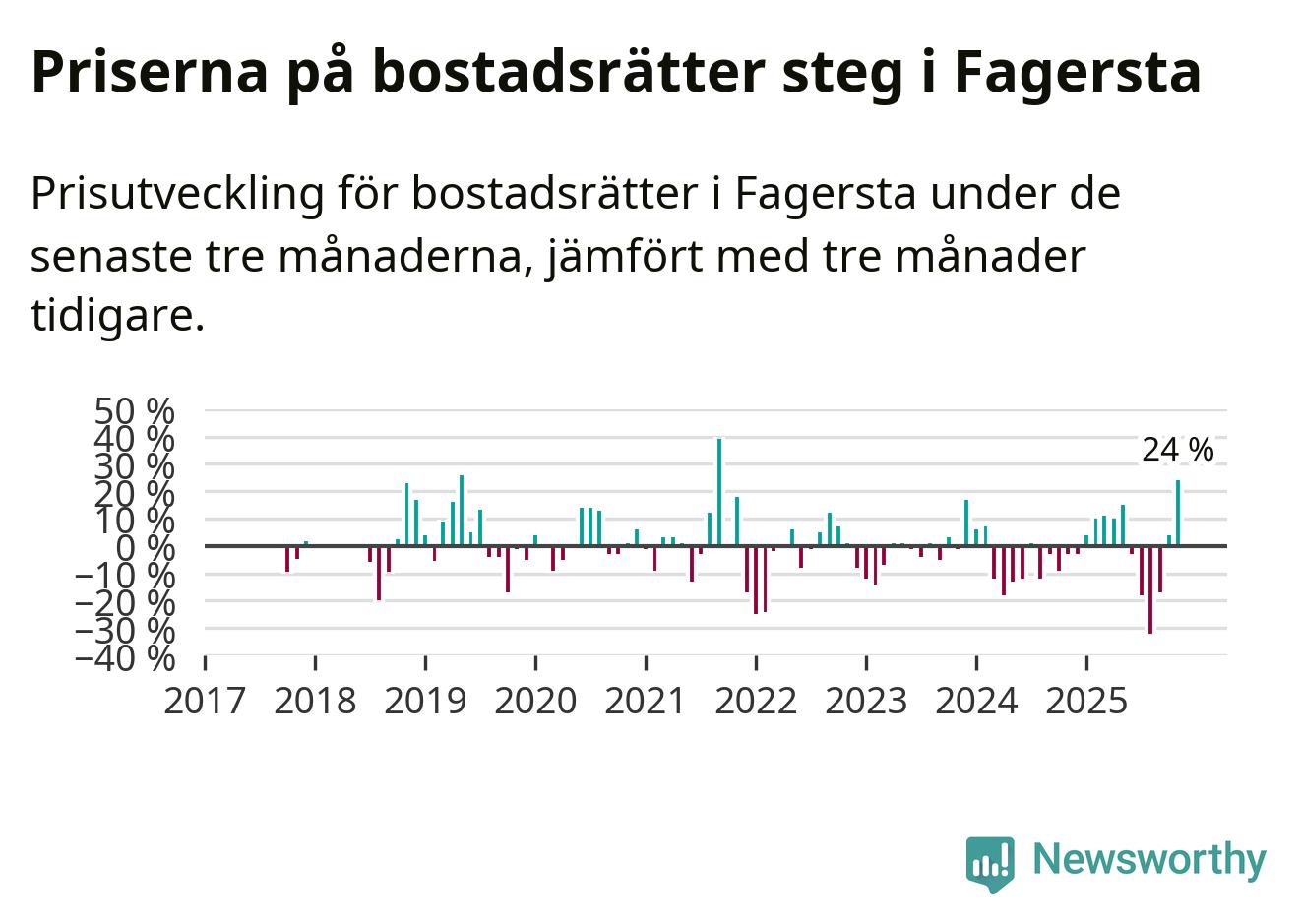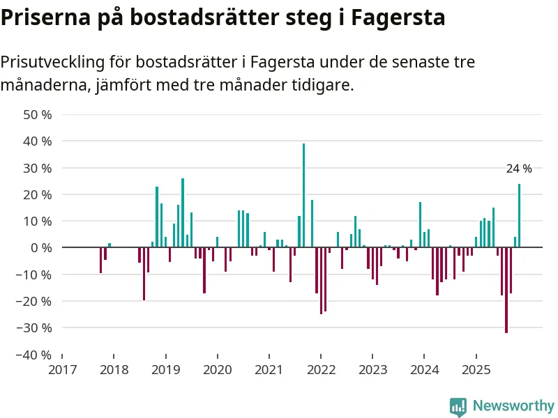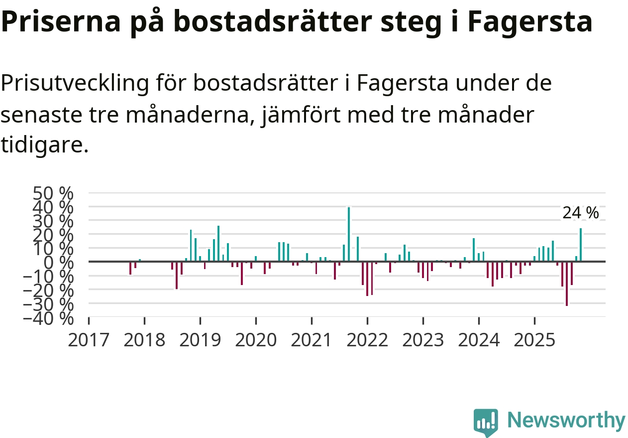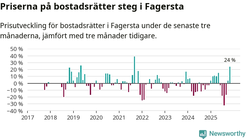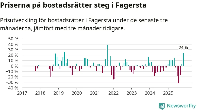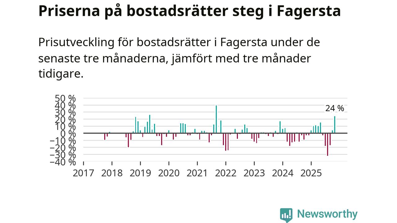 Priserna på bostadsrätter steg med 24 procent i Fagersta kommun under de senaste tre månaderna. Det är den starkaste prisutvecklingen sedan 2021.