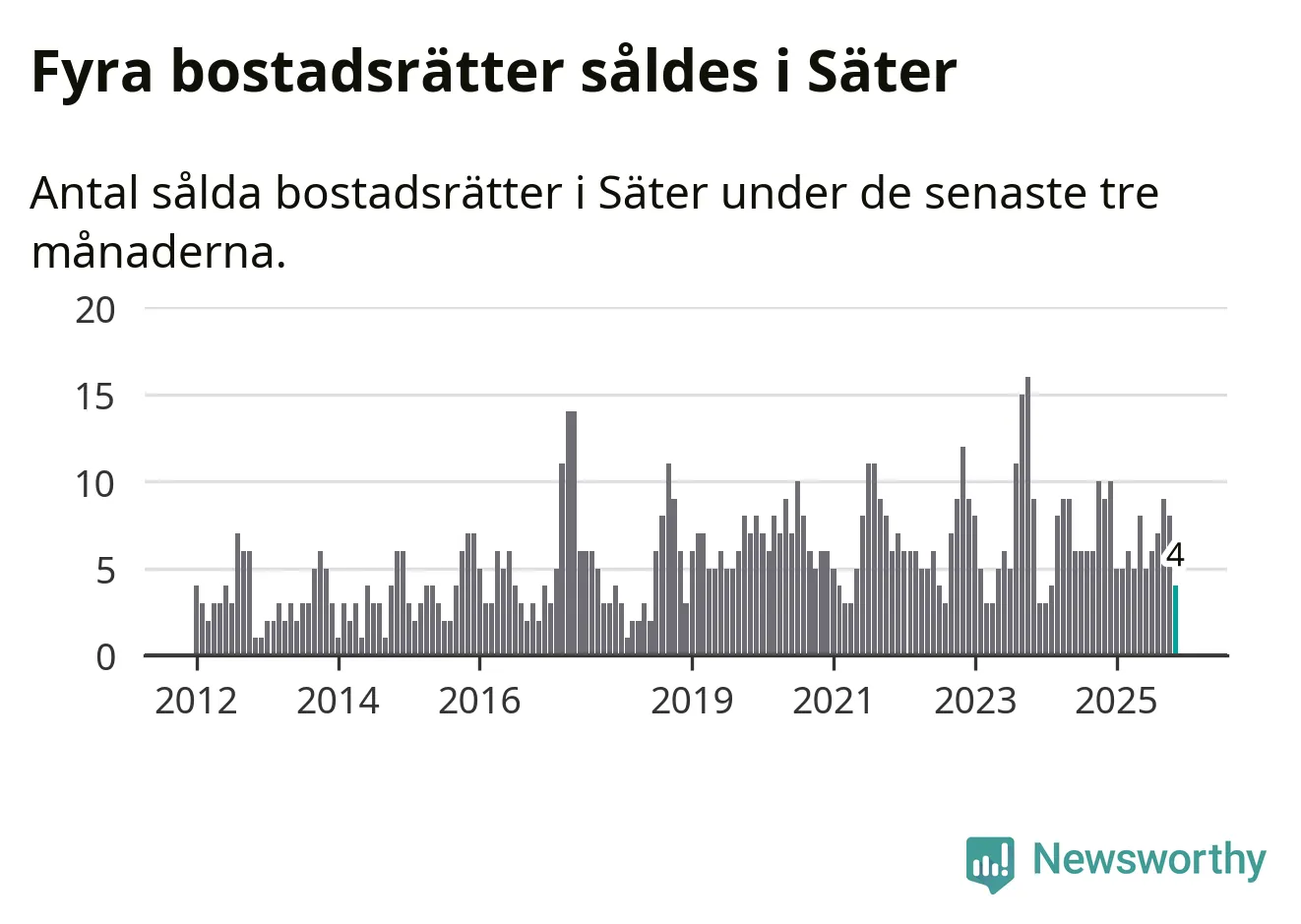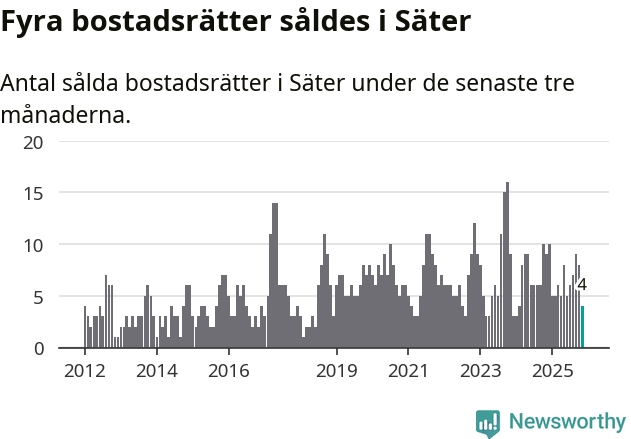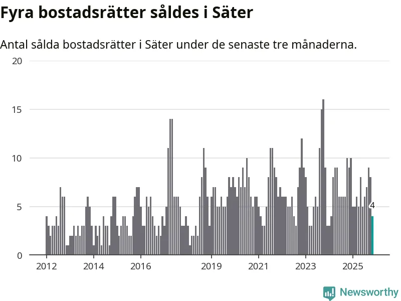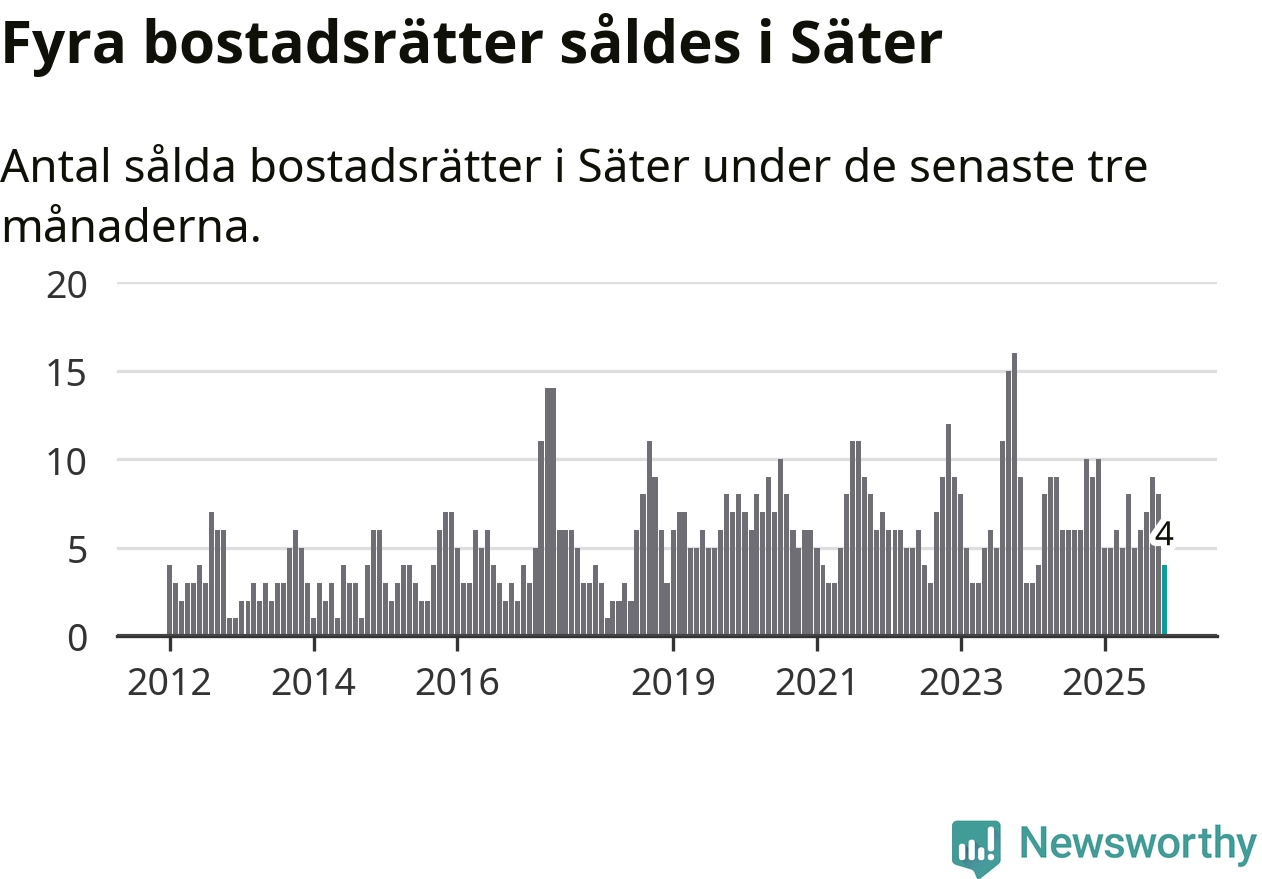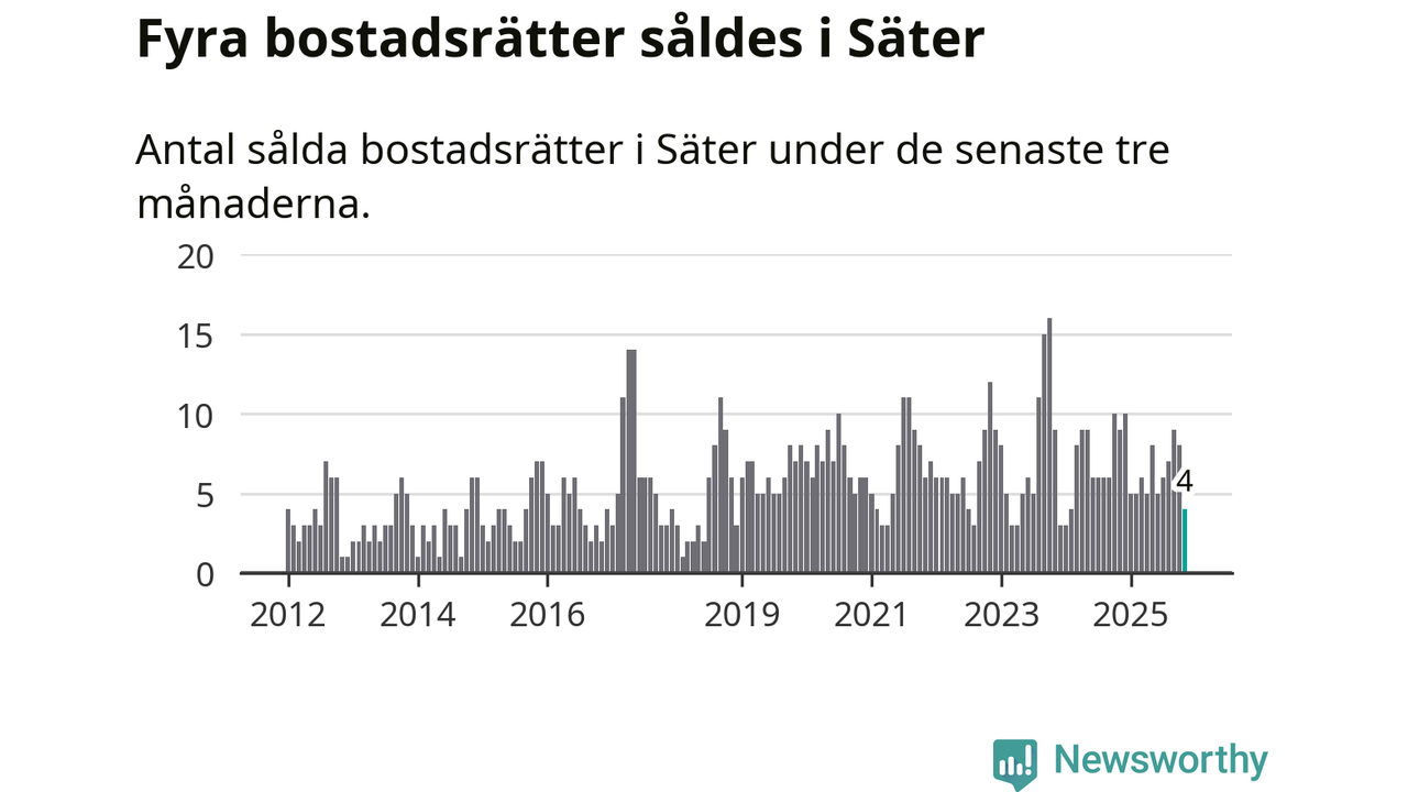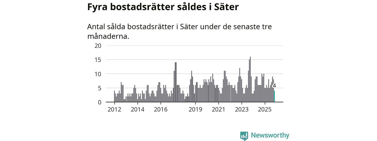 Mellan september och november gjordes sammanlagt fyra affärer med bostadsrätter i Säters kommun. Det kan jämföras med nio vid motsvarande tid i fjol.