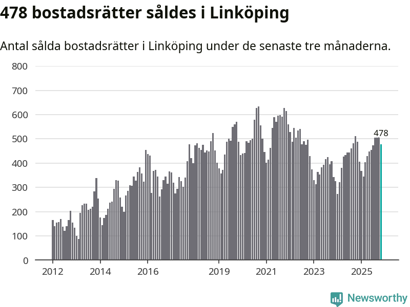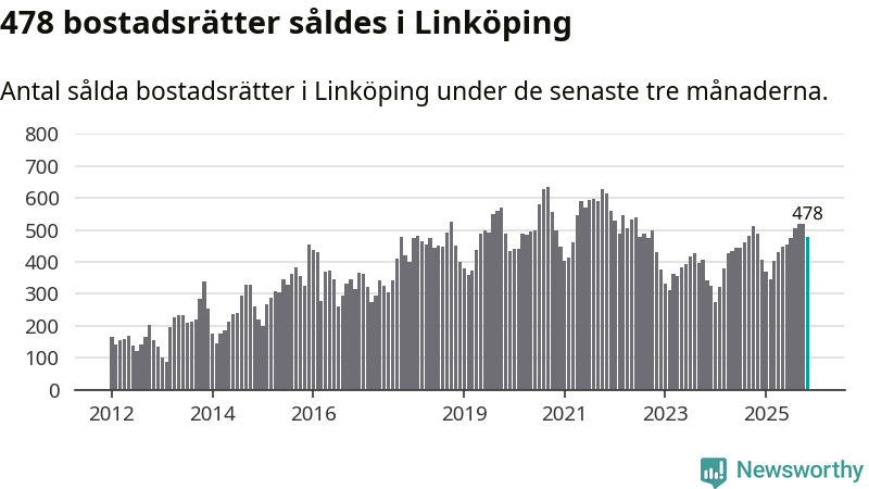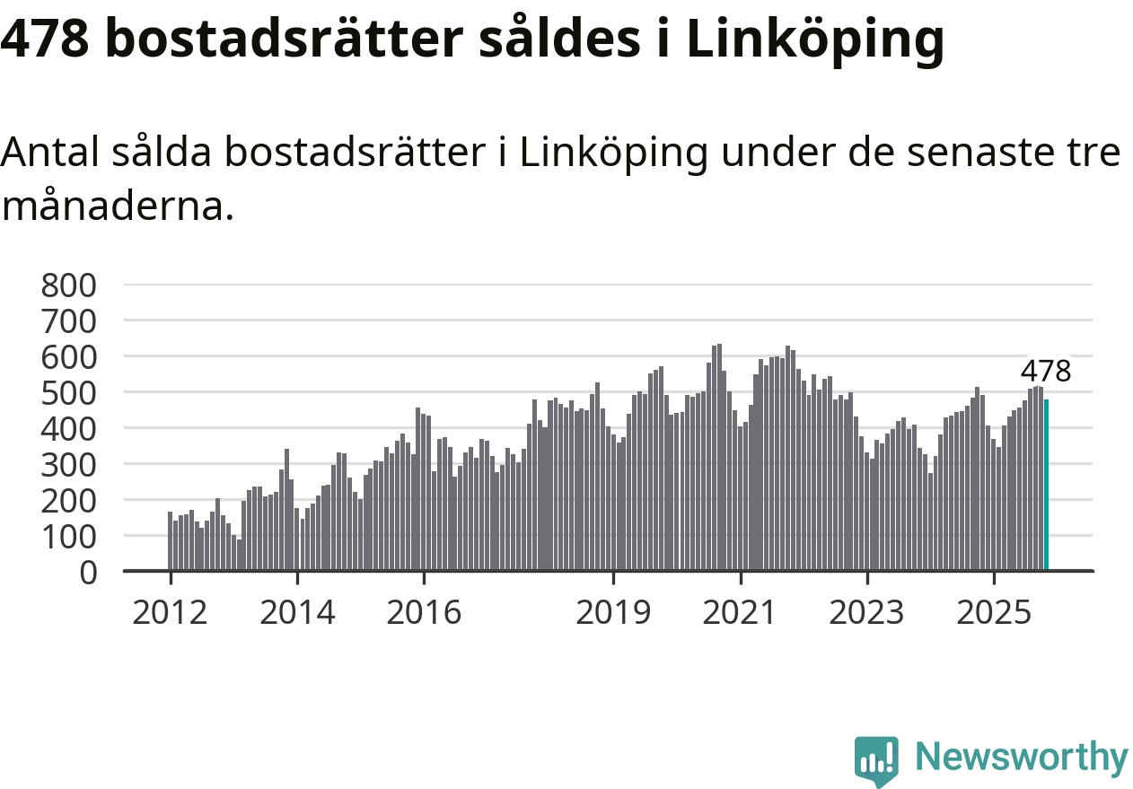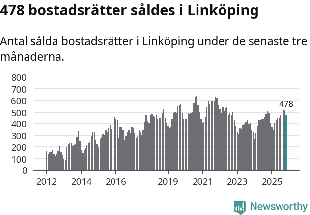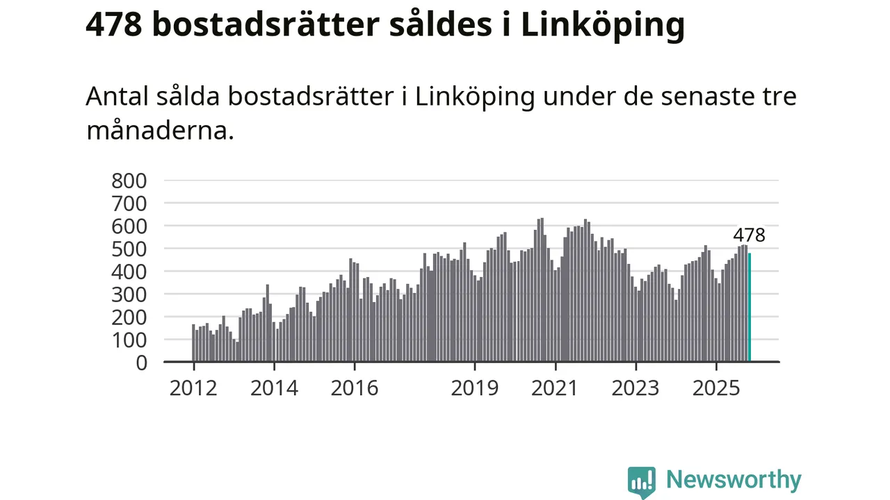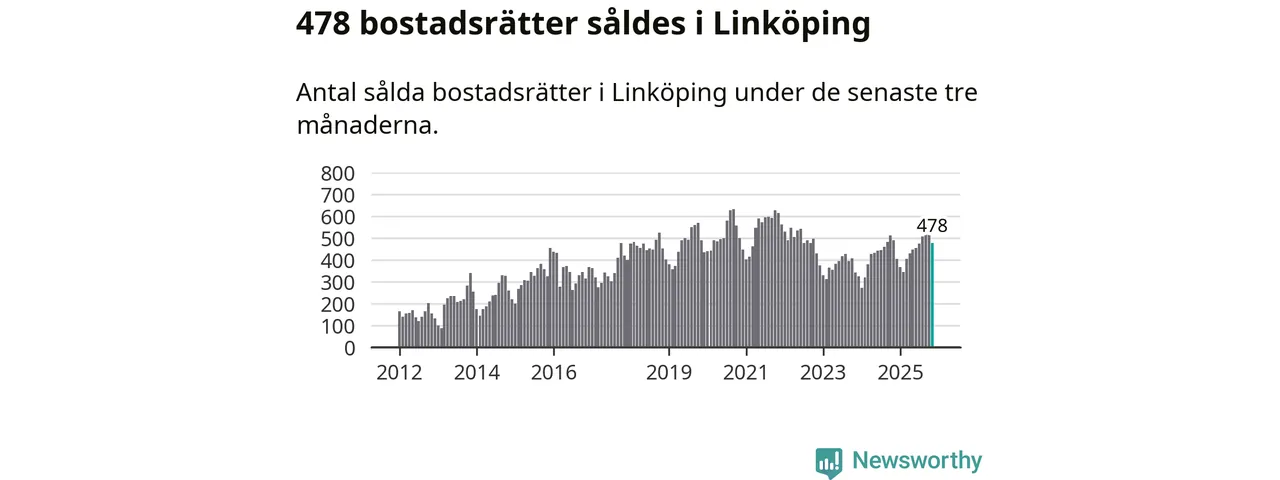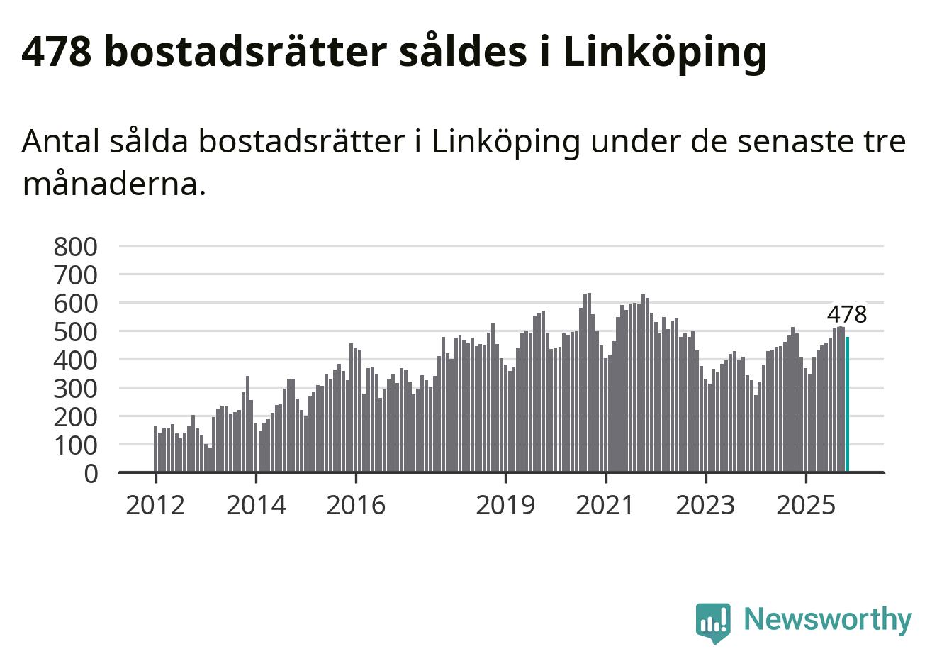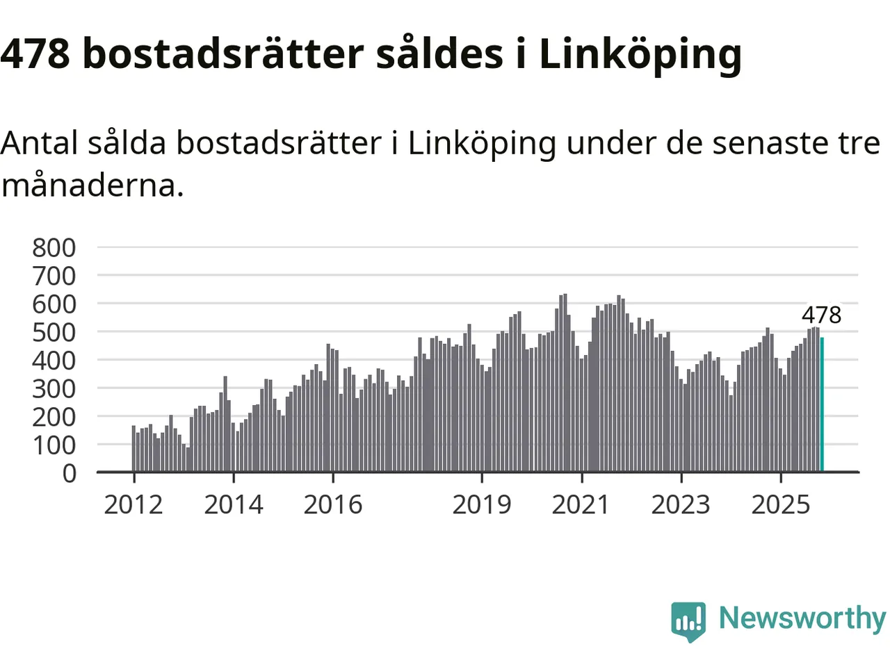 Sammanlagt såldes 478 bostadsrätter i Linköpings kommun mellan september och november till ett genomsnittligt pris på 2,2 miljoner kronor. I fjol gjordes 489 affärer vid den här tiden på året.