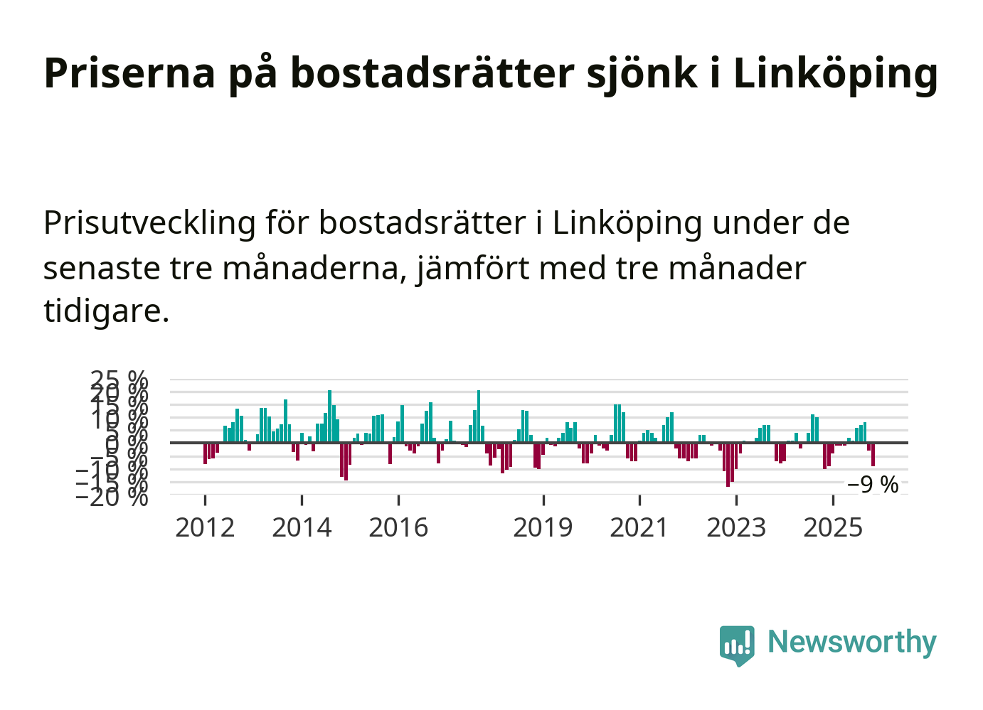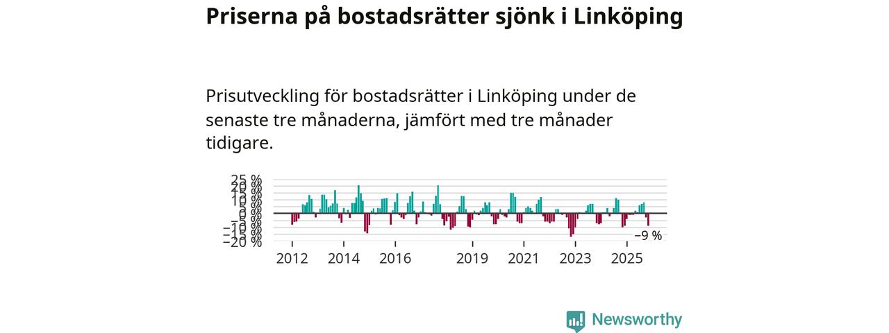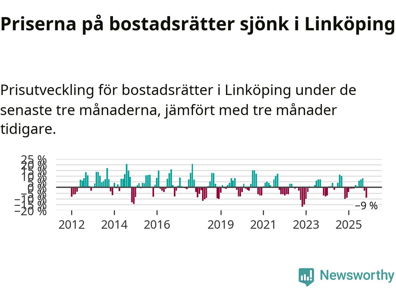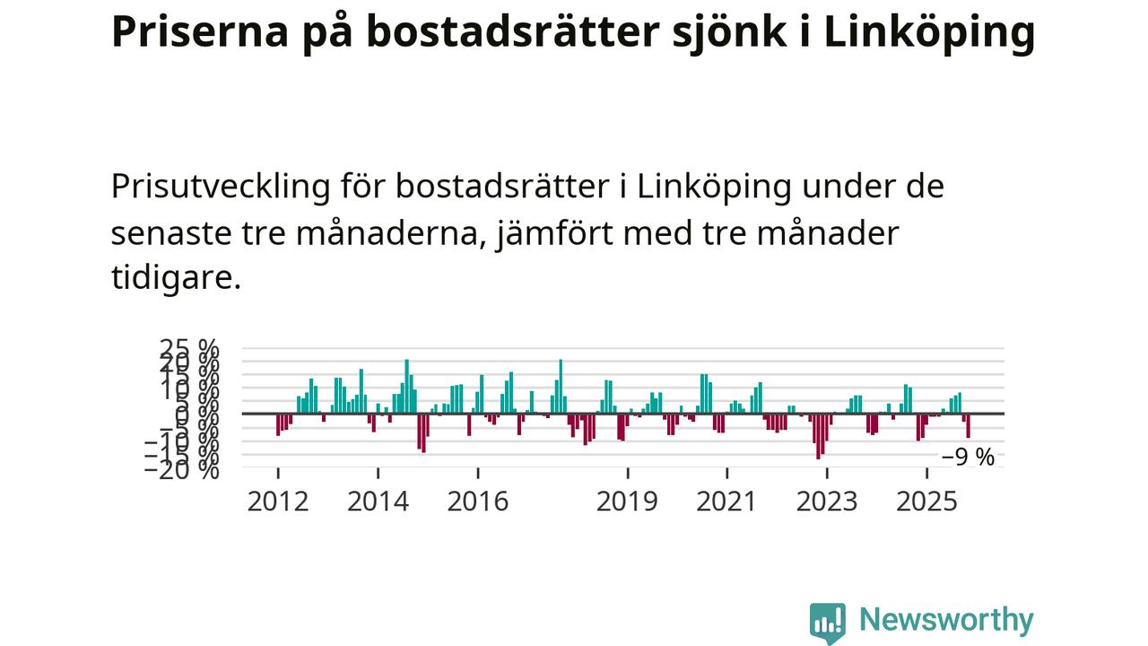 Priserna på bostadsrätter har gått ner i Linköpings kommun. Medelpriset på försäljningarna under de senaste tre månaderna visar på en nedgång med 9 procent.