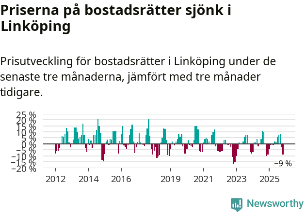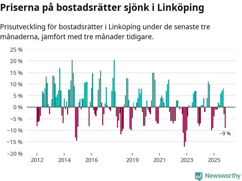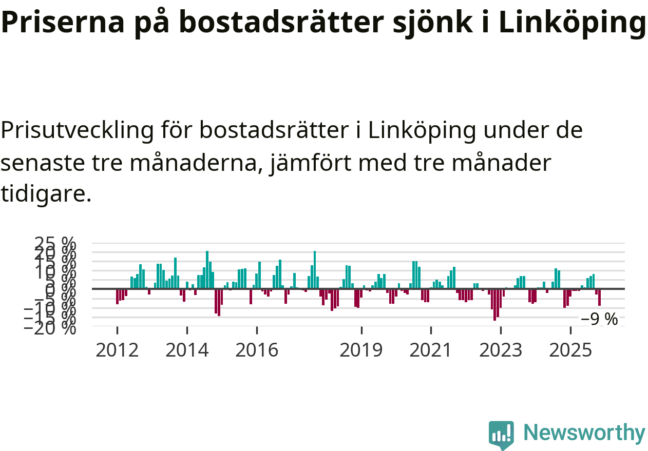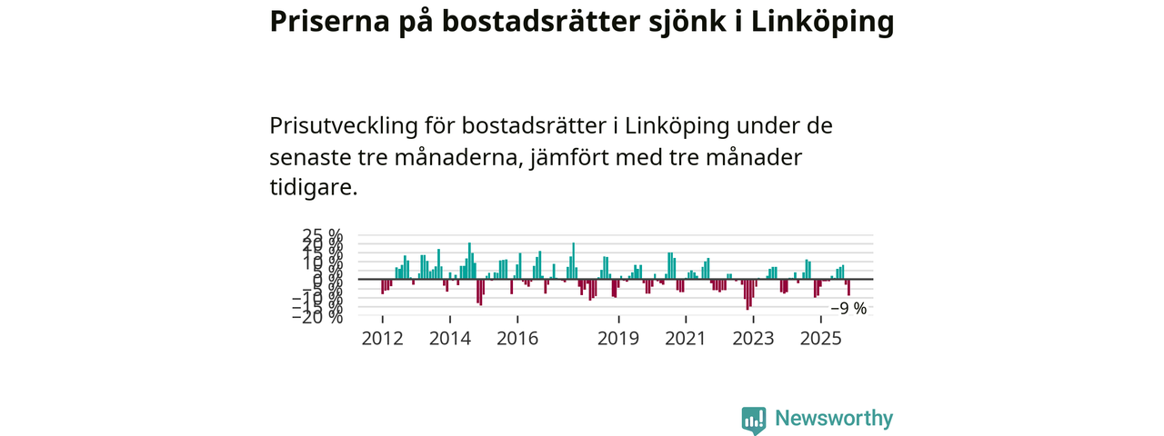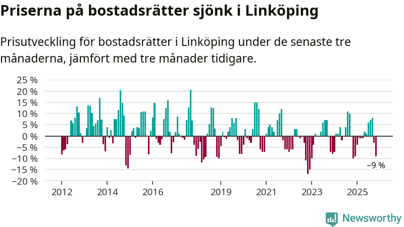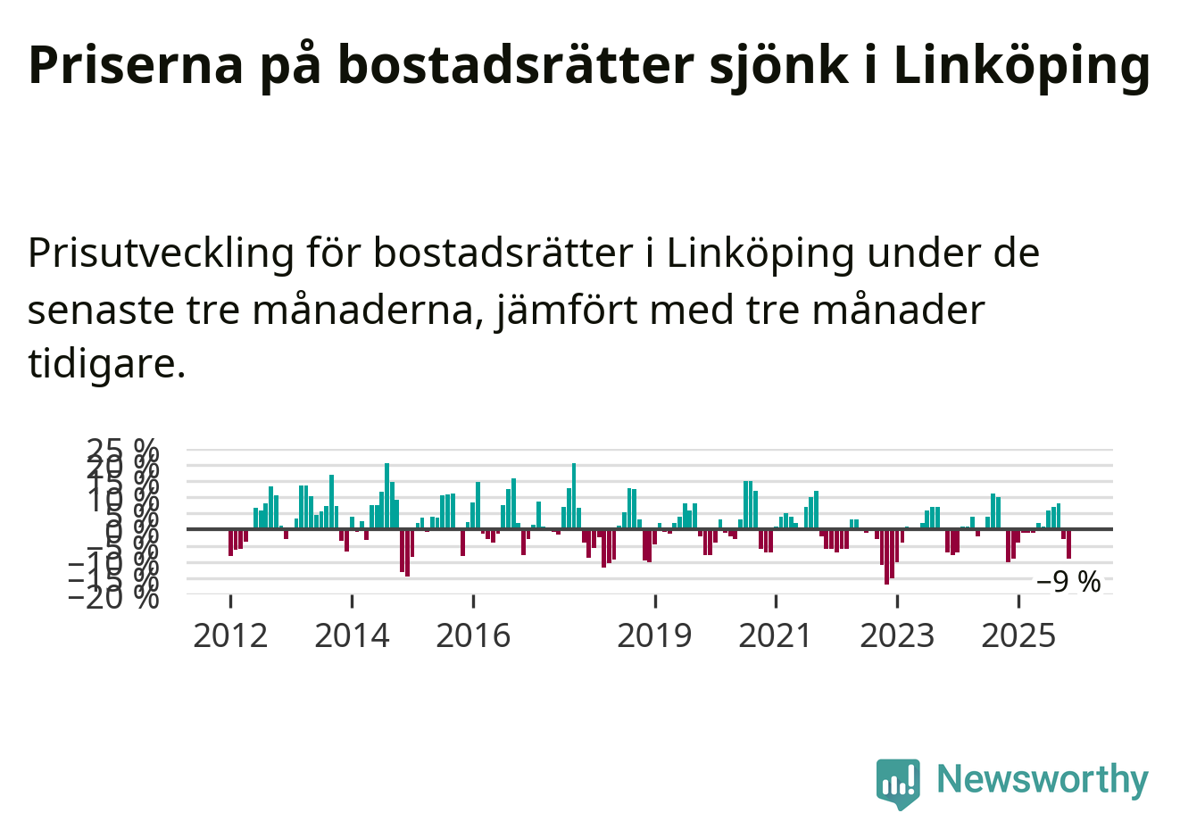 Priserna på bostadsrätter har gått ner i Linköpings kommun. Medelpriset på försäljningarna under de senaste tre månaderna visar på en nedgång med 9 procent.