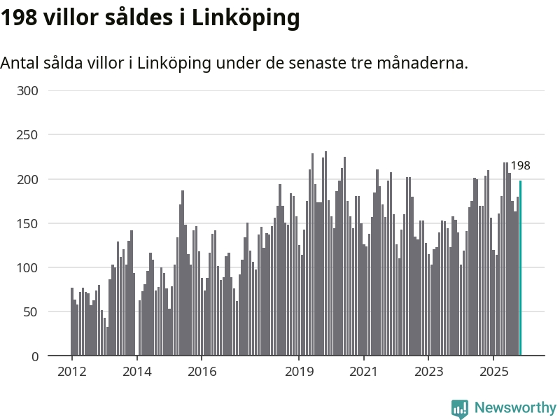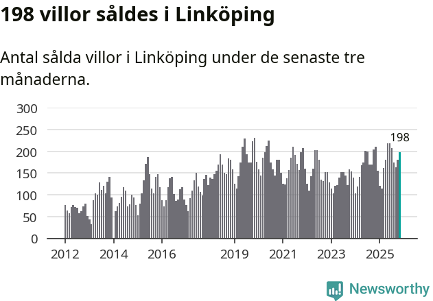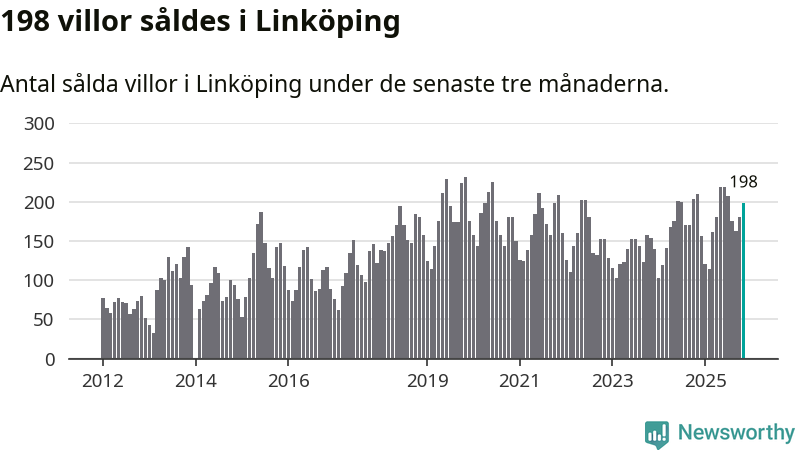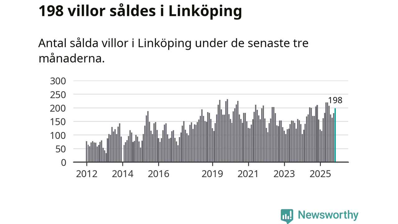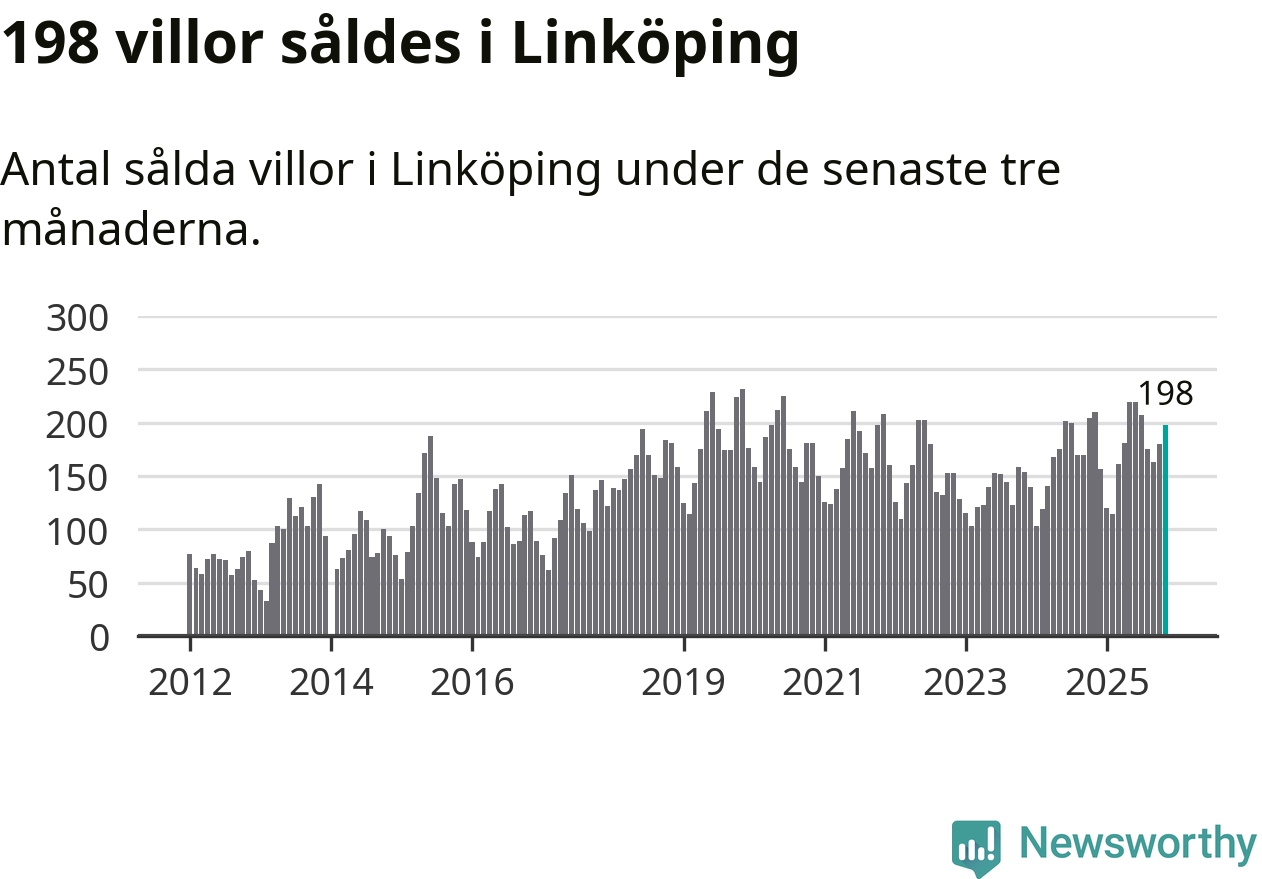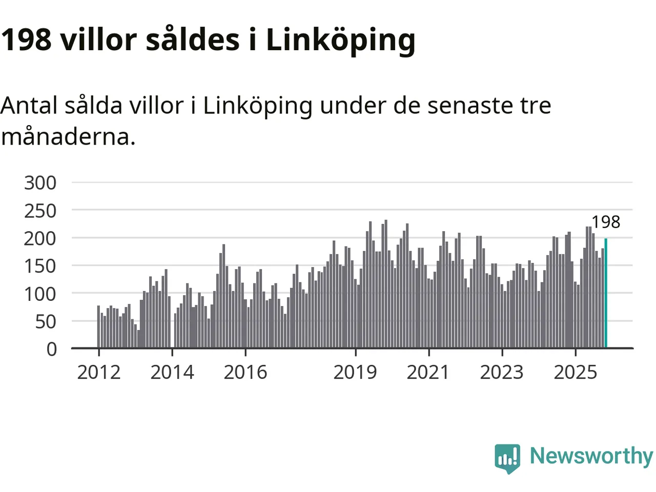 Sammanlagt såldes 198 villor i Linköpings kommun mellan september och november till ett genomsnittligt pris på 4,6 miljoner kronor. I fjol gjordes 210 affärer vid den här tiden på året.