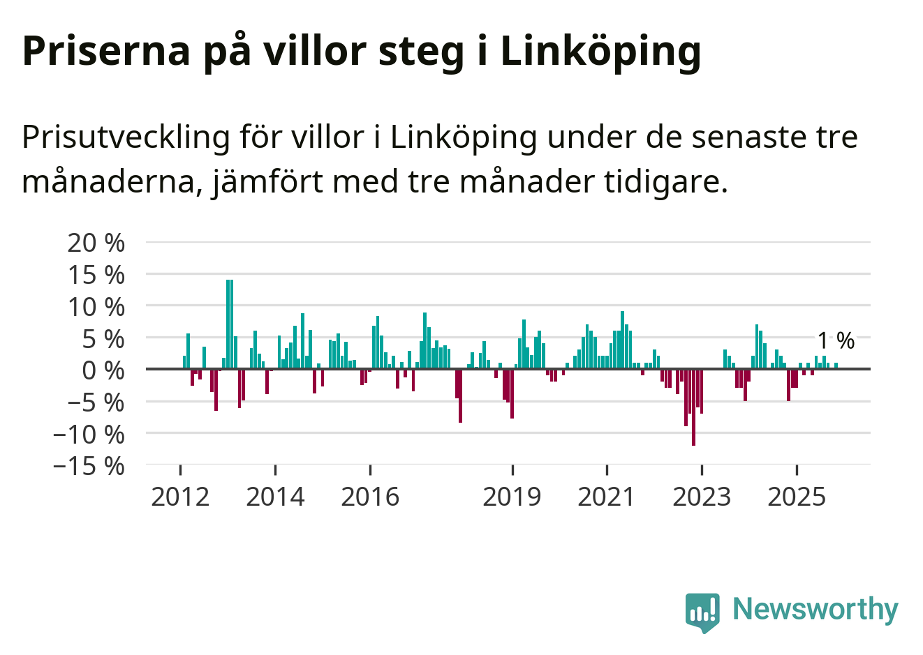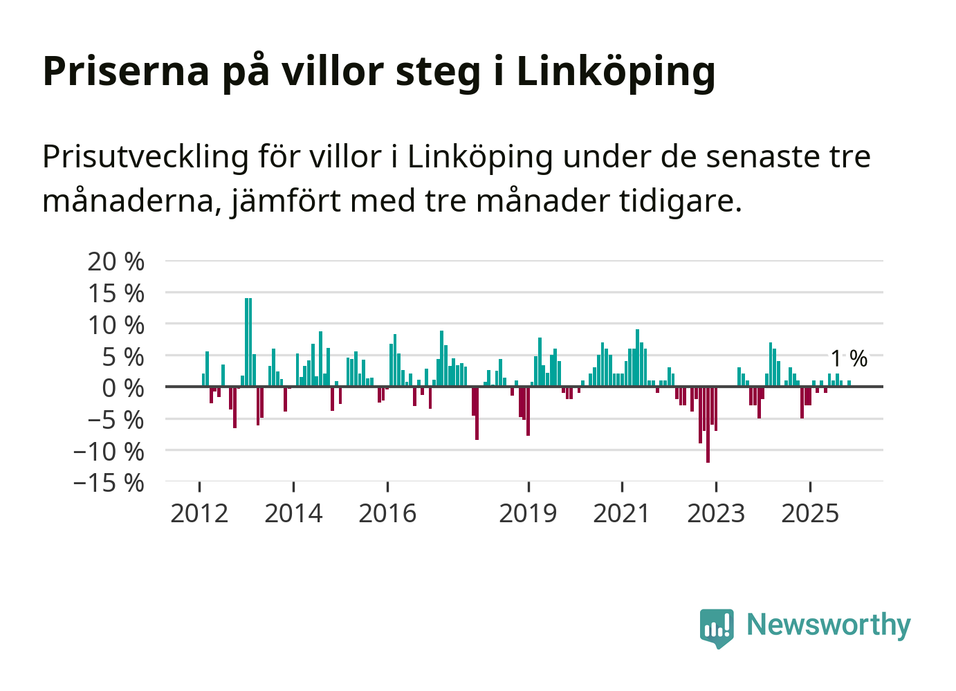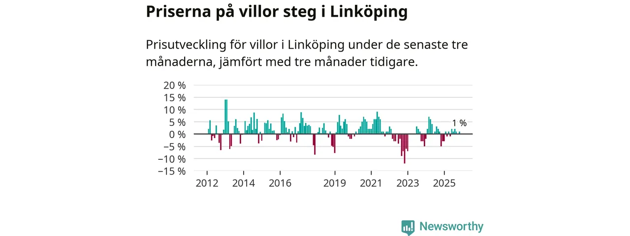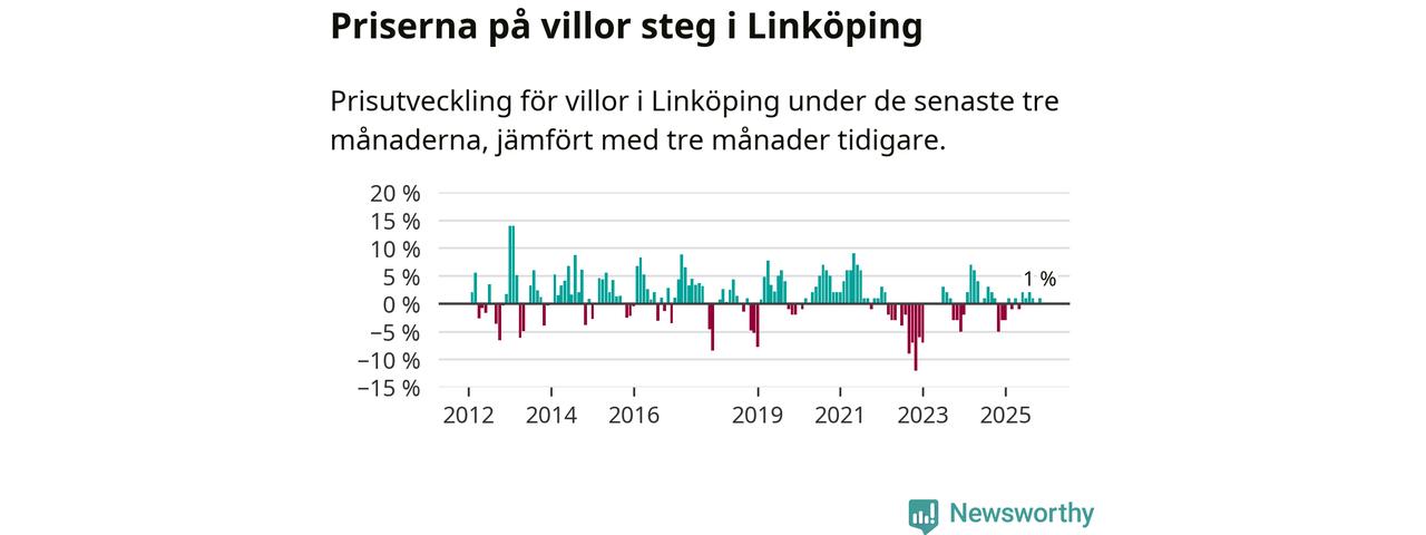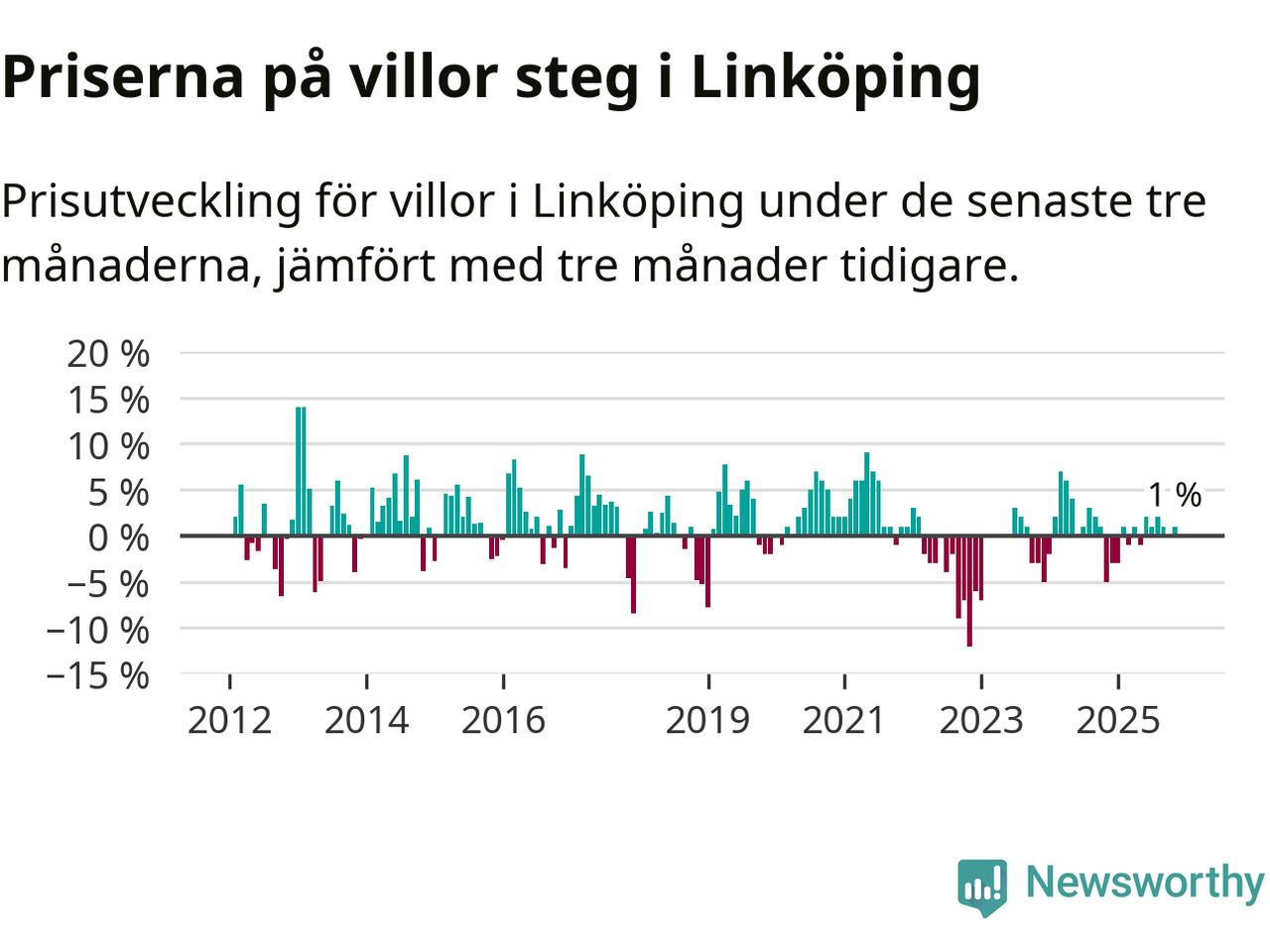 Villapriserna har gått upp i Linköpings kommun. Medelpriset på försäljningarna under de senaste tre månaderna visar på en uppgång med 1 procent.