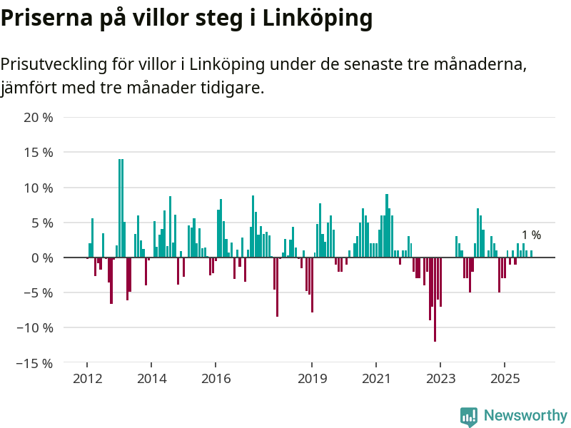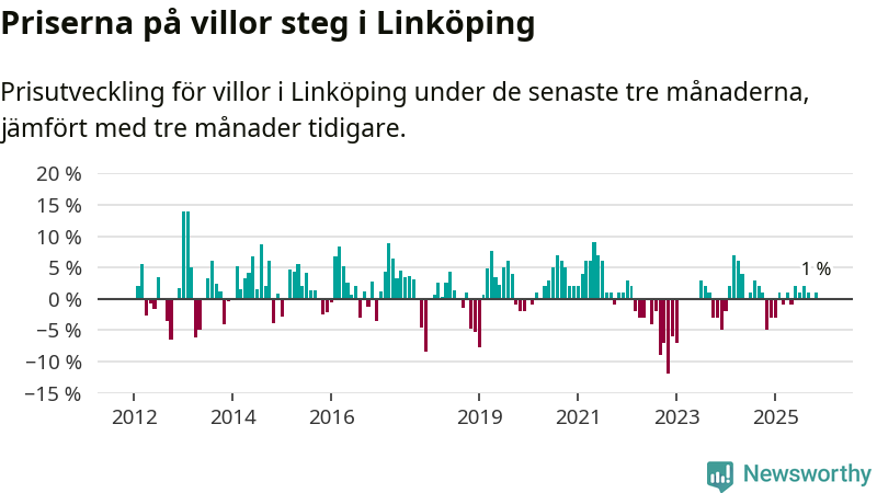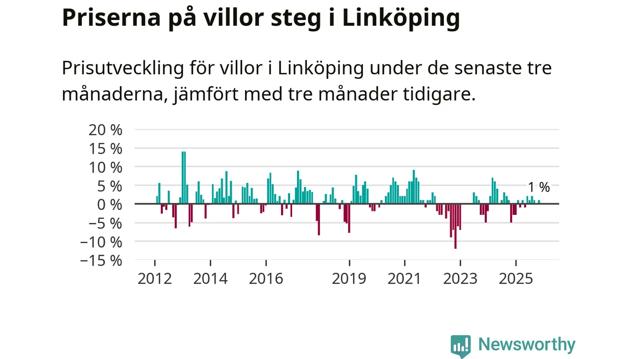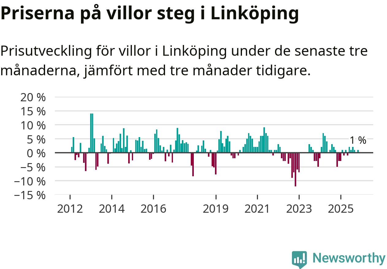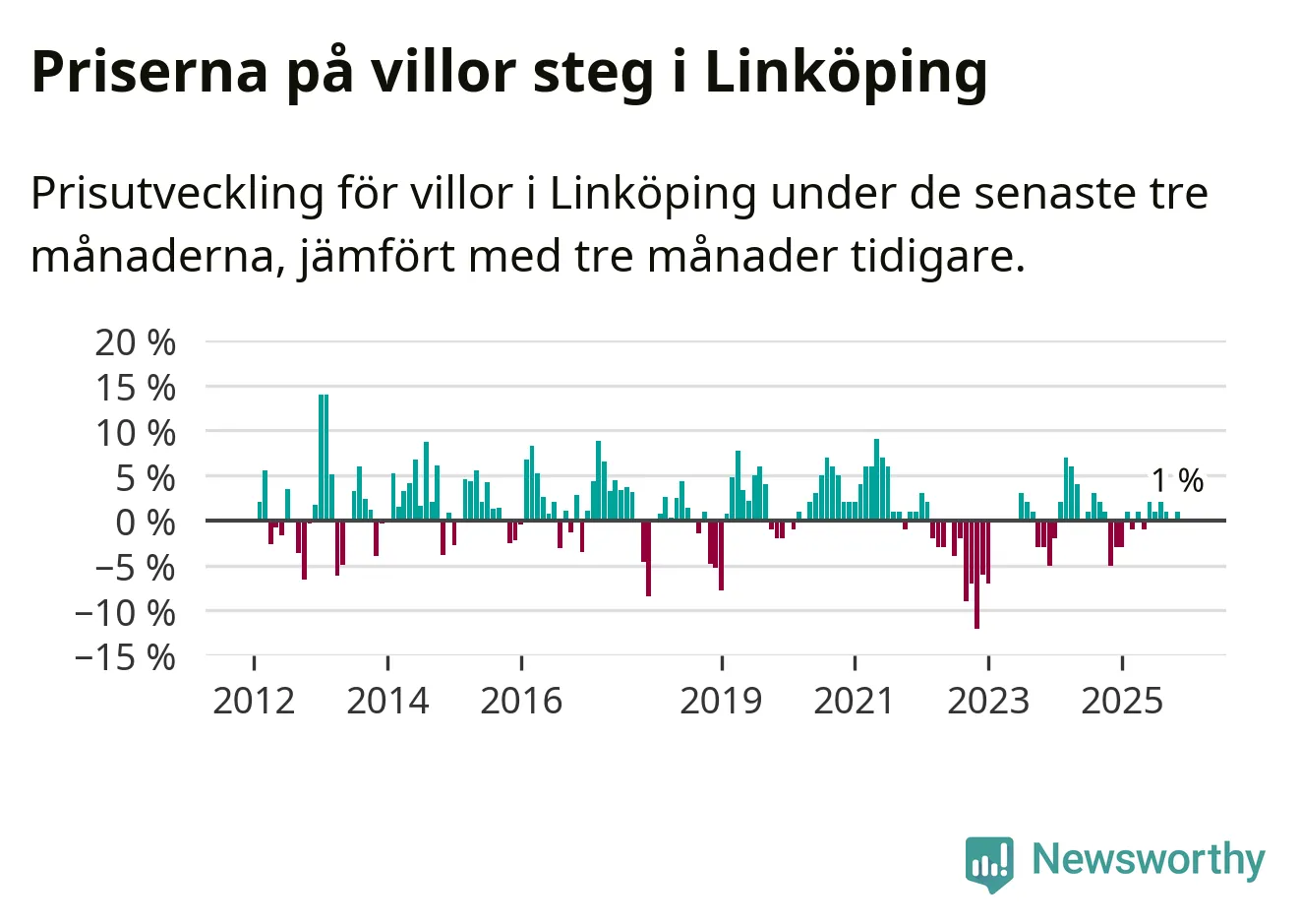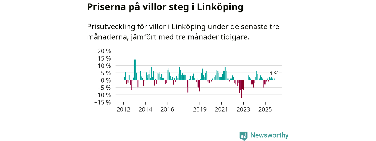 Villapriserna har gått upp i Linköpings kommun. Medelpriset på försäljningarna under de senaste tre månaderna visar på en uppgång med 1 procent.