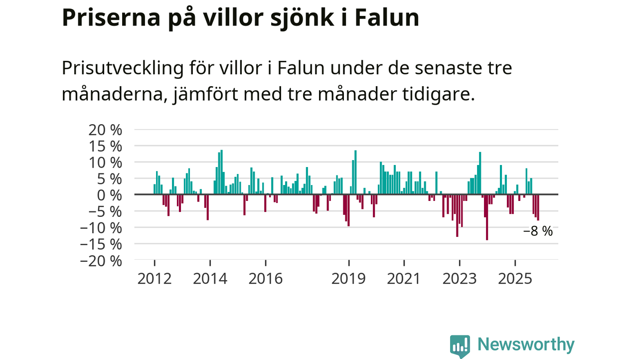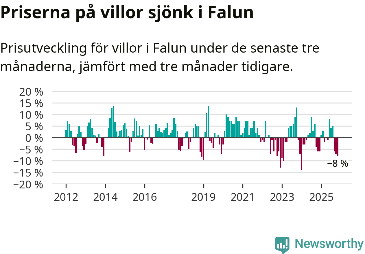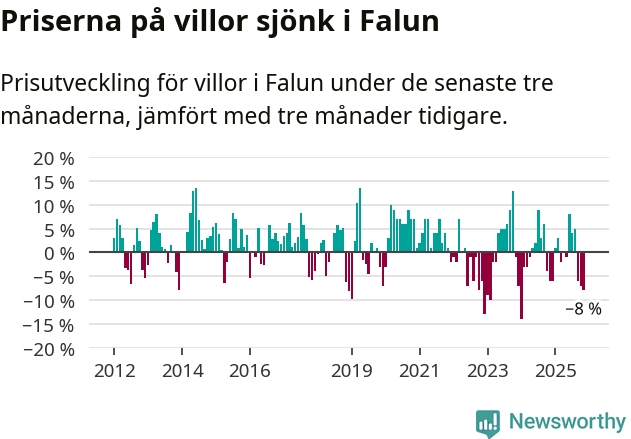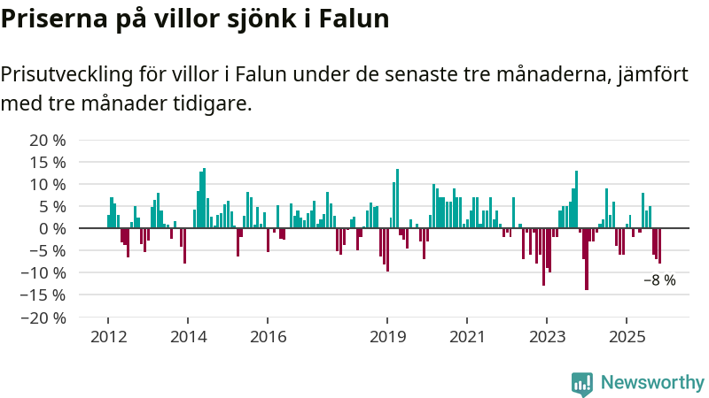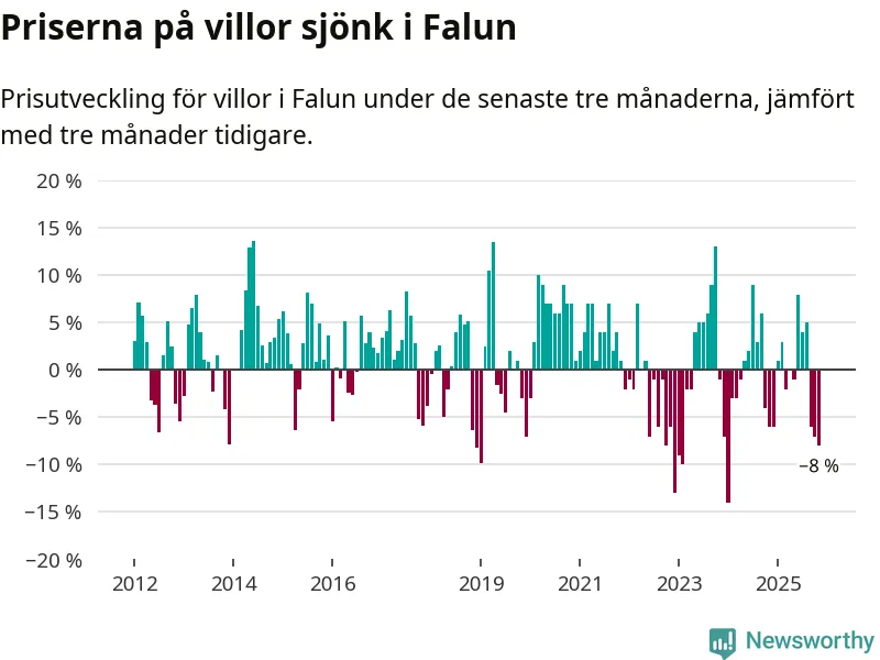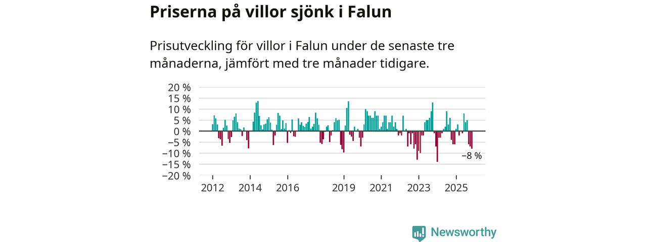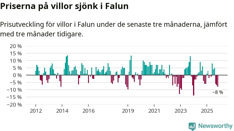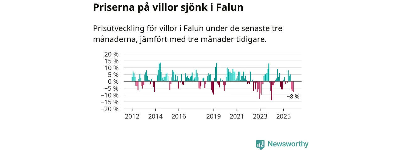 Villapriserna har gått ner i Falu kommun. Medelpriset på försäljningarna under de senaste tre månaderna visar på en nedgång med 8 procent.