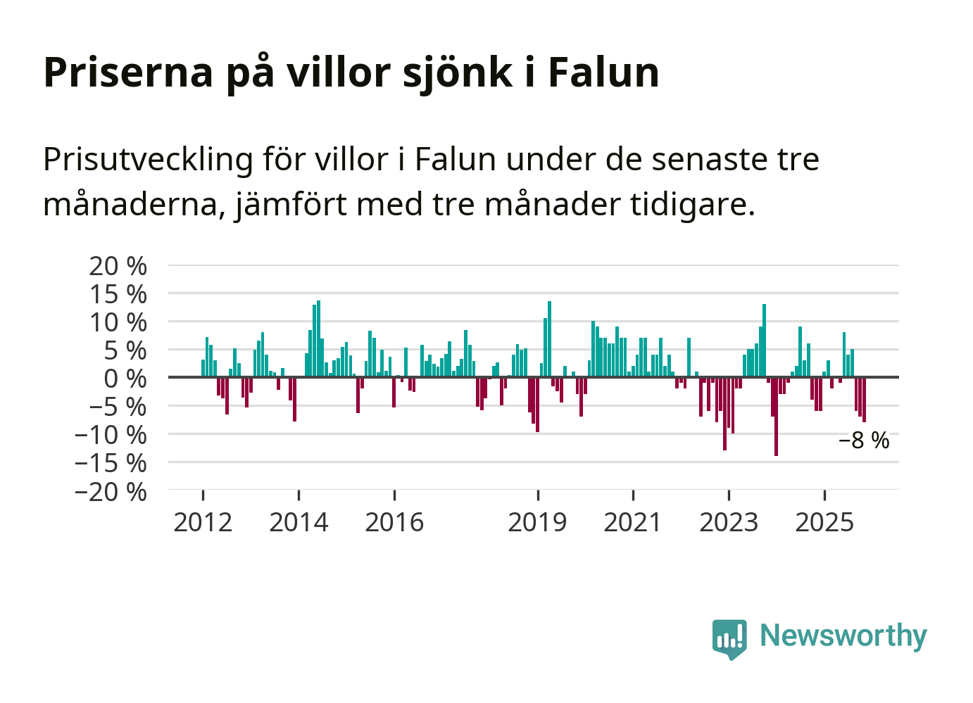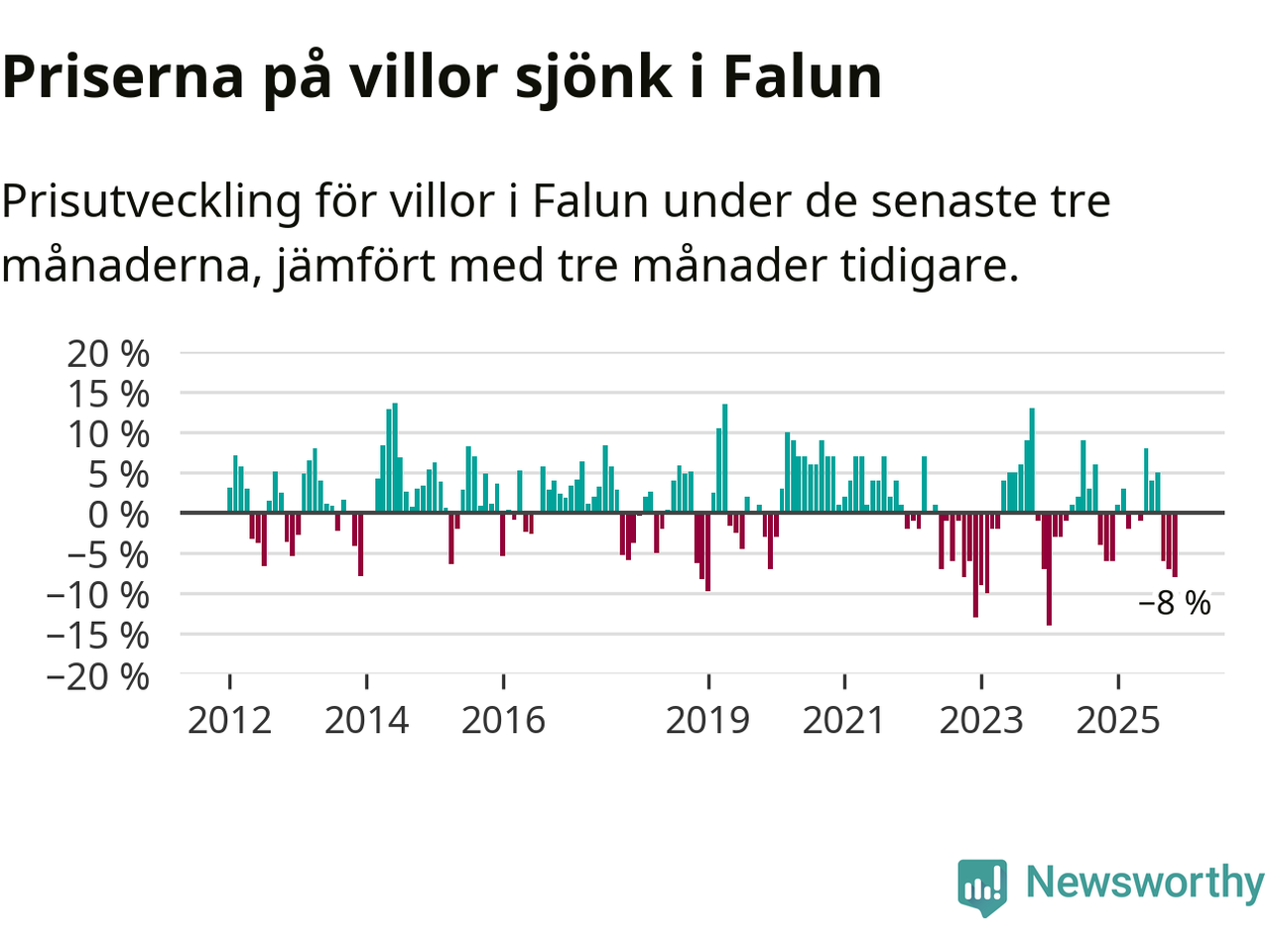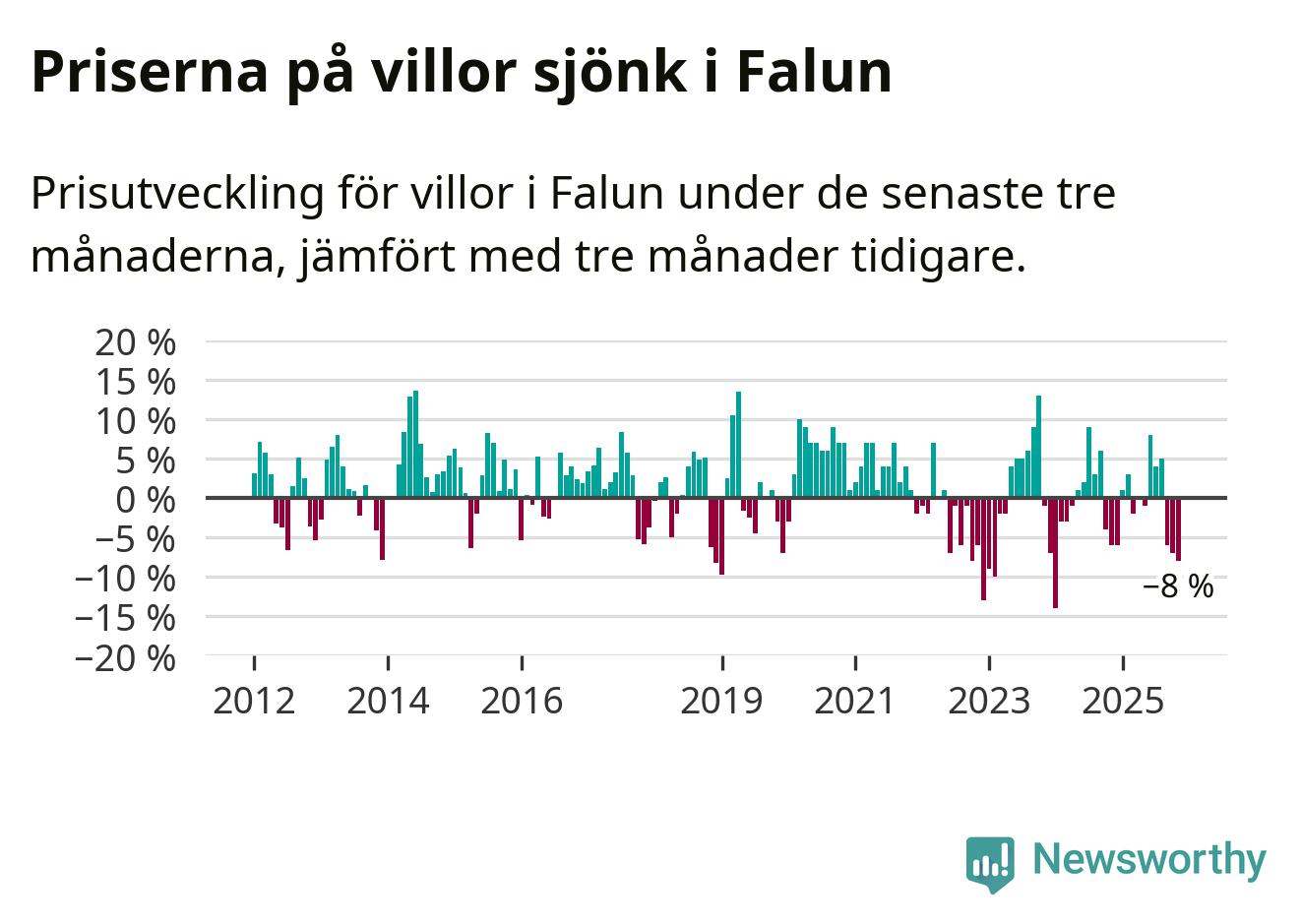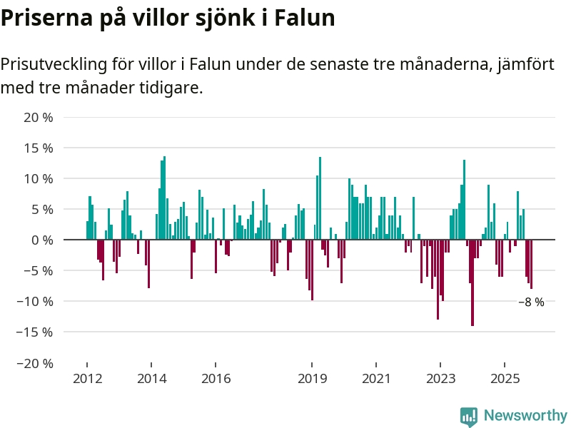 Villapriserna har gått ner i Falu kommun. Medelpriset på försäljningarna under de senaste tre månaderna visar på en nedgång med 8 procent.