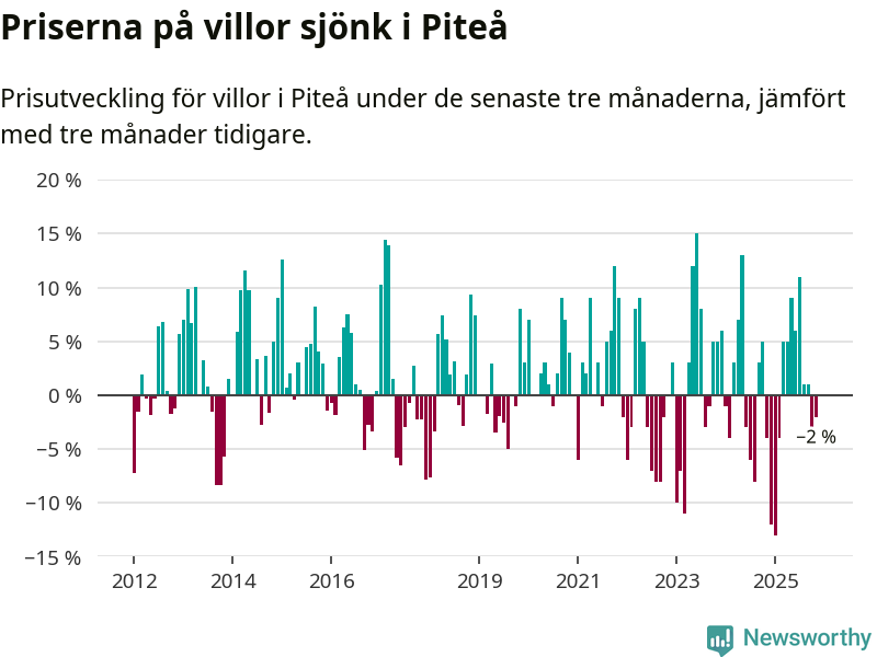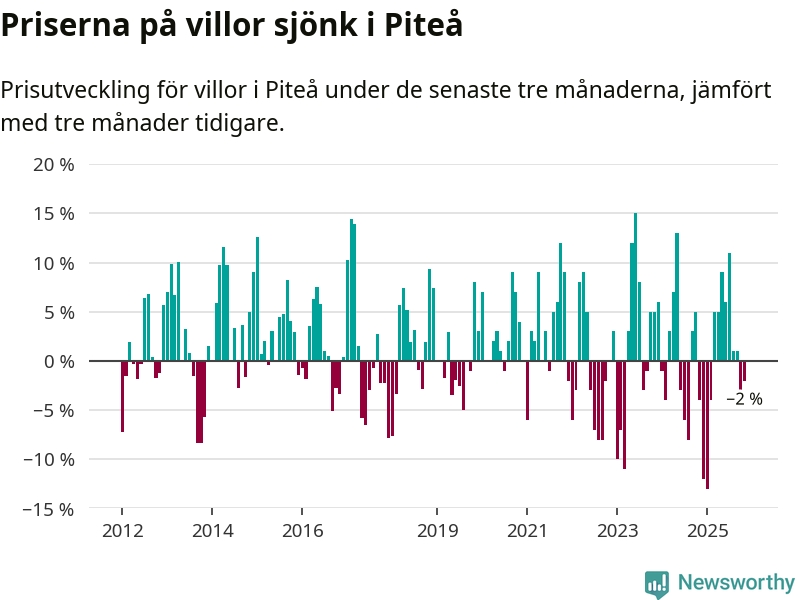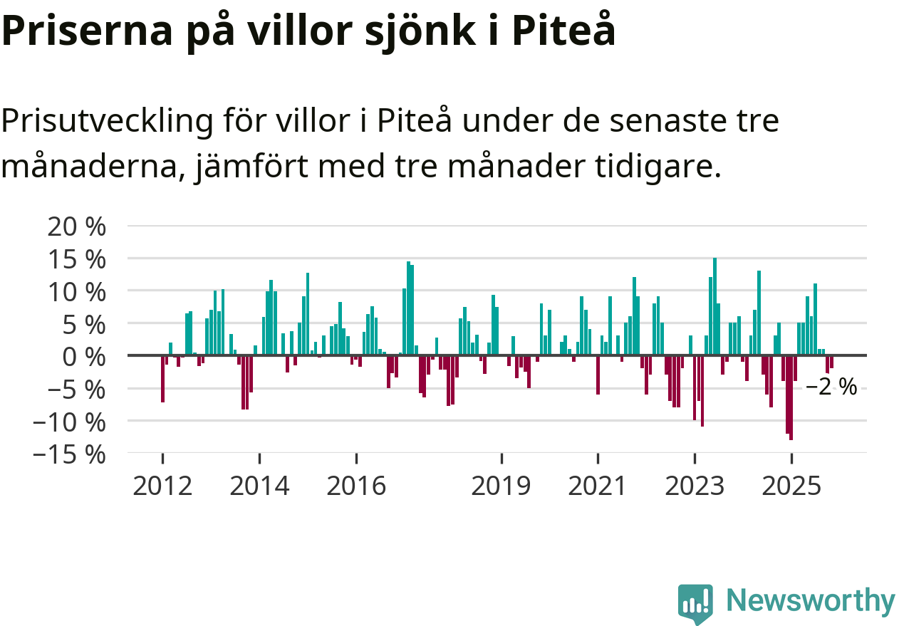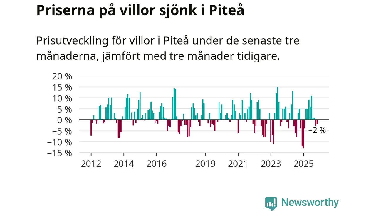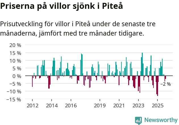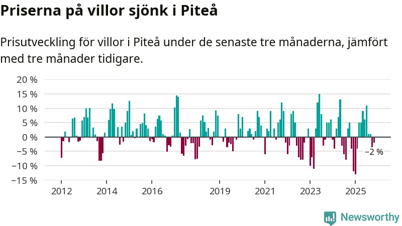 Villapriserna har gått ner i Piteå kommun. Medelpriset på försäljningarna under de senaste tre månaderna visar på en nedgång med 2 procent.