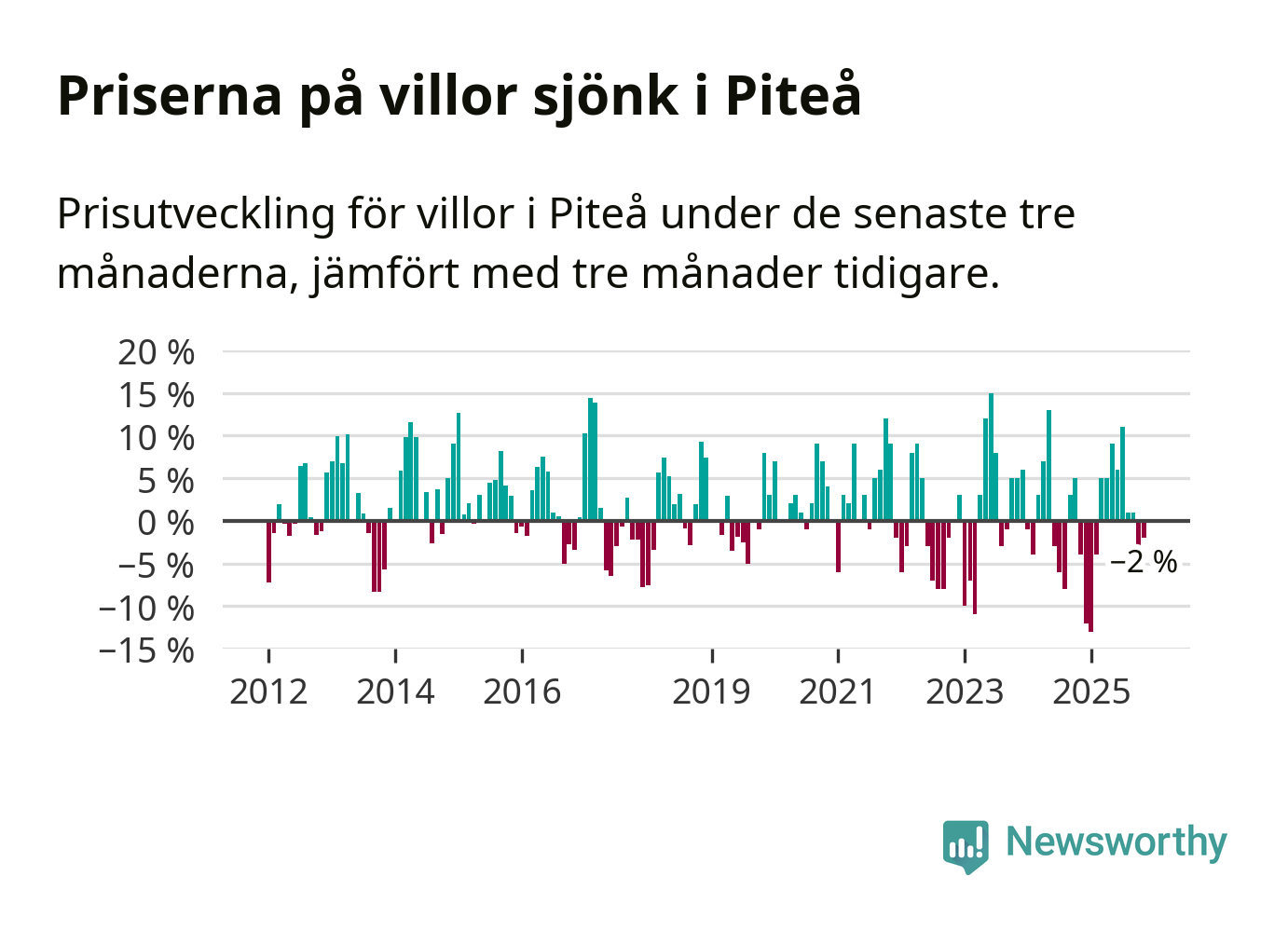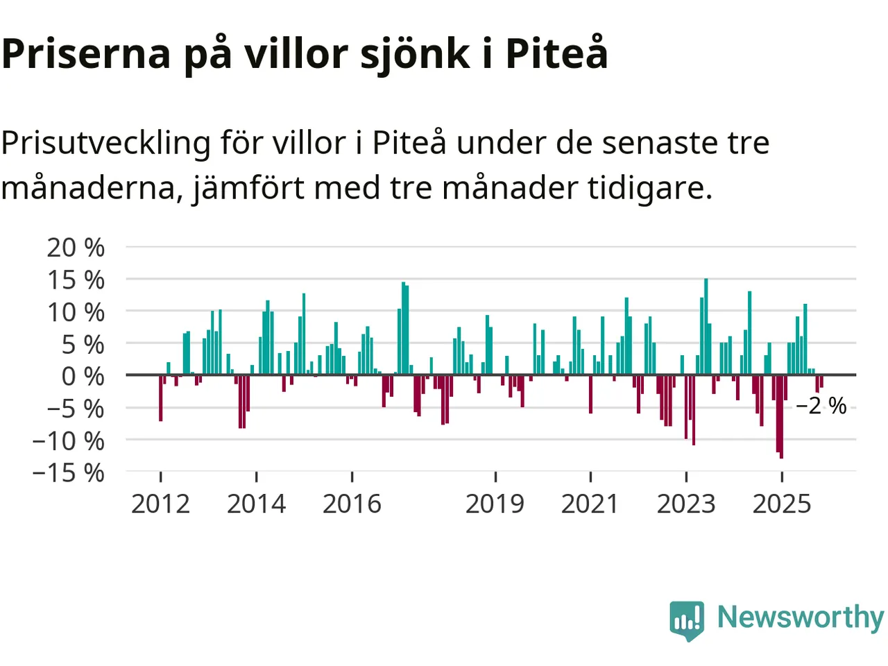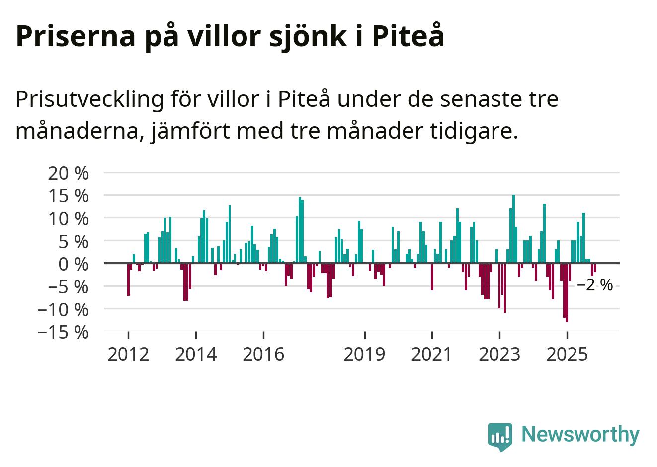 Villapriserna har gått ner i Piteå kommun. Medelpriset på försäljningarna under de senaste tre månaderna visar på en nedgång med 2 procent.