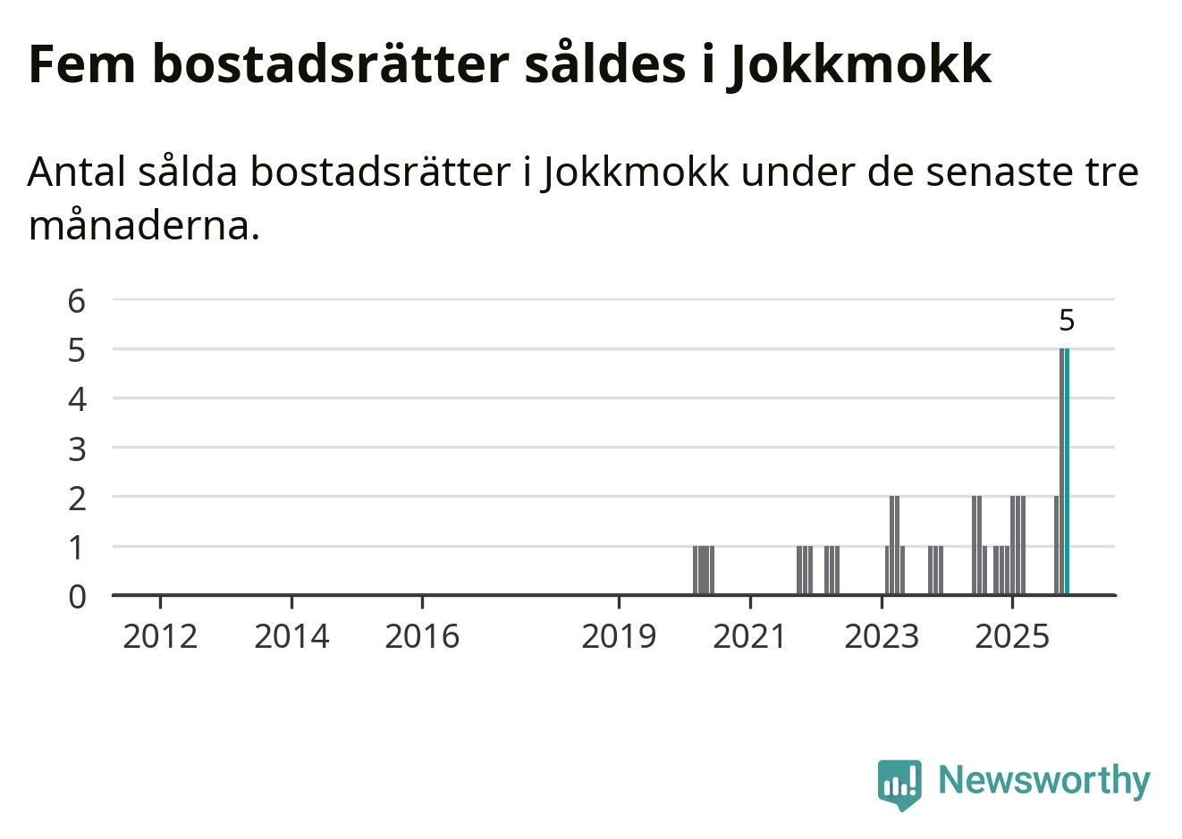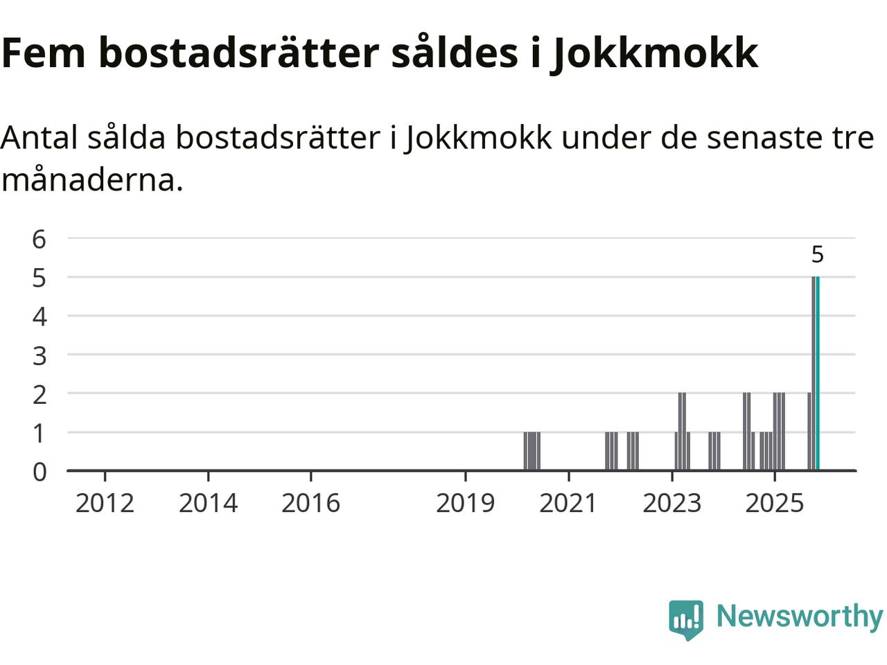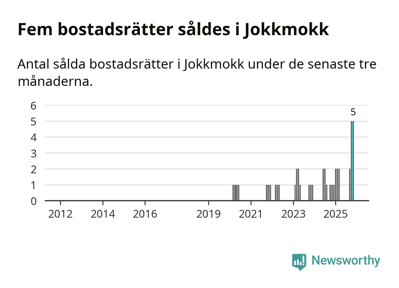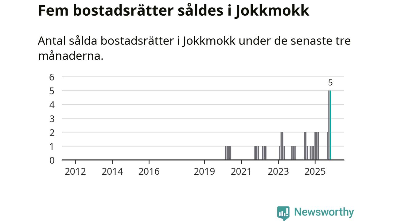 Mellan september och november gjordes sammanlagt fem affärer med bostadsrätter i Jokkmokks kommun. Det kan jämföras med ett vid motsvarande tid i fjol.