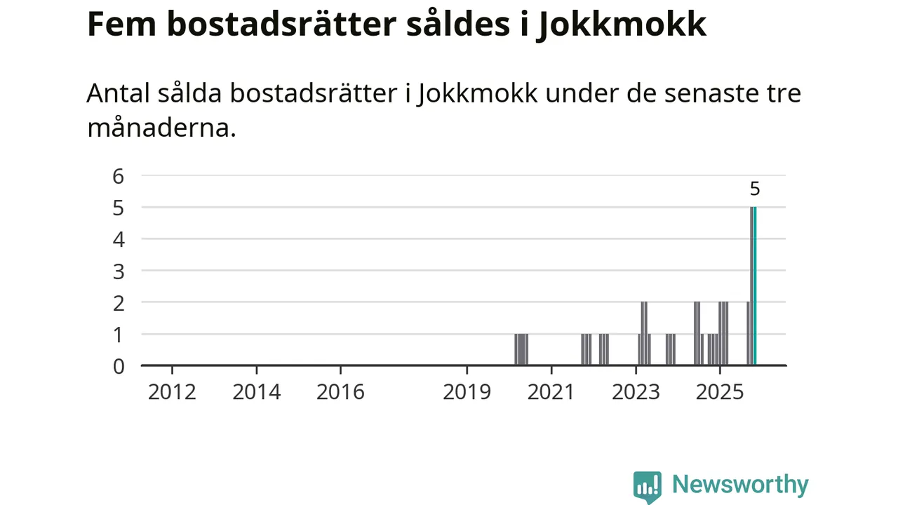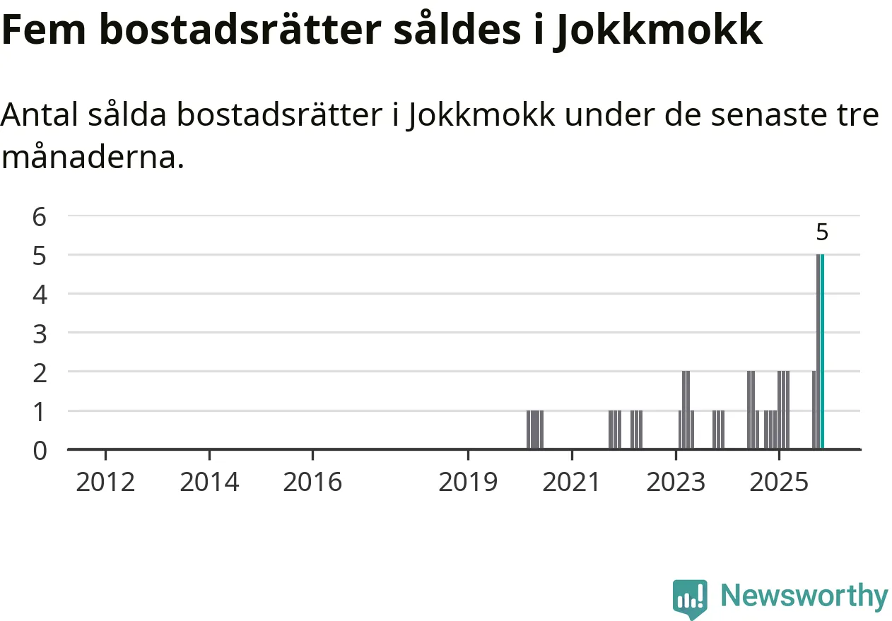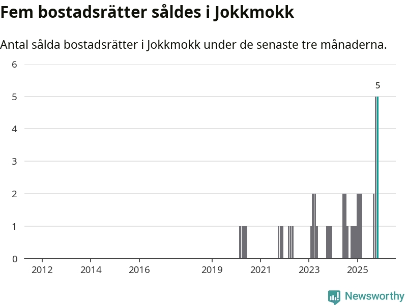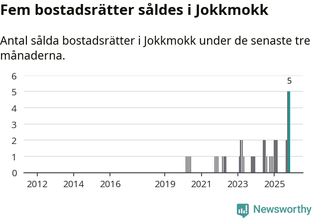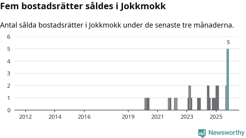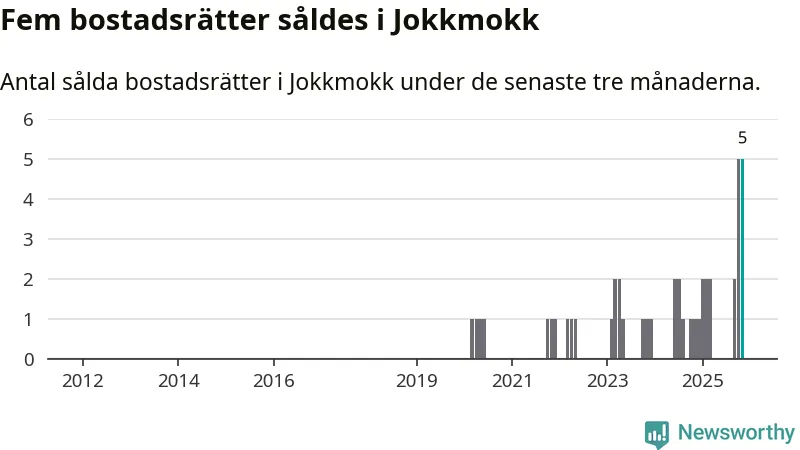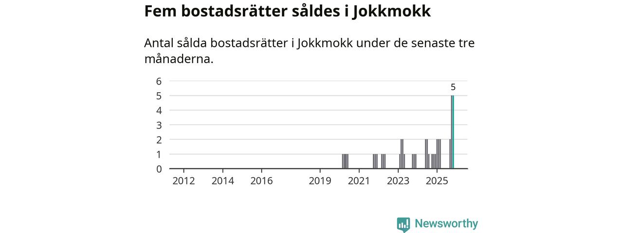 Mellan september och november gjordes sammanlagt fem affärer med bostadsrätter i Jokkmokks kommun. Det kan jämföras med ett vid motsvarande tid i fjol.