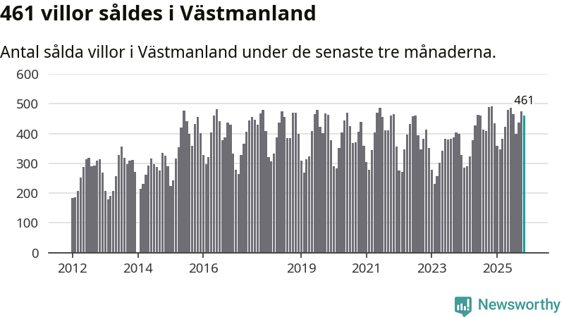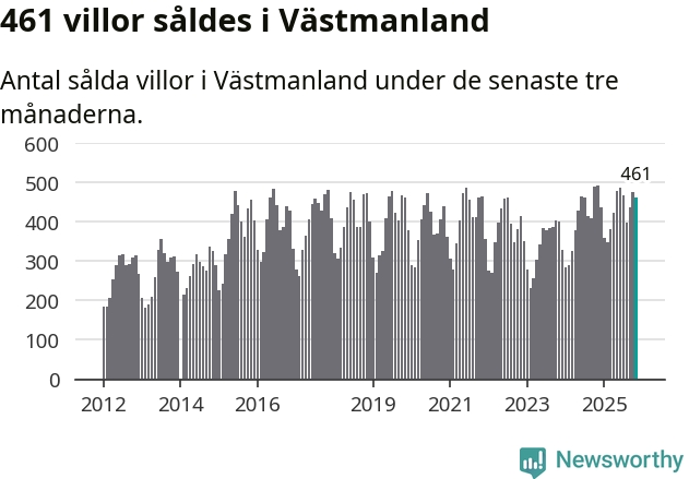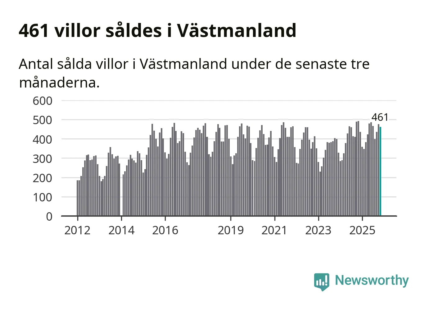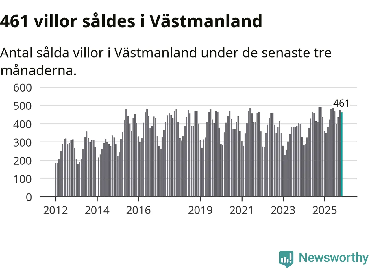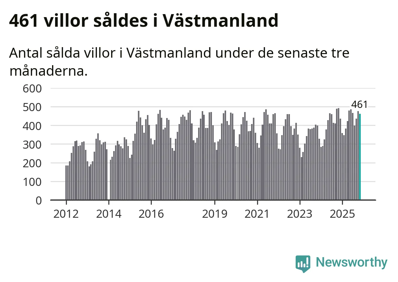 Sammanlagt såldes 461 villor i Västmanlands län mellan september och november till ett genomsnittligt pris på 3,2 miljoner kronor. I fjol gjordes 492 affärer vid den här tiden på året.
