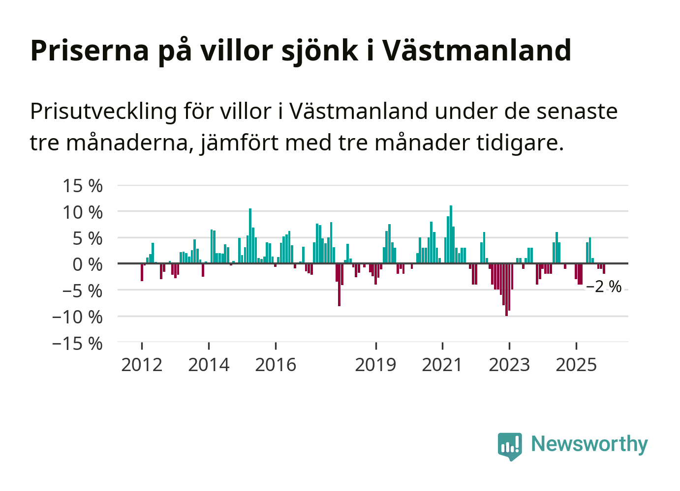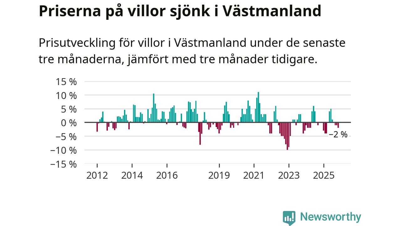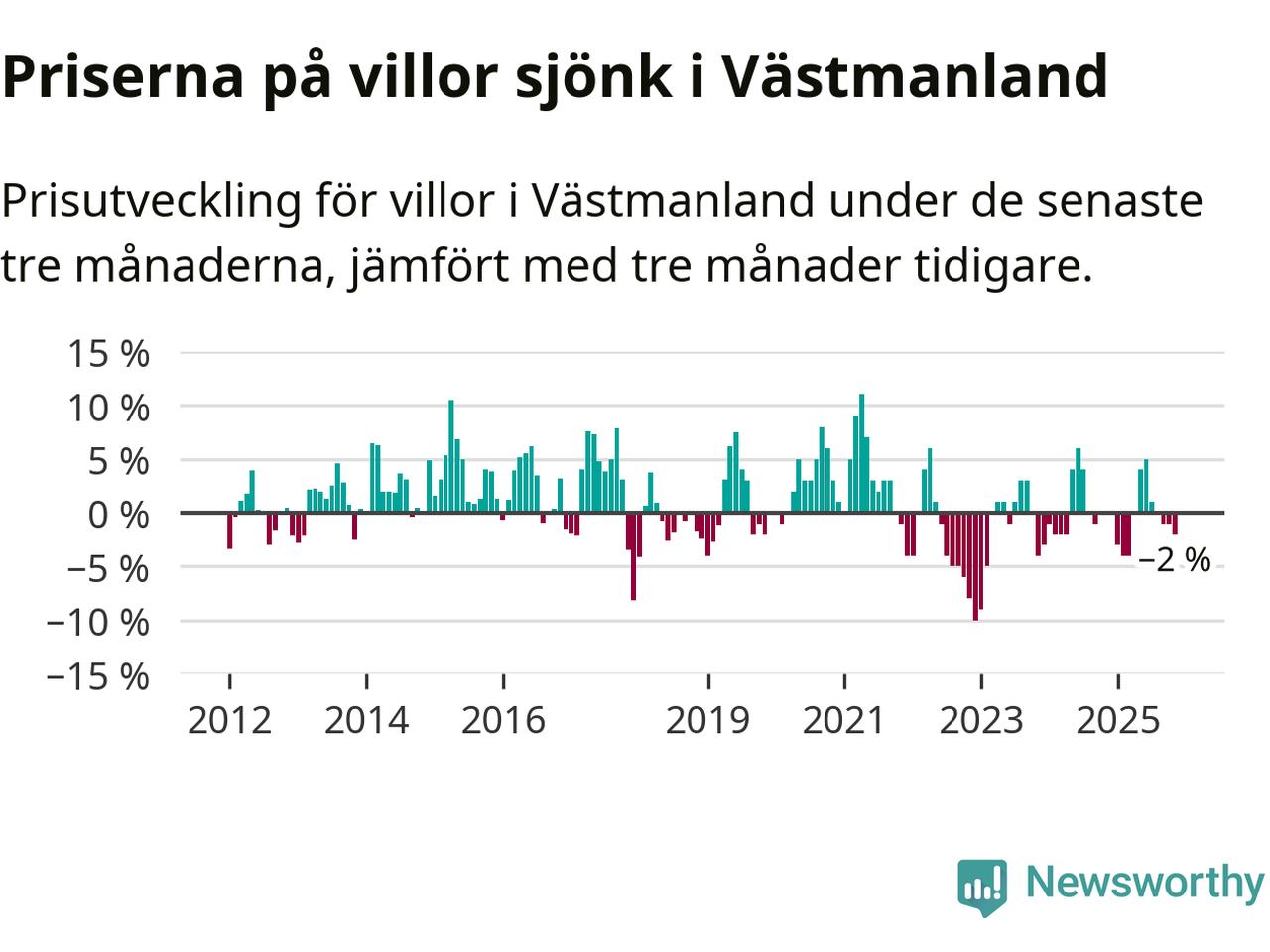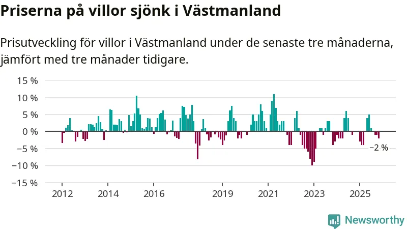 Villapriserna har gått ner i Västmanlands län. Medelpriset på försäljningarna under de senaste tre månaderna visar på en nedgång med 2 procent.