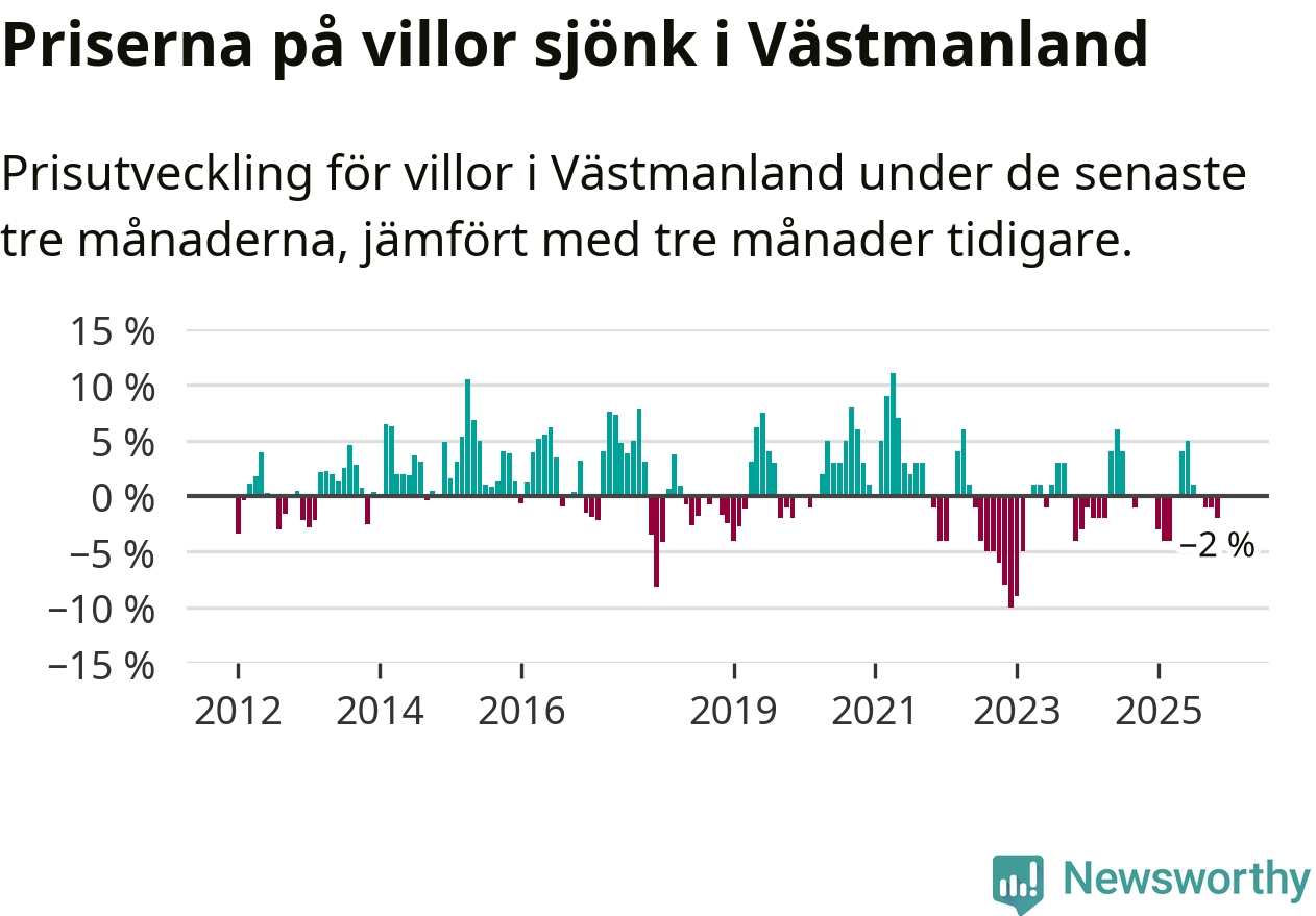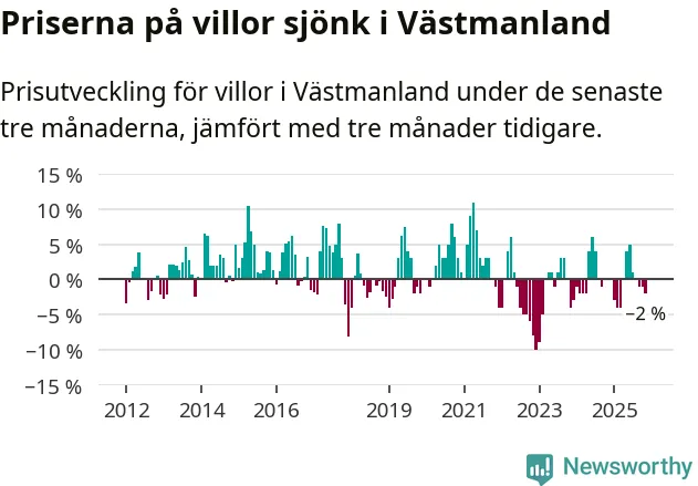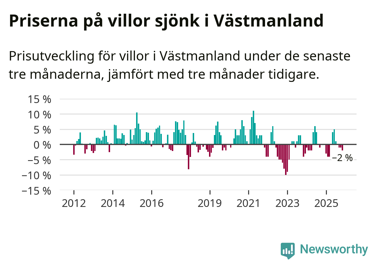 Villapriserna har gått ner i Västmanlands län. Medelpriset på försäljningarna under de senaste tre månaderna visar på en nedgång med 2 procent.