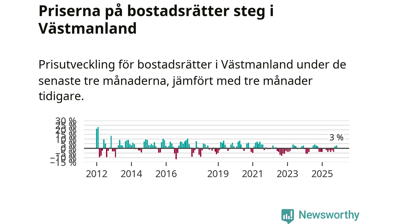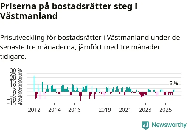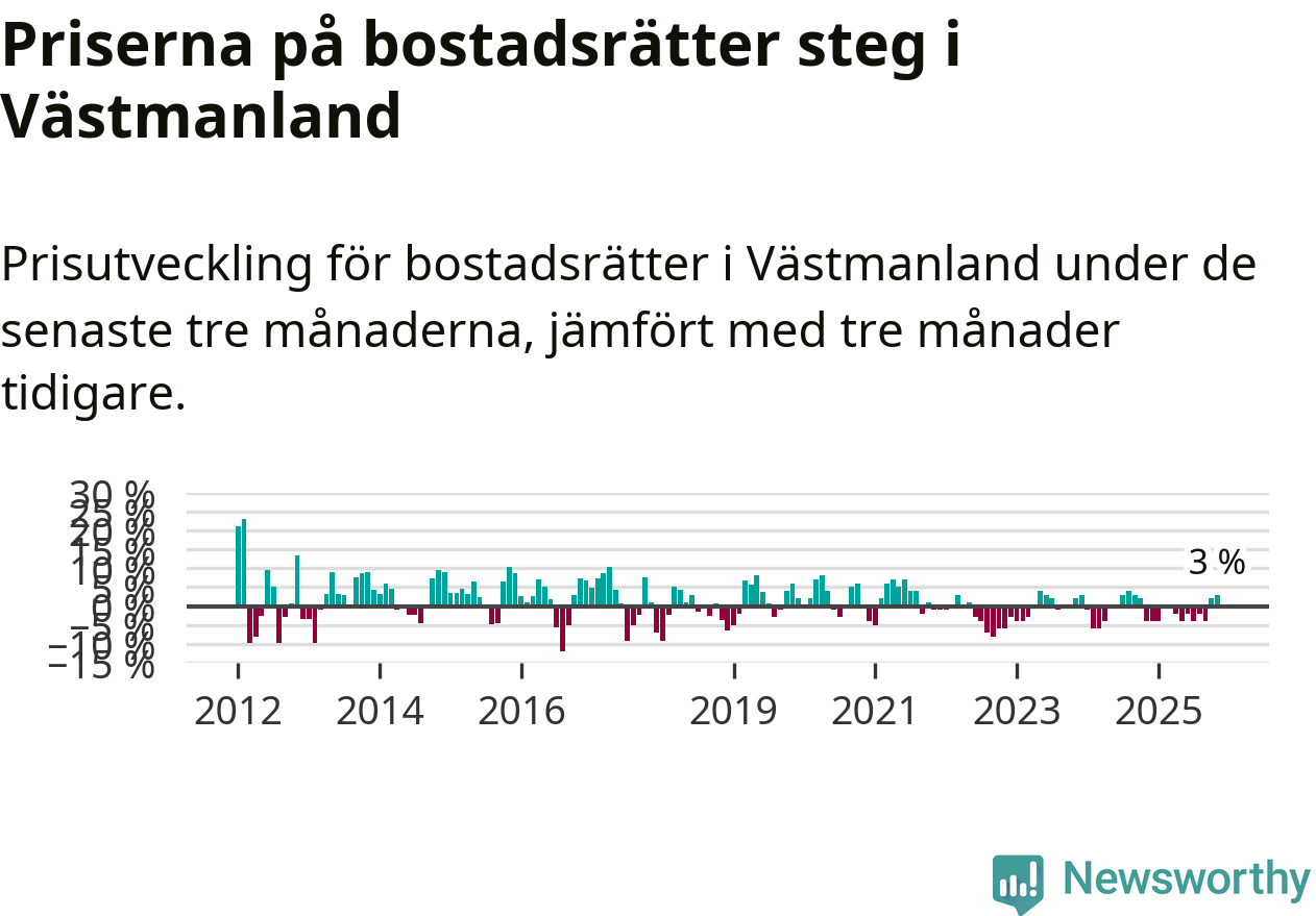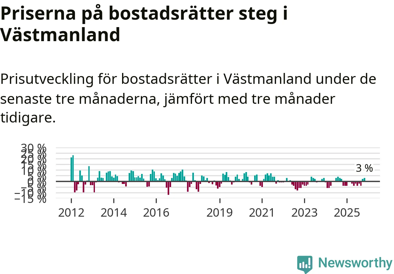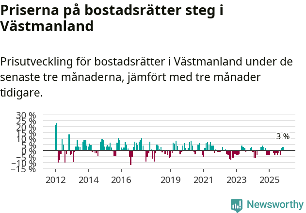 I Västmanlands län som helhet går priserna på bostadsrätter upp med 3 procent. Även i hela Sverige ökar priserna på bostadsrätter. I hela riket noterades en prisuppgång på 3 procent.