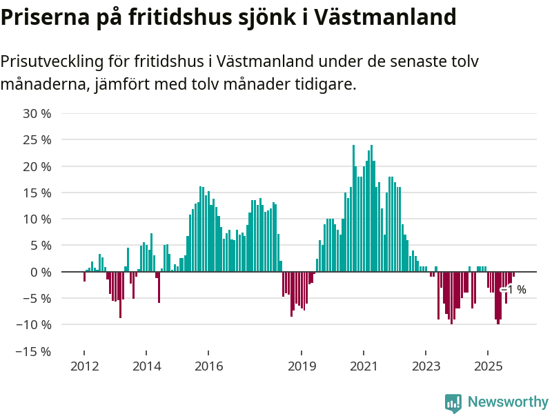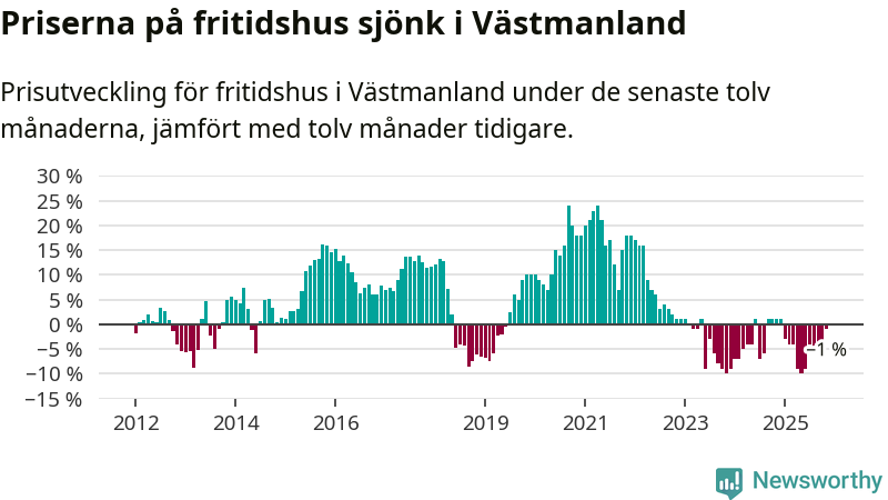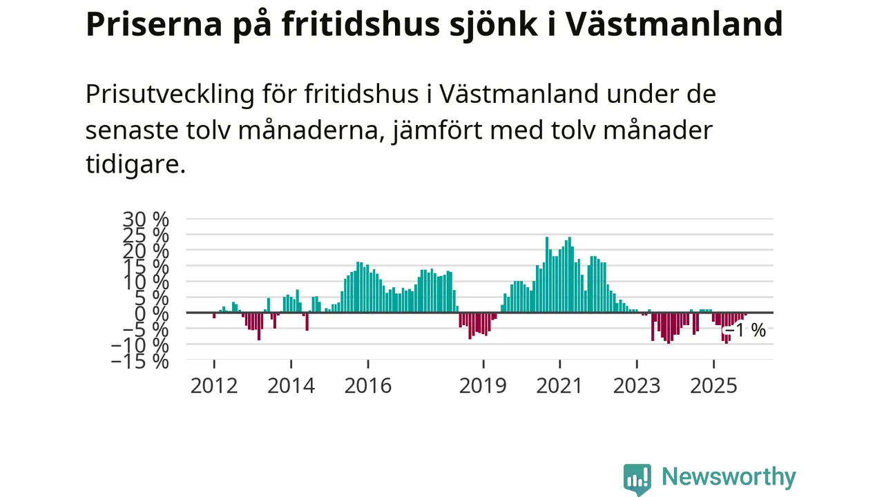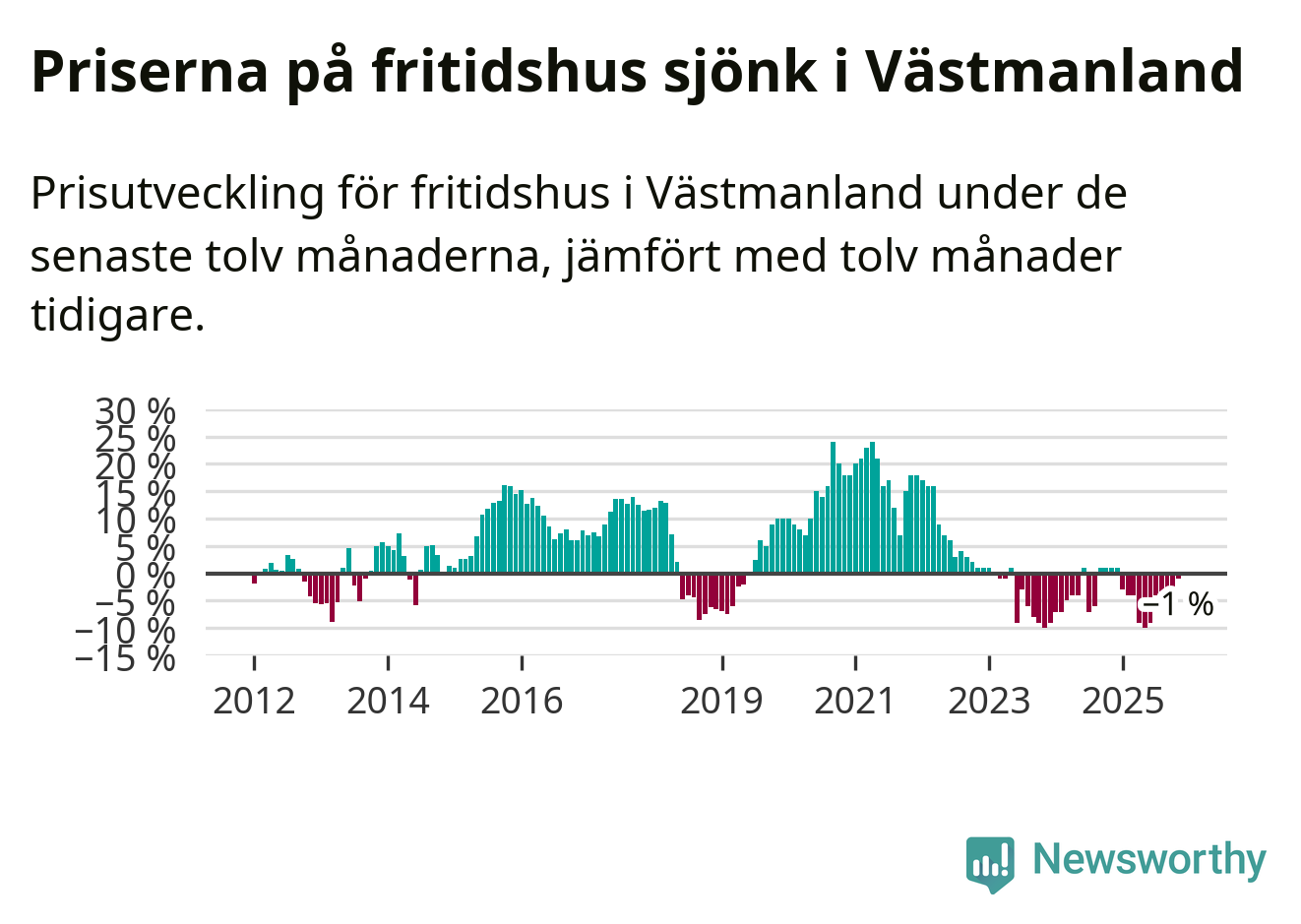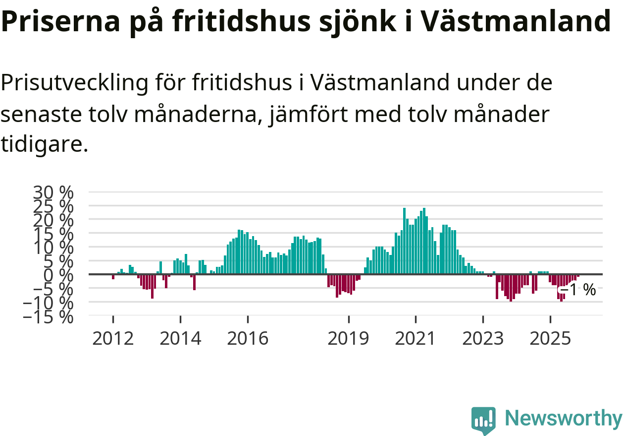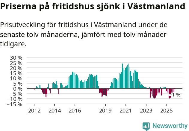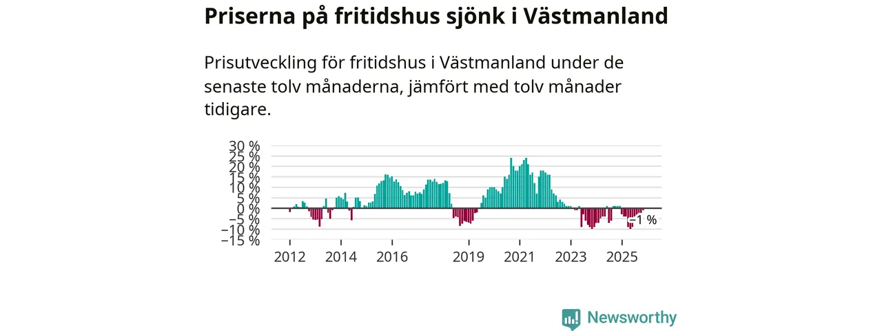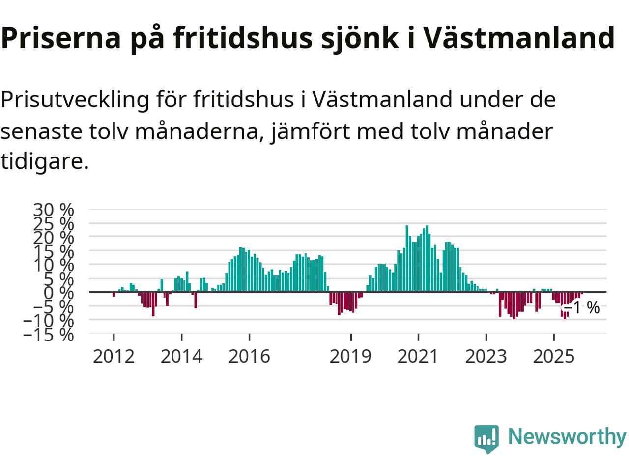 Priserna på fritidshus har gått ner i Västmanlands län. Medelpriset på försäljningarna under de senaste tolv månaderna visar på en nedgång med 1 procent.