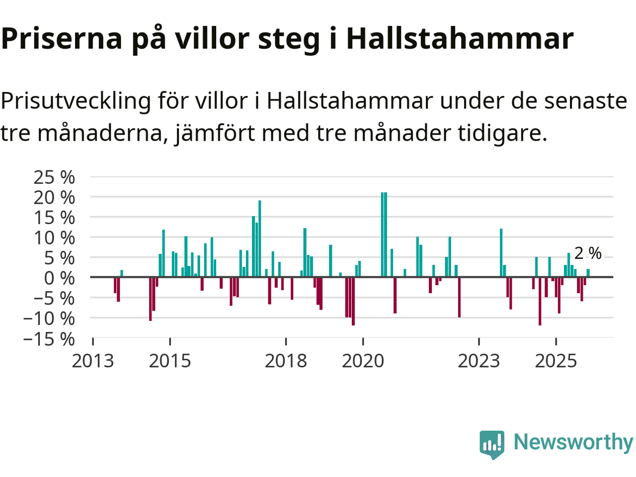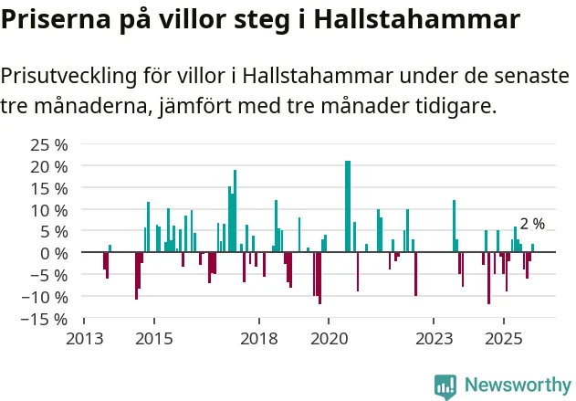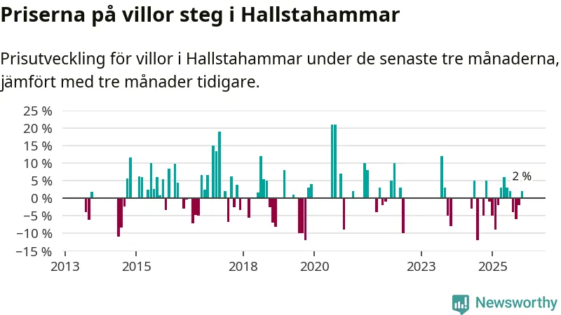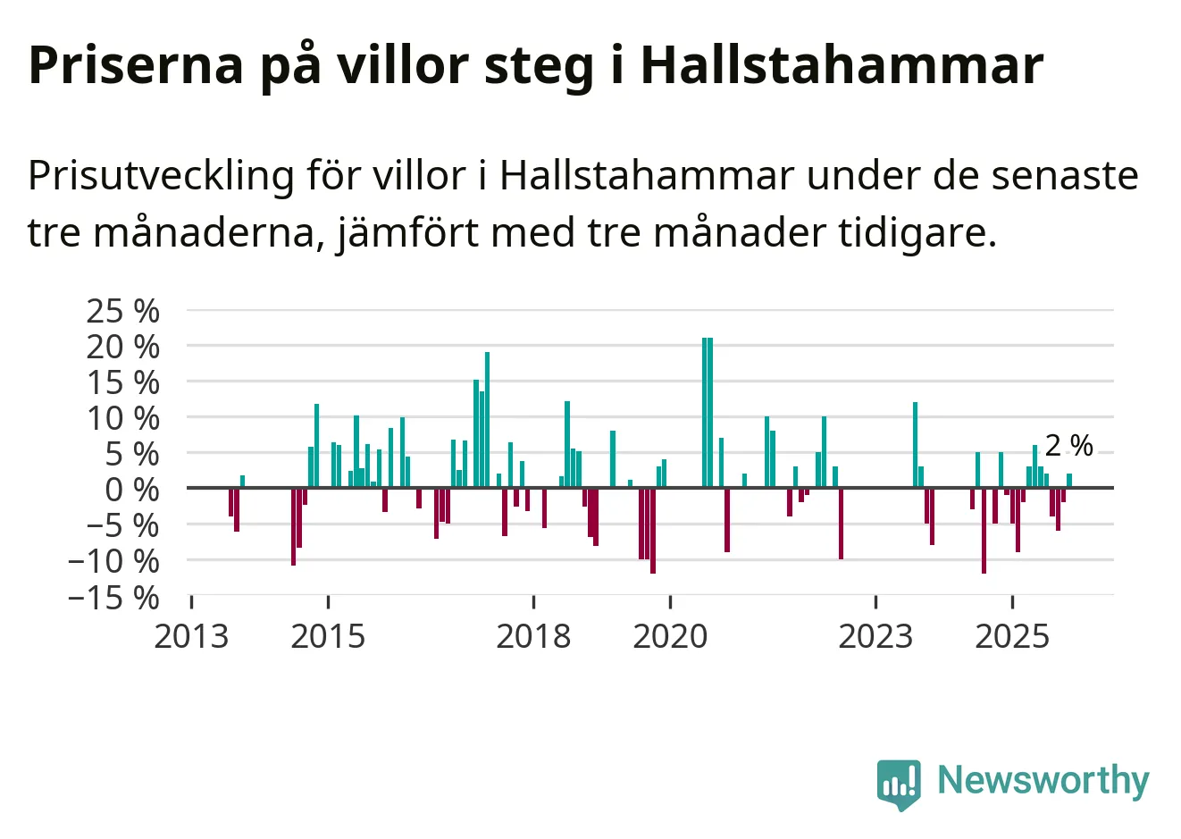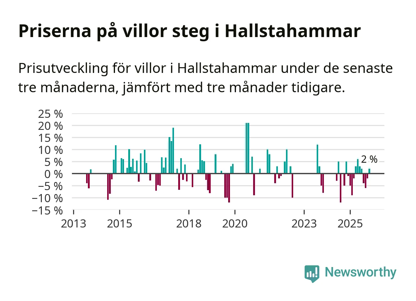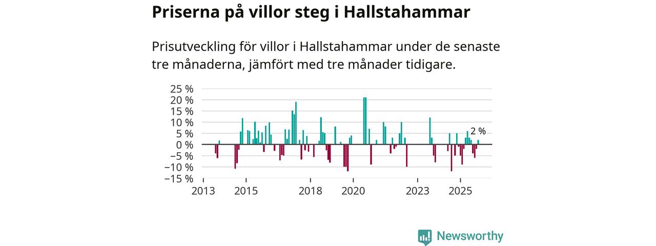 Statistiken visar även på en prisuppgång i Hallstahammars kommun. Medelpriset på försäljningarna av villor i kommunen var 2 procent högre än för tre månader sedan. I hela Västmanland däremot sjunker villapriserna. I hela länet noterades en prisnedgång på 2 procent.