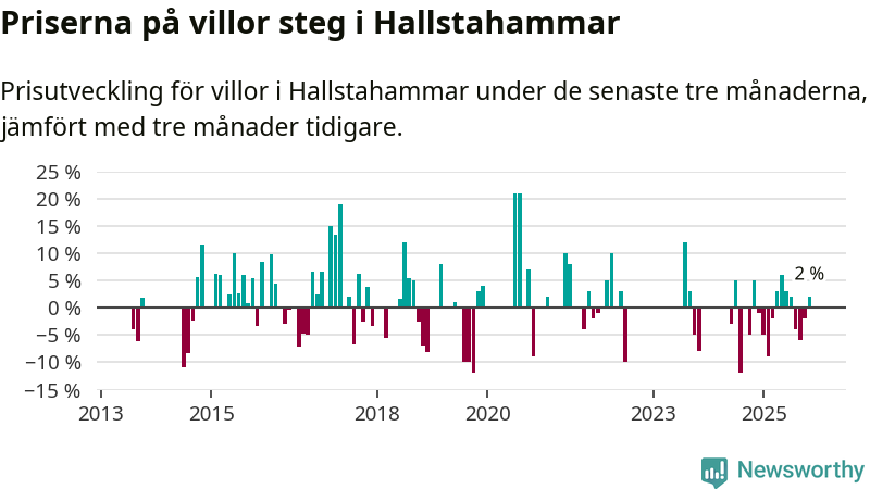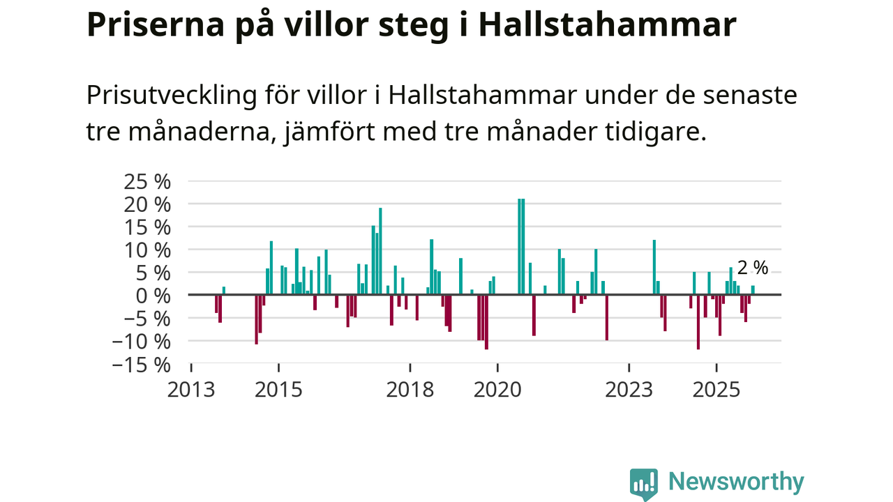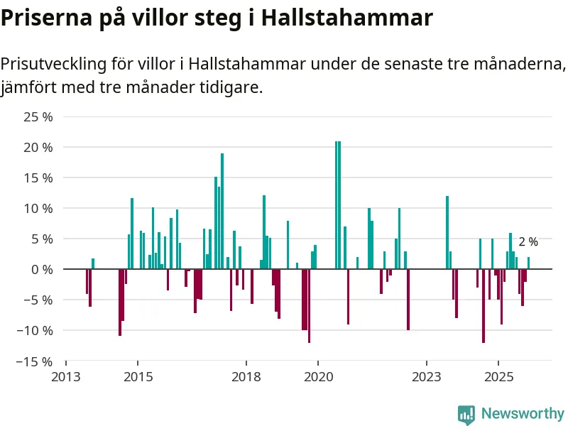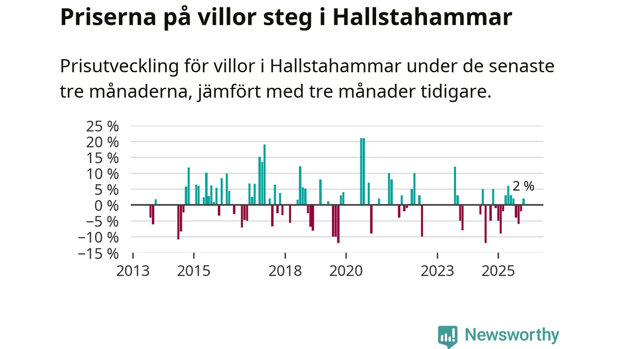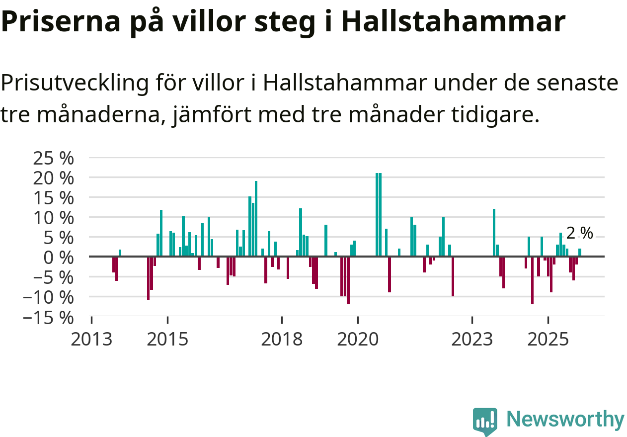 Statistiken visar även på en prisuppgång i Hallstahammars kommun. Medelpriset på försäljningarna av villor i kommunen var 2 procent högre än för tre månader sedan. I hela Västmanland däremot sjunker villapriserna. I hela länet noterades en prisnedgång på 2 procent.