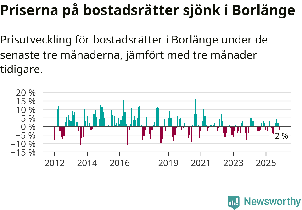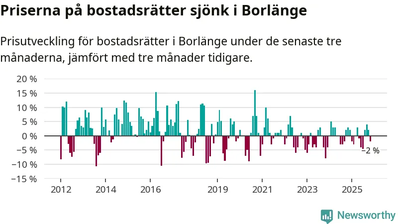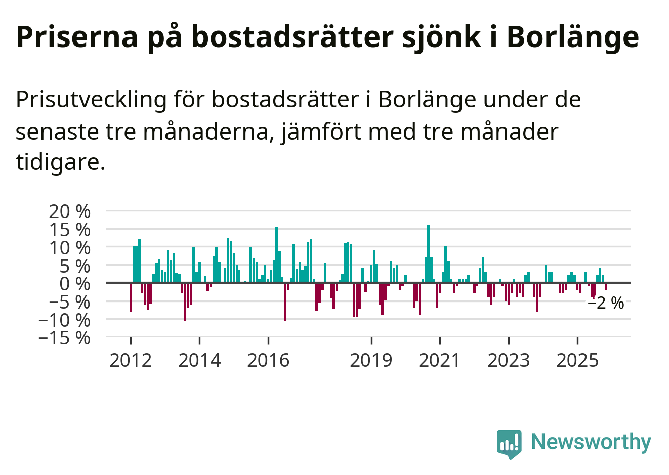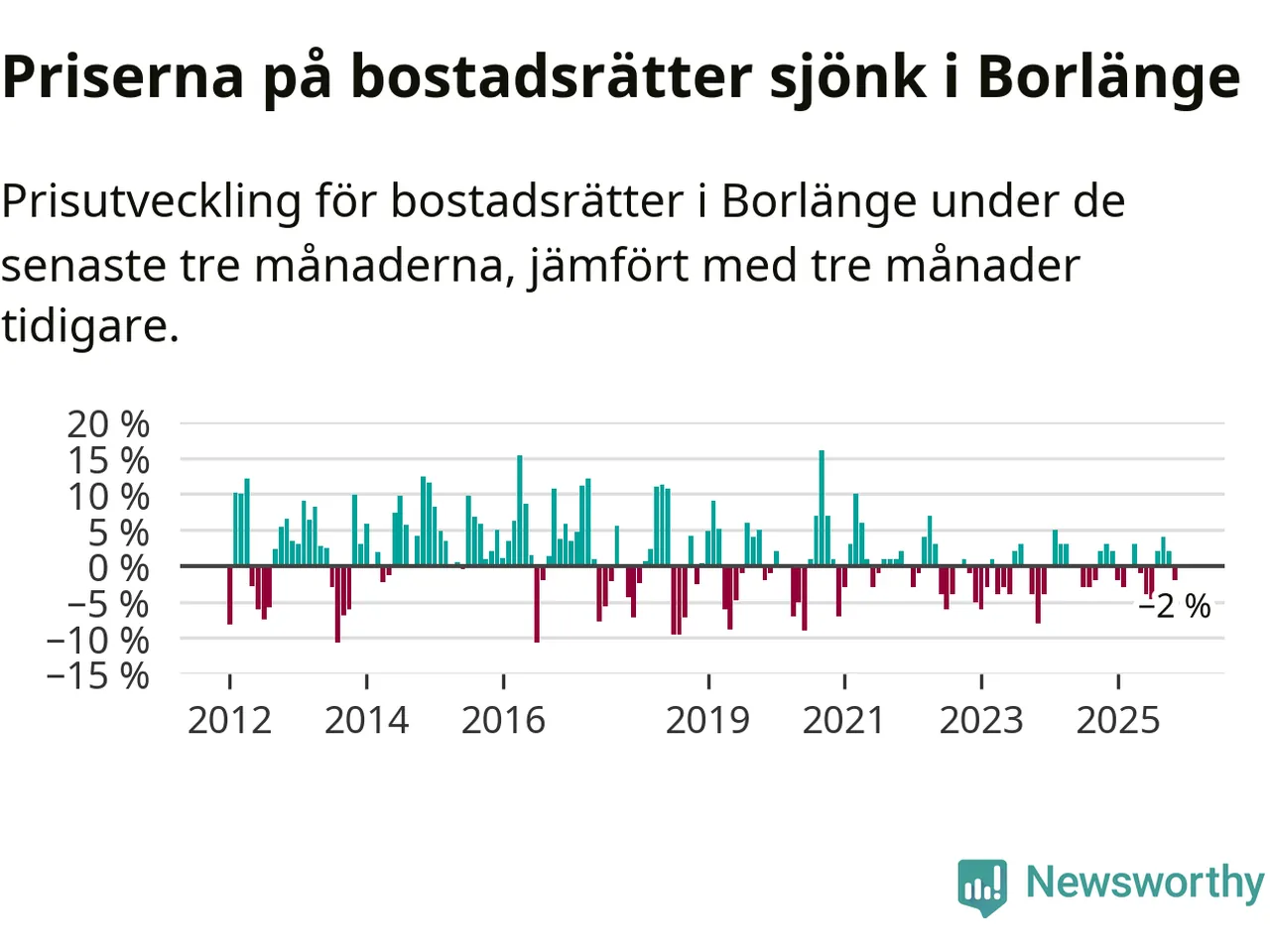 Statistiken visar även på en prisnedgång i Borlänge kommun. Medelpriset på försäljningarna av bostadsrätter i kommunen var 2 procent lägre än för tre månader sedan. I hela Dalarna däremot ökar priserna på bostadsrätter. I hela länet noterades en prisuppgång på 21 procent.