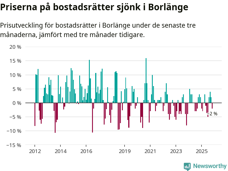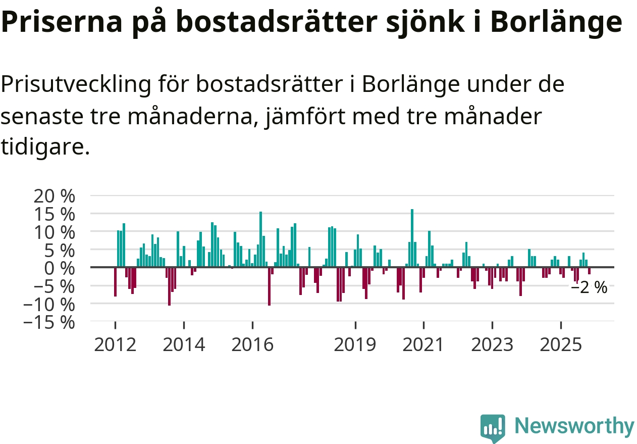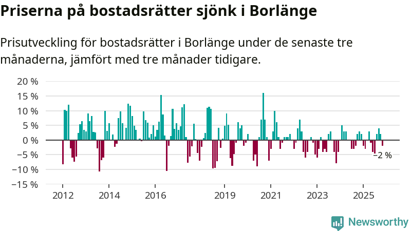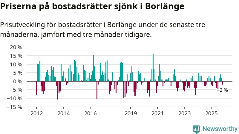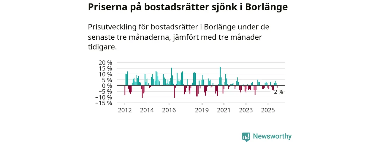 Statistiken visar även på en prisnedgång i Borlänge kommun. Medelpriset på försäljningarna av bostadsrätter i kommunen var 2 procent lägre än för tre månader sedan. I hela Dalarna däremot ökar priserna på bostadsrätter. I hela länet noterades en prisuppgång på 21 procent.