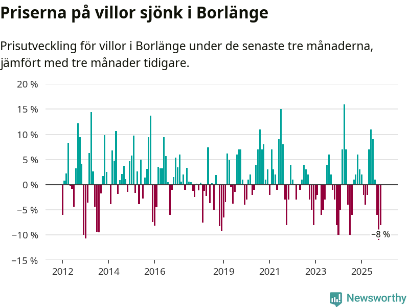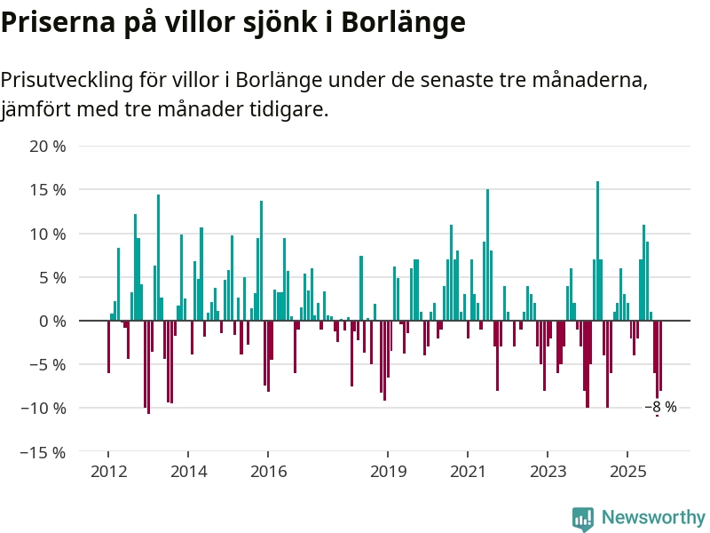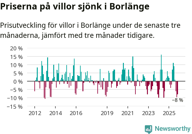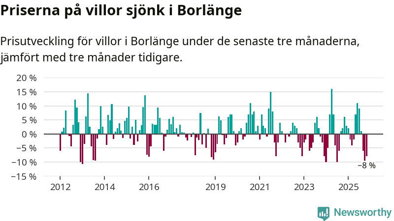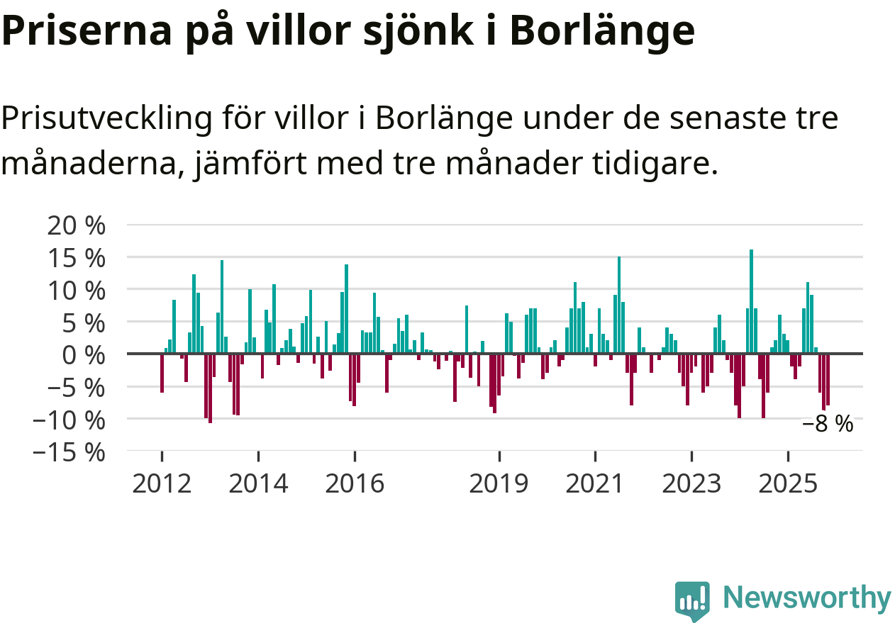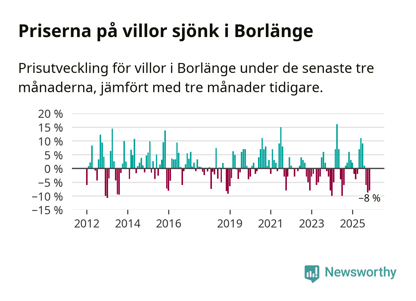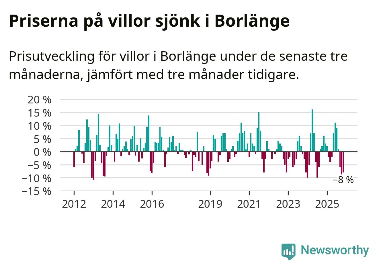 Statistiken visar även på en stor prisnedgång i Borlänge kommun. Medelpriset på försäljningarna av villor i kommunen var 8 procent lägre än för tre månader sedan. Även i hela Dalarna sjunker villapriserna. I hela länet noterades en prisnedgång på 4 procent.