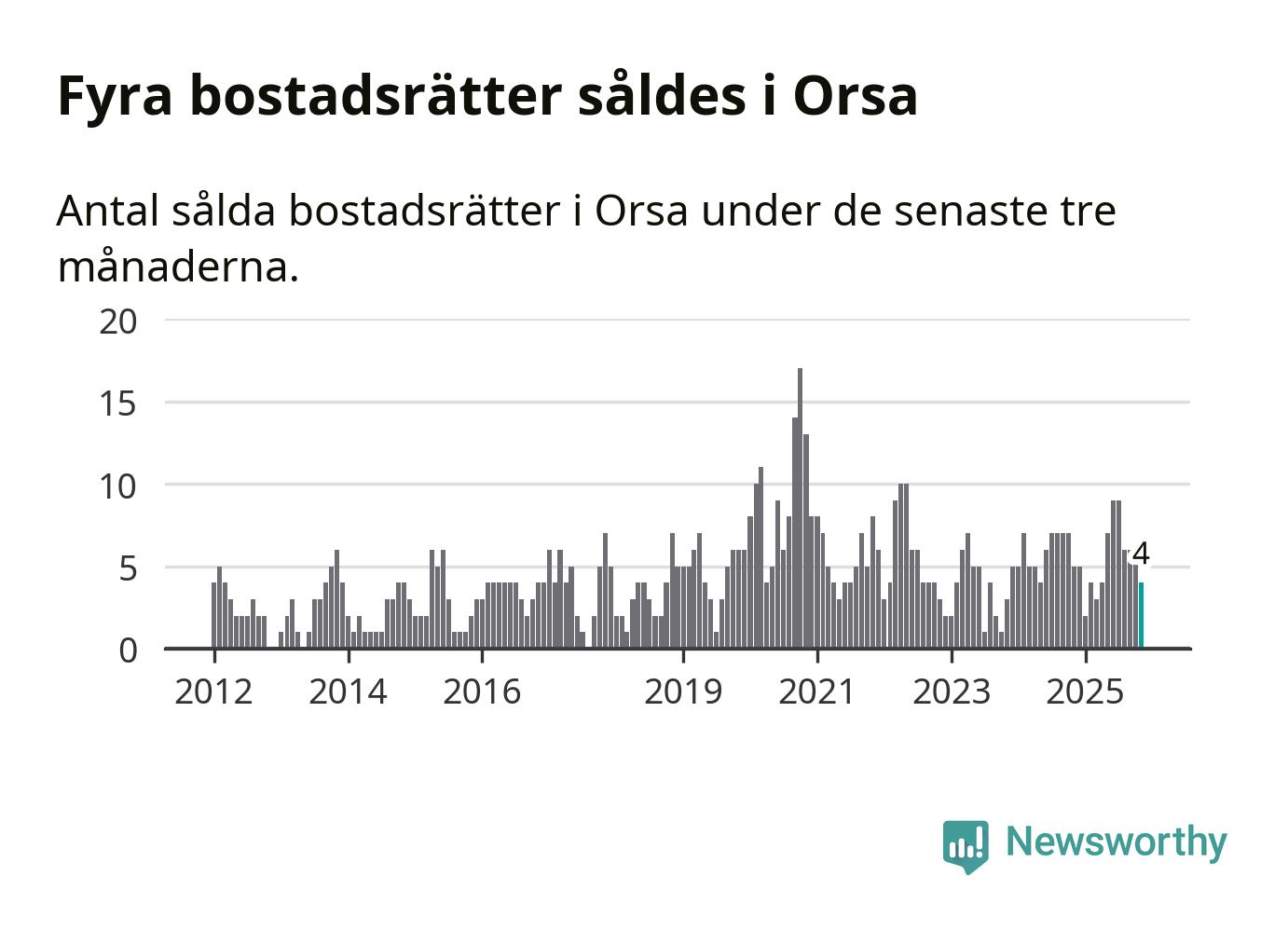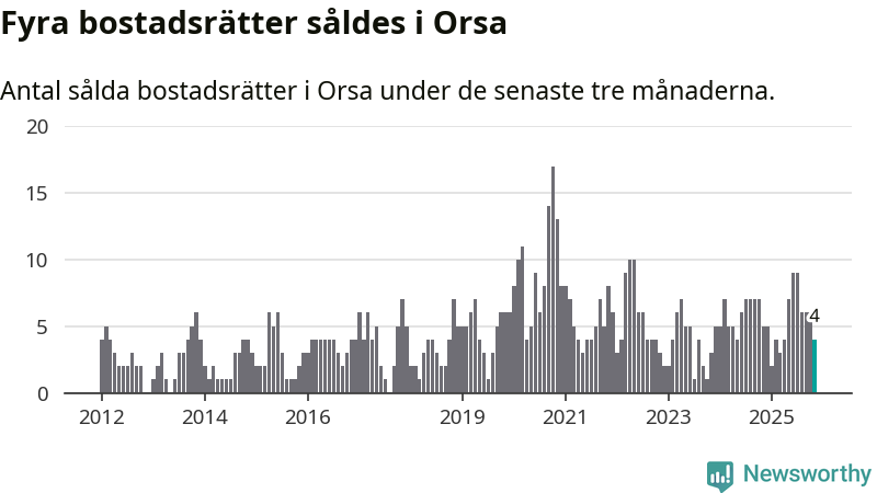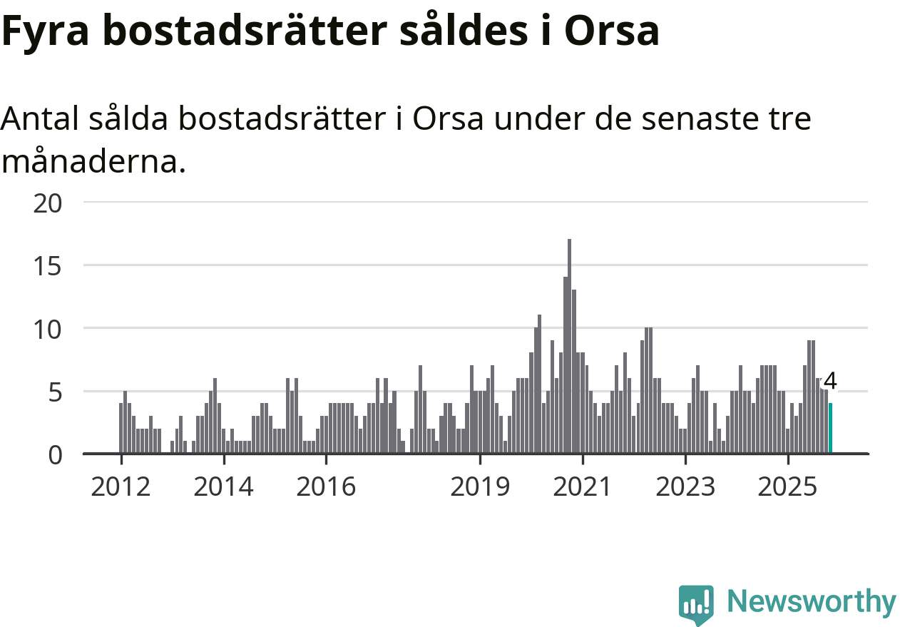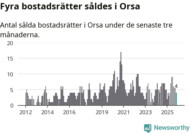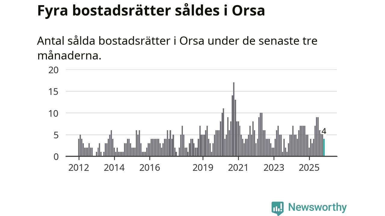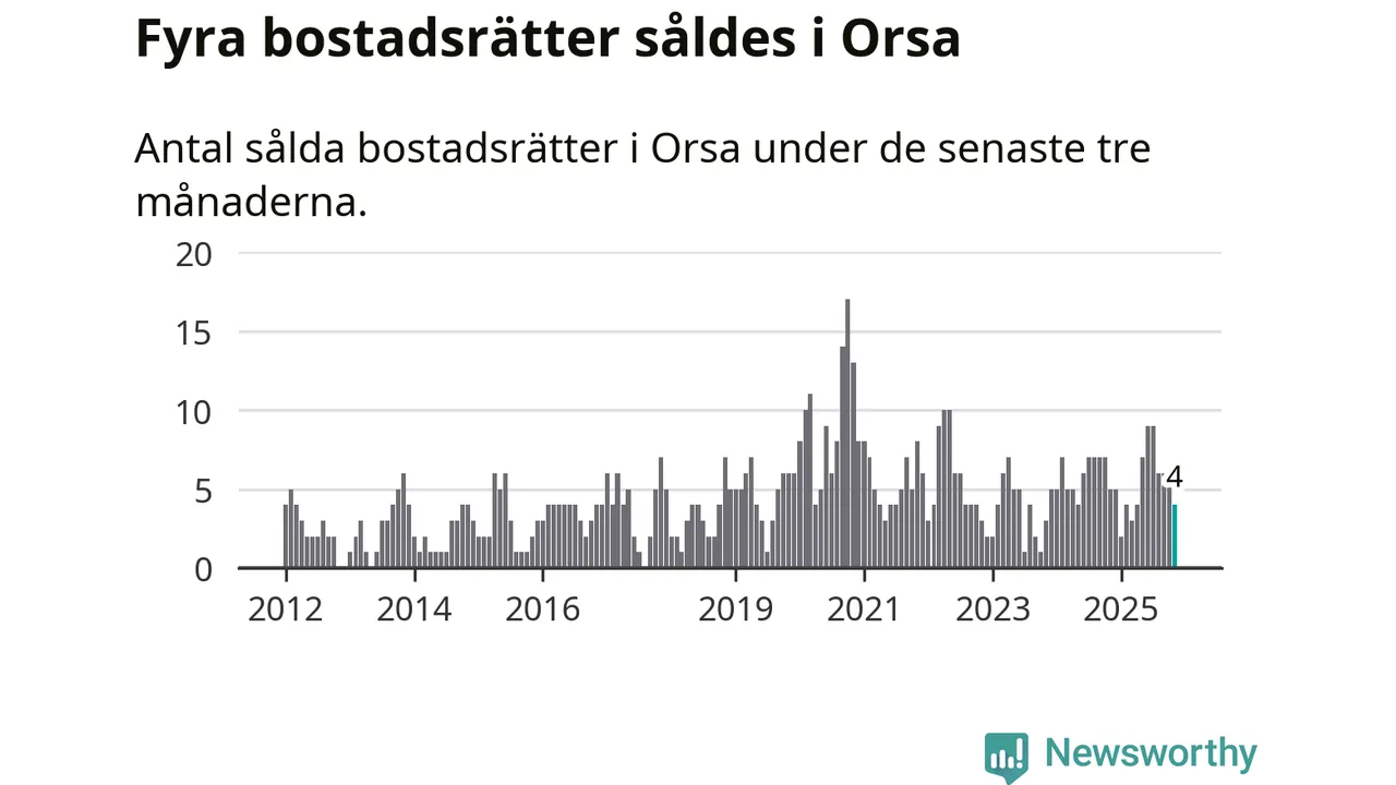 Mellan september och november gjordes sammanlagt fyra affärer med bostadsrätter i Orsa kommun. Det kan jämföras med fem vid motsvarande tid i fjol.