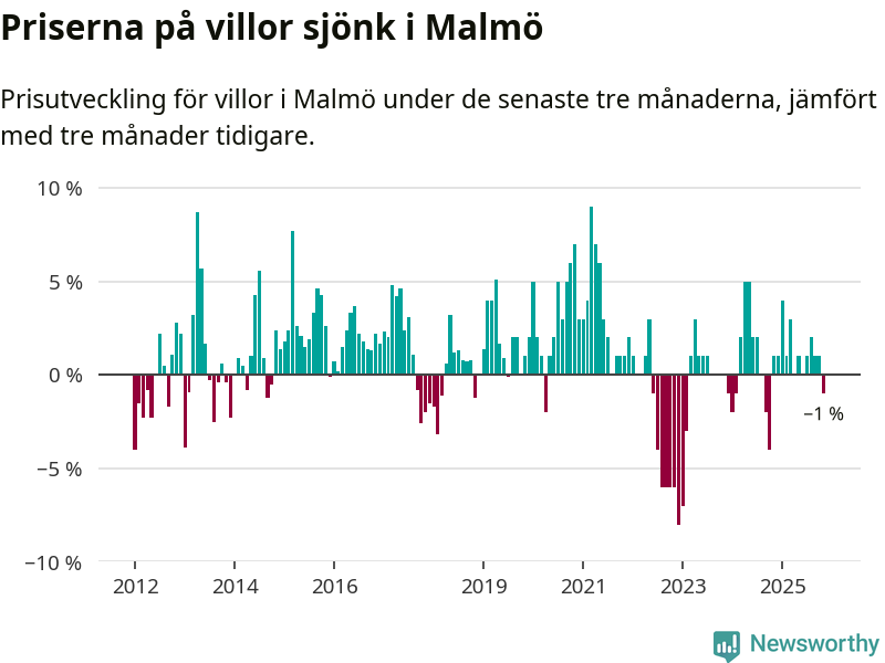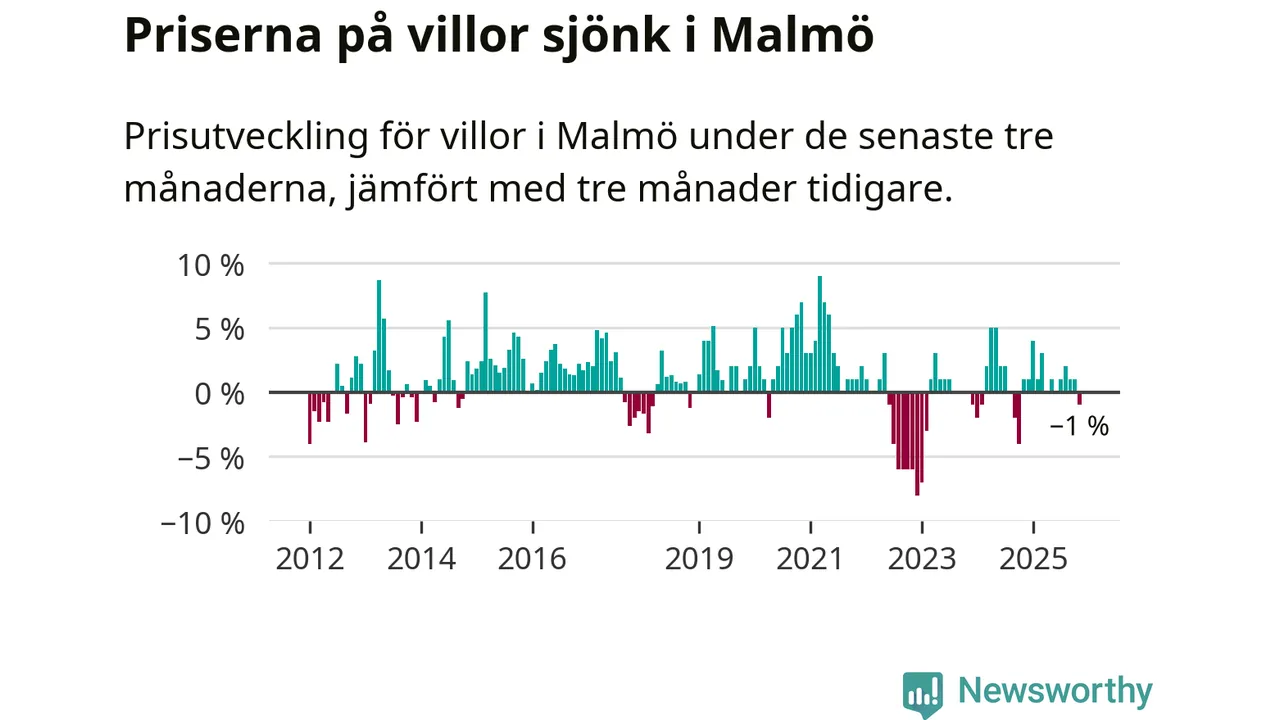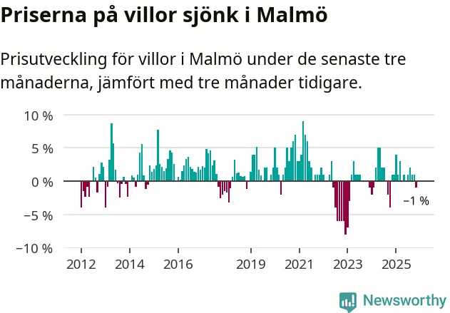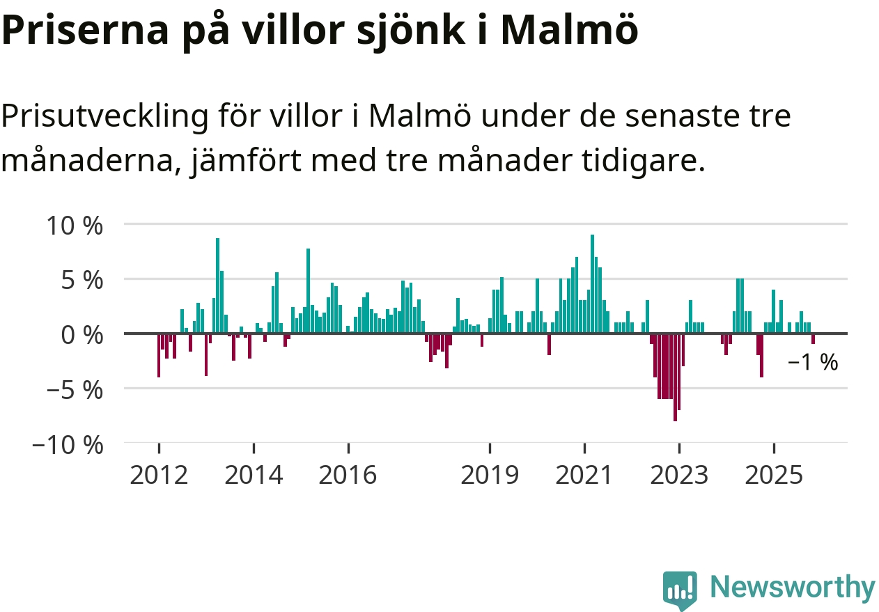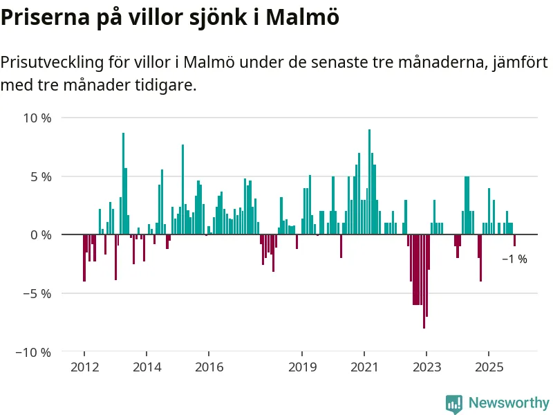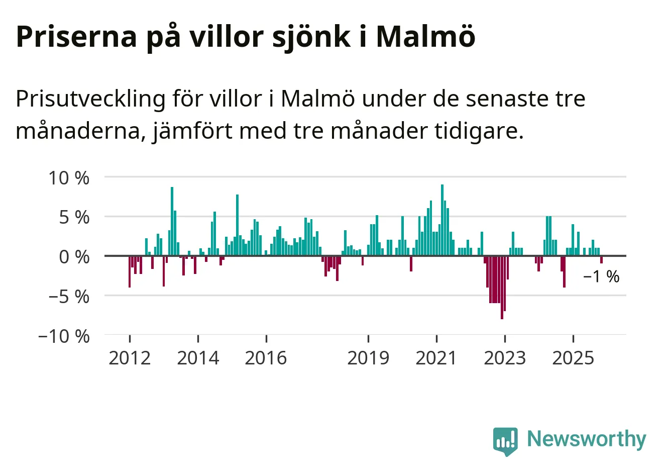 Villapriserna har gått ner i Malmö kommun. Medelpriset på försäljningarna under de senaste tre månaderna visar på en nedgång med 1 procent.